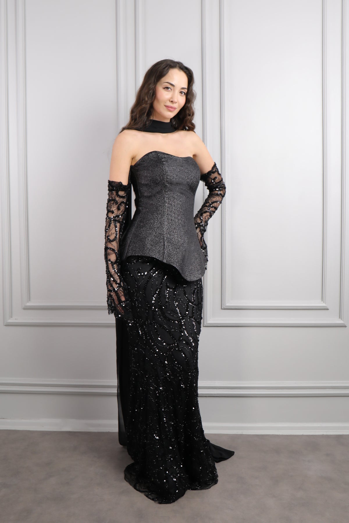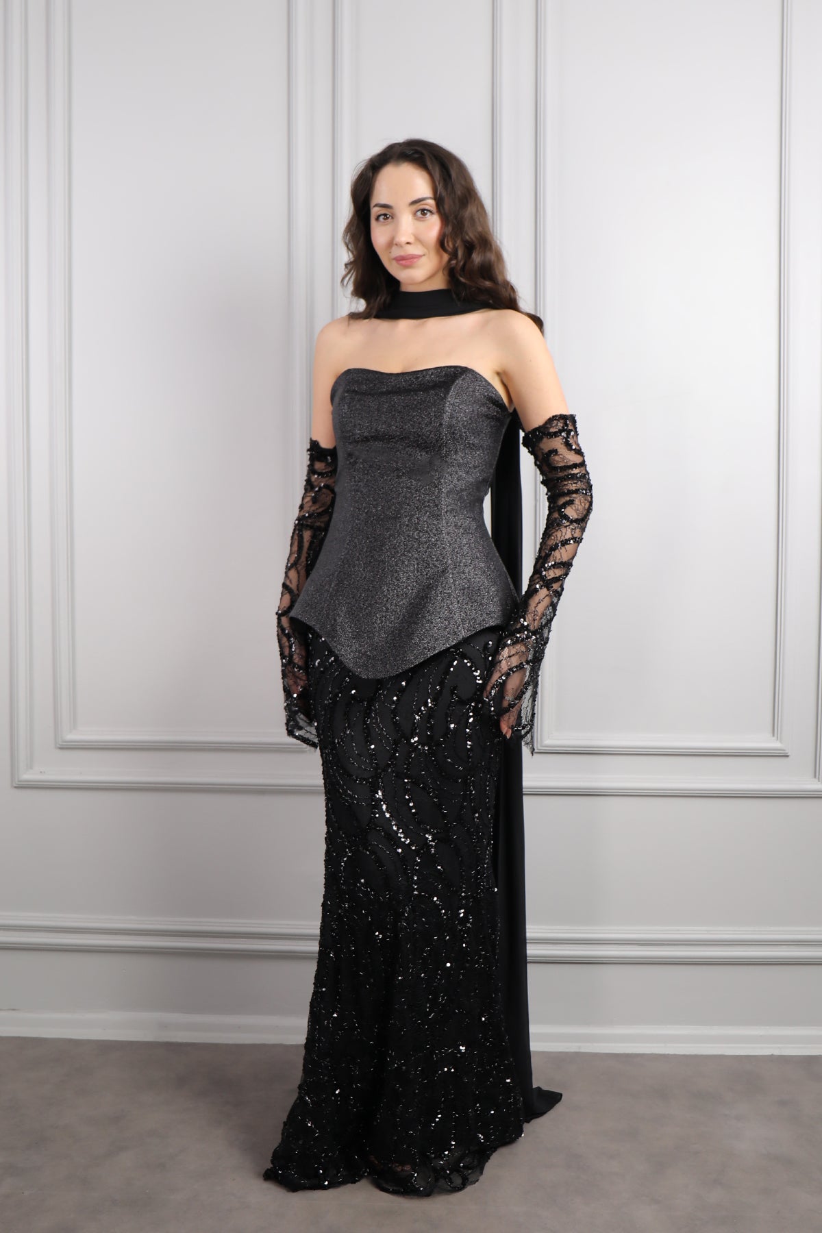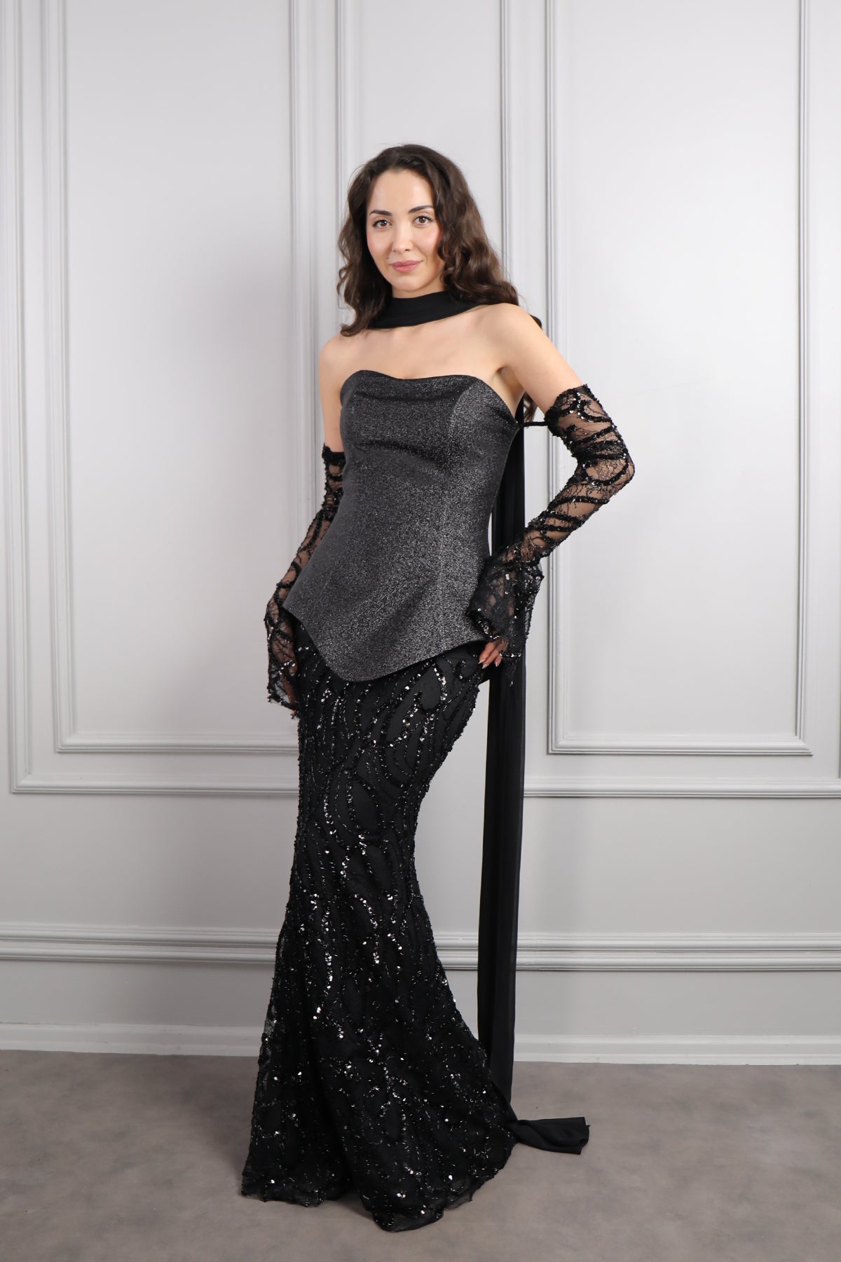 Straplez Asimetrik Kesim Şifon Fular Detaylı Payetli Balık Model Abiye Siyah