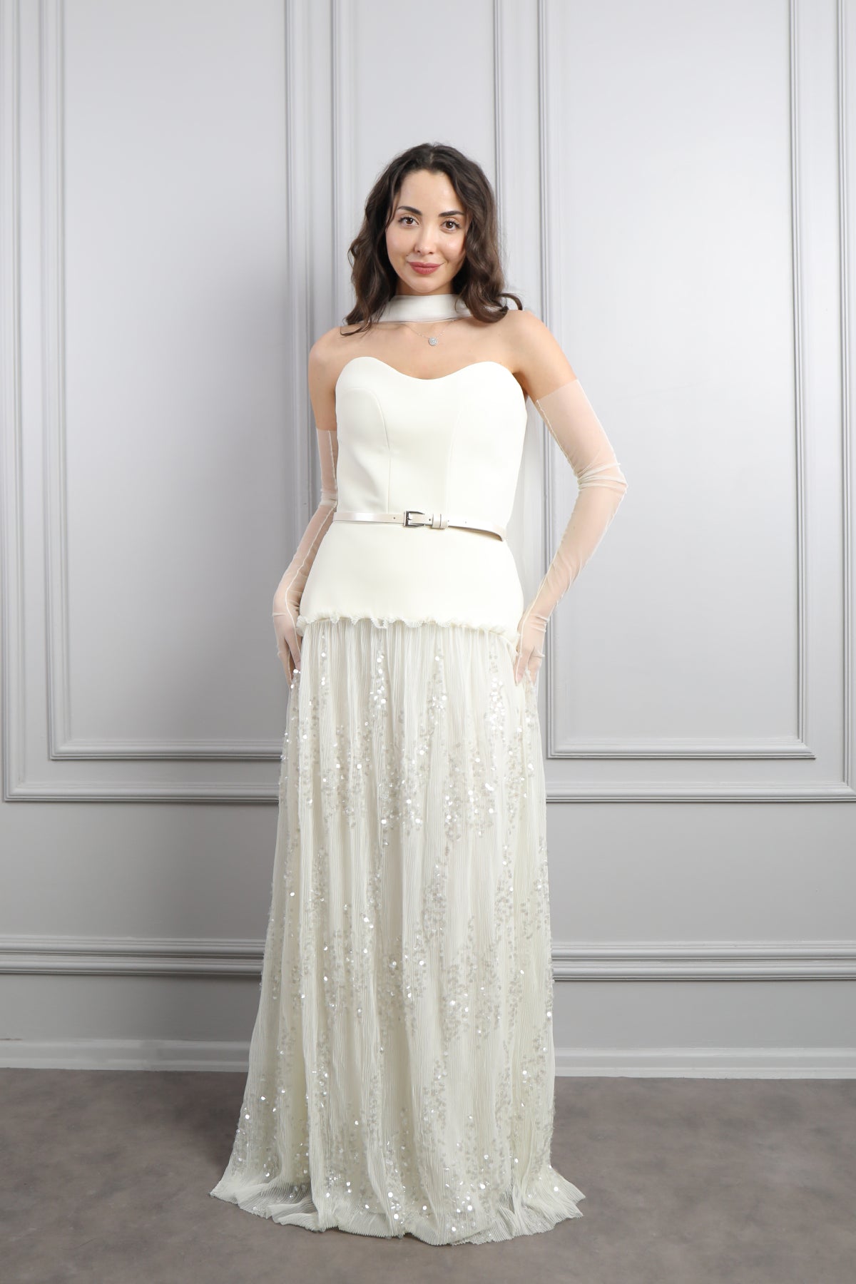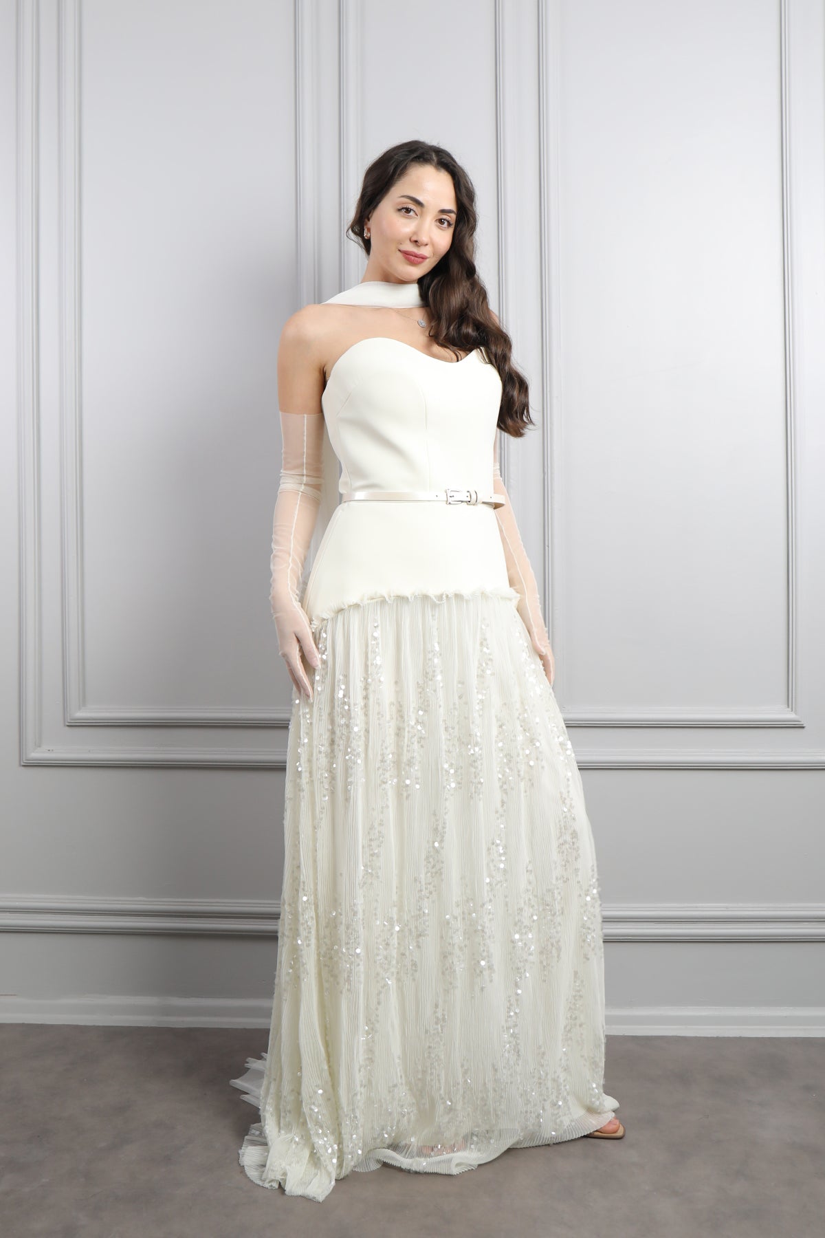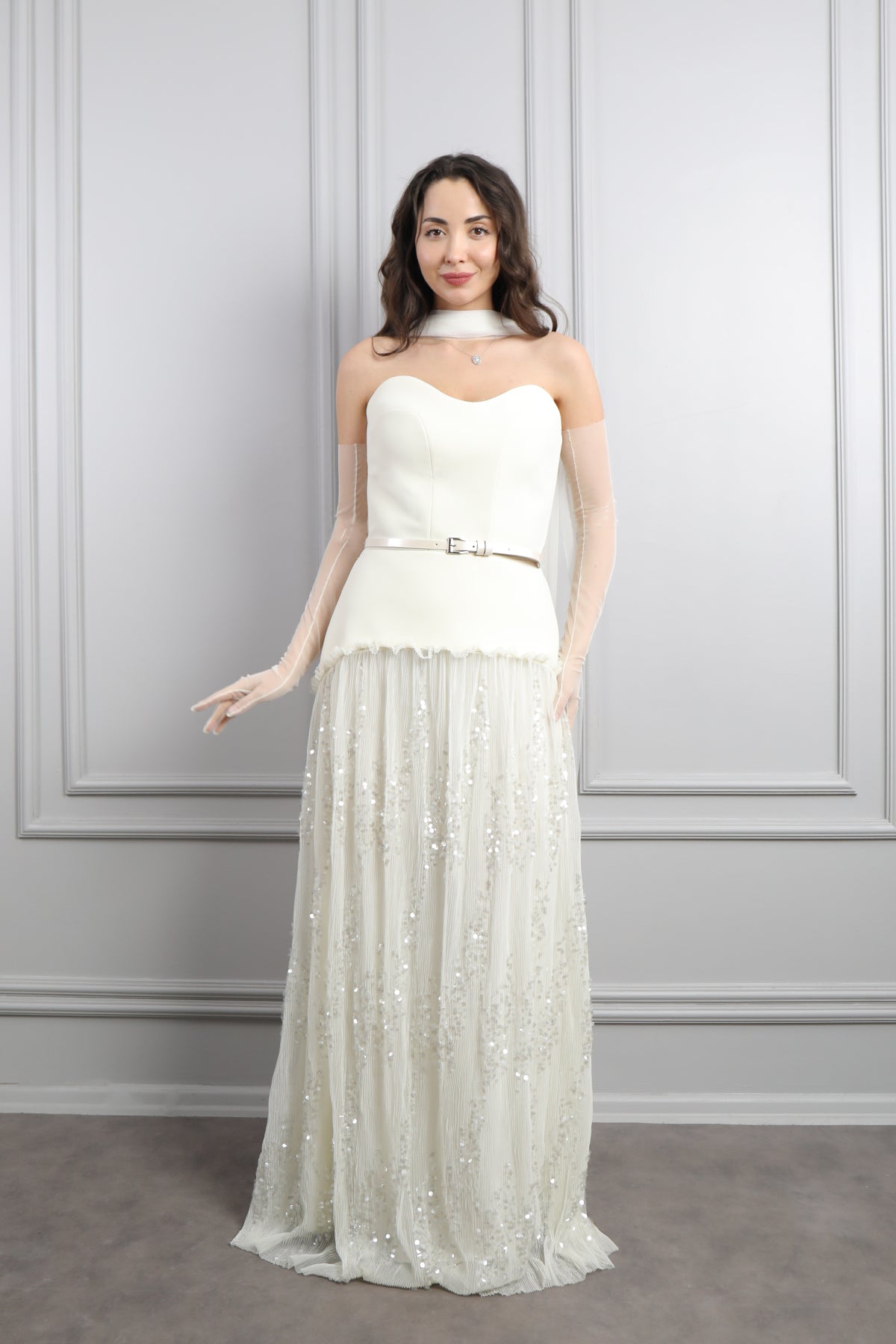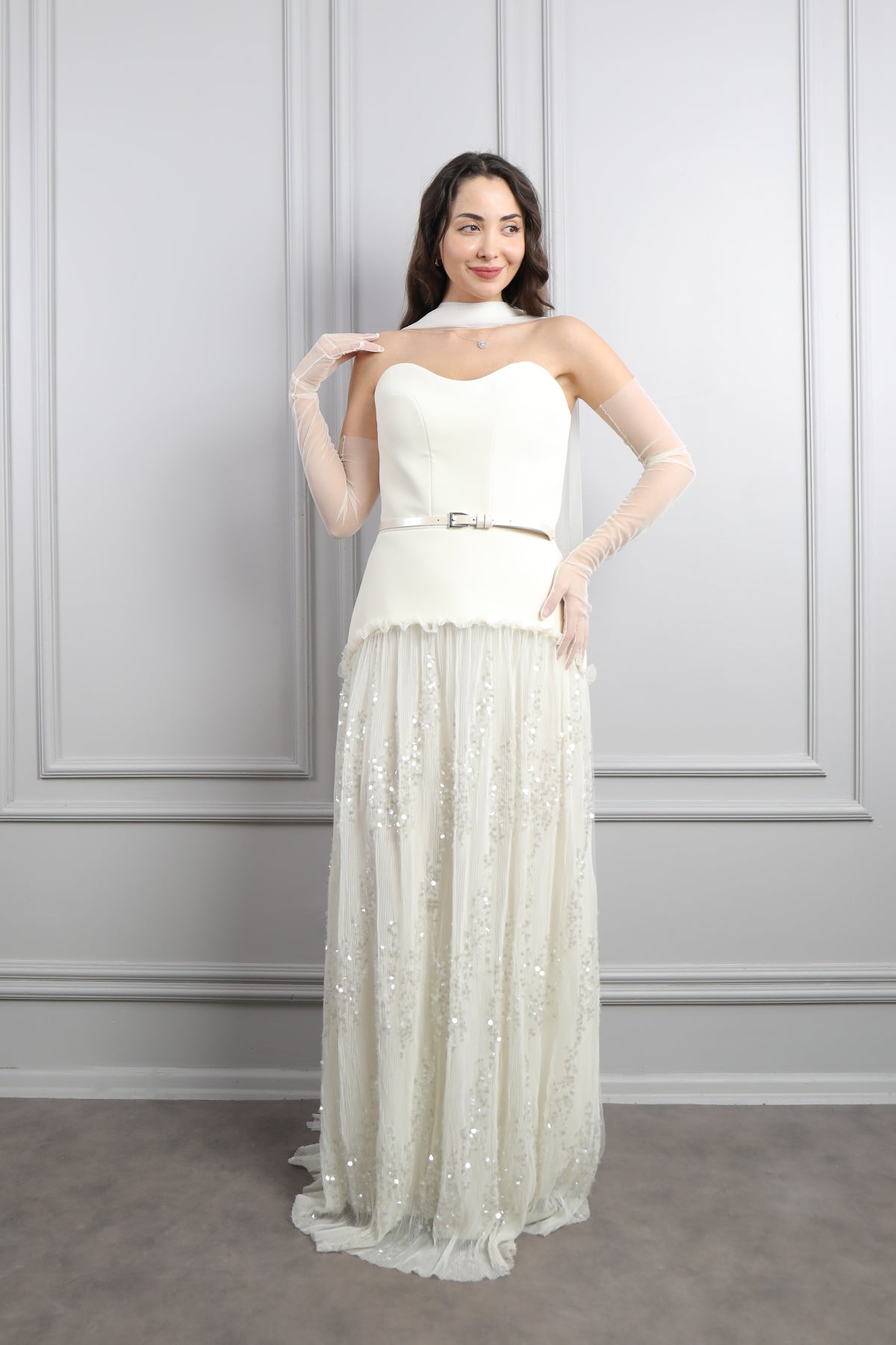 Straplez Beli Kemerli Eldiven Aksesuar Detaylı Eteği Tüllü Abiye Kemik