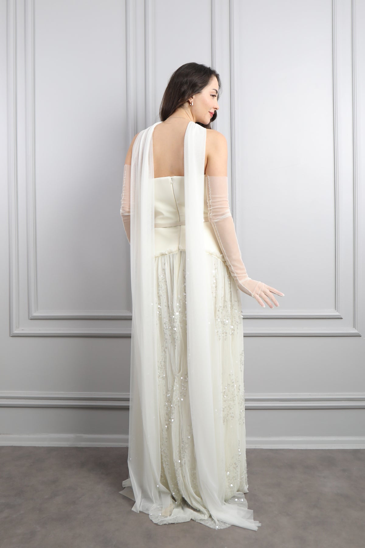 Modelin üzerindeki abiye 38 bedendir. Ürün tam kalıptır, kendi bedeninizi almanızı öneririz.