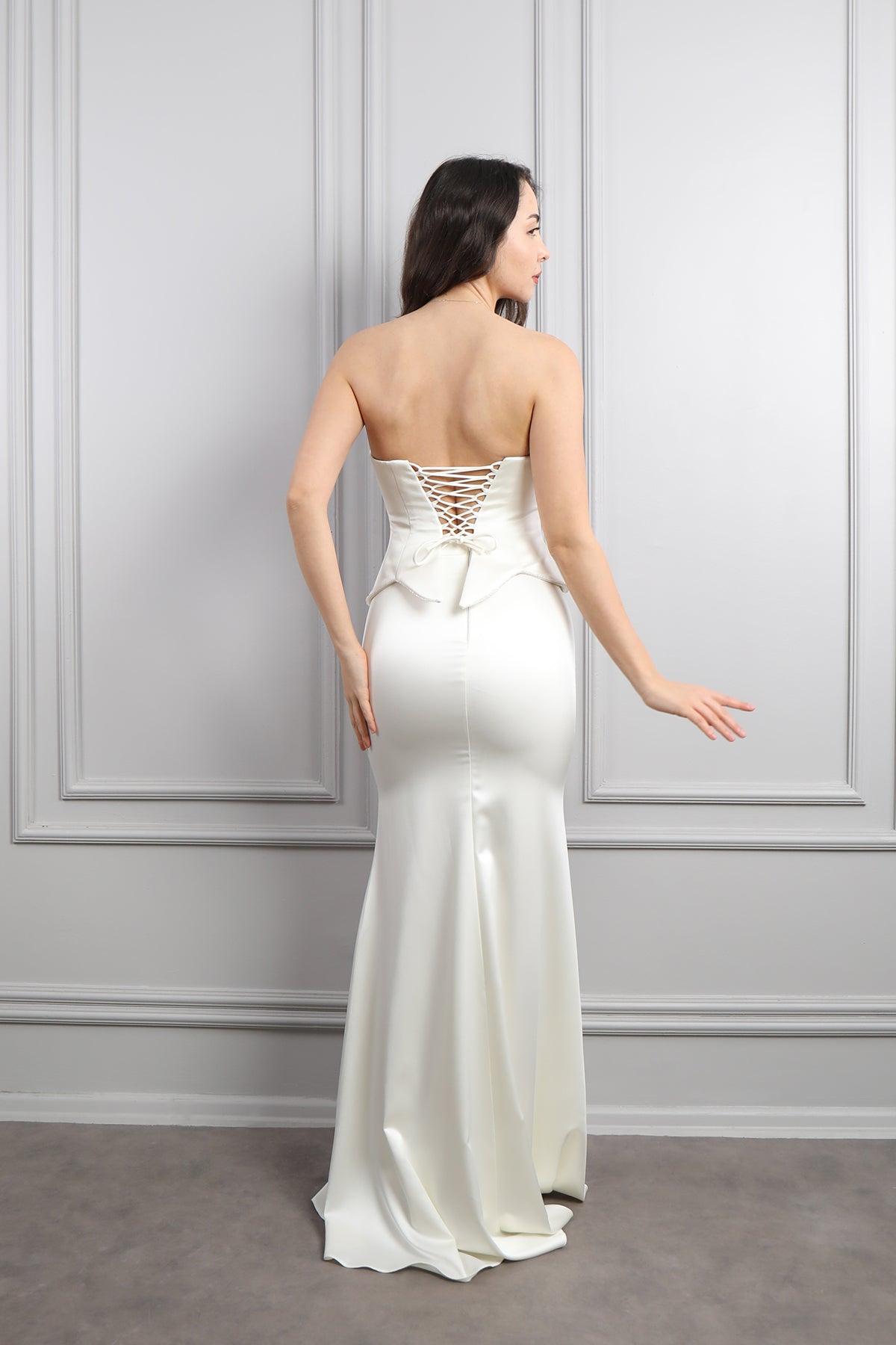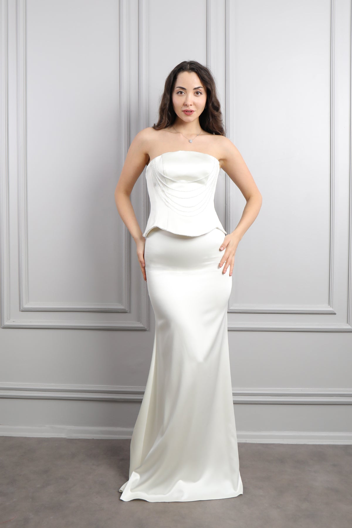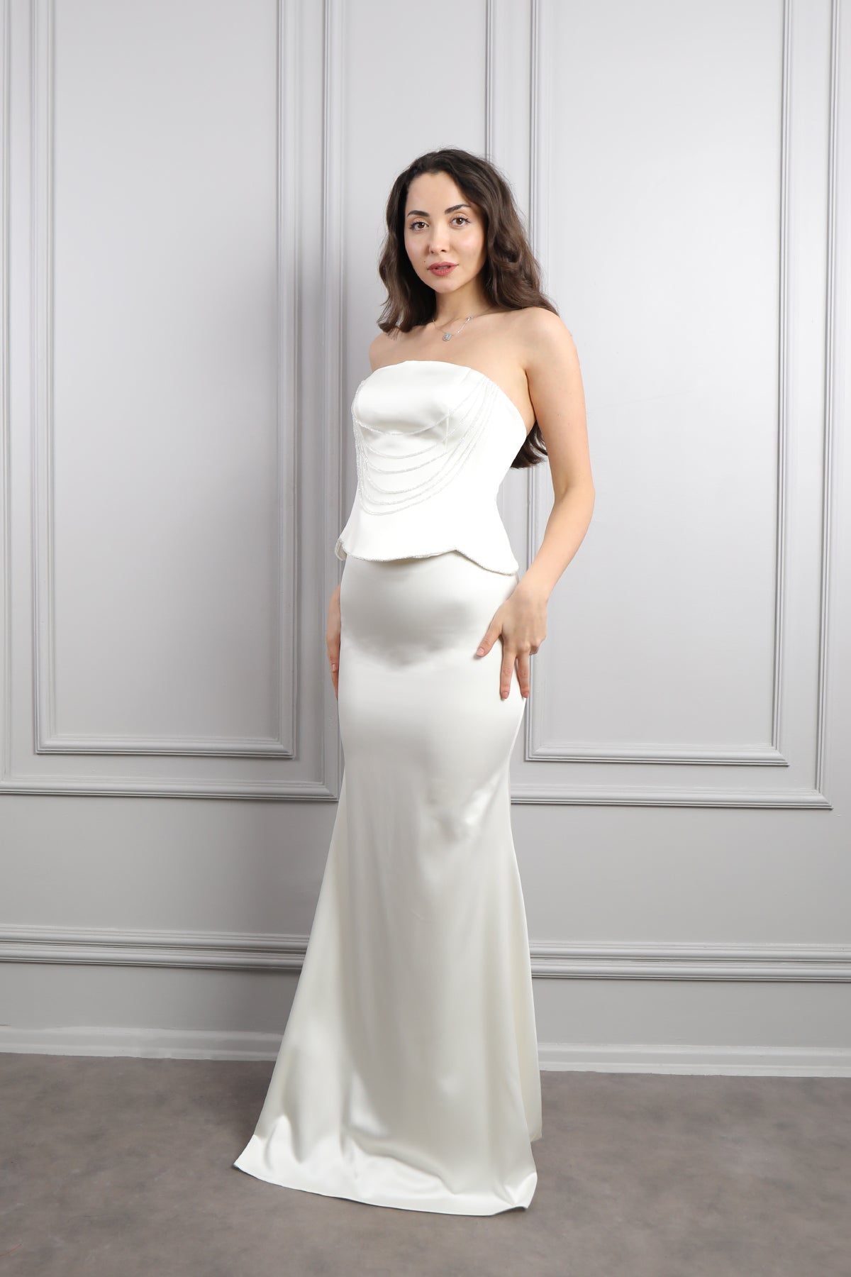Straplez Boncuk Detaylı Saten Etek Takım Kemik