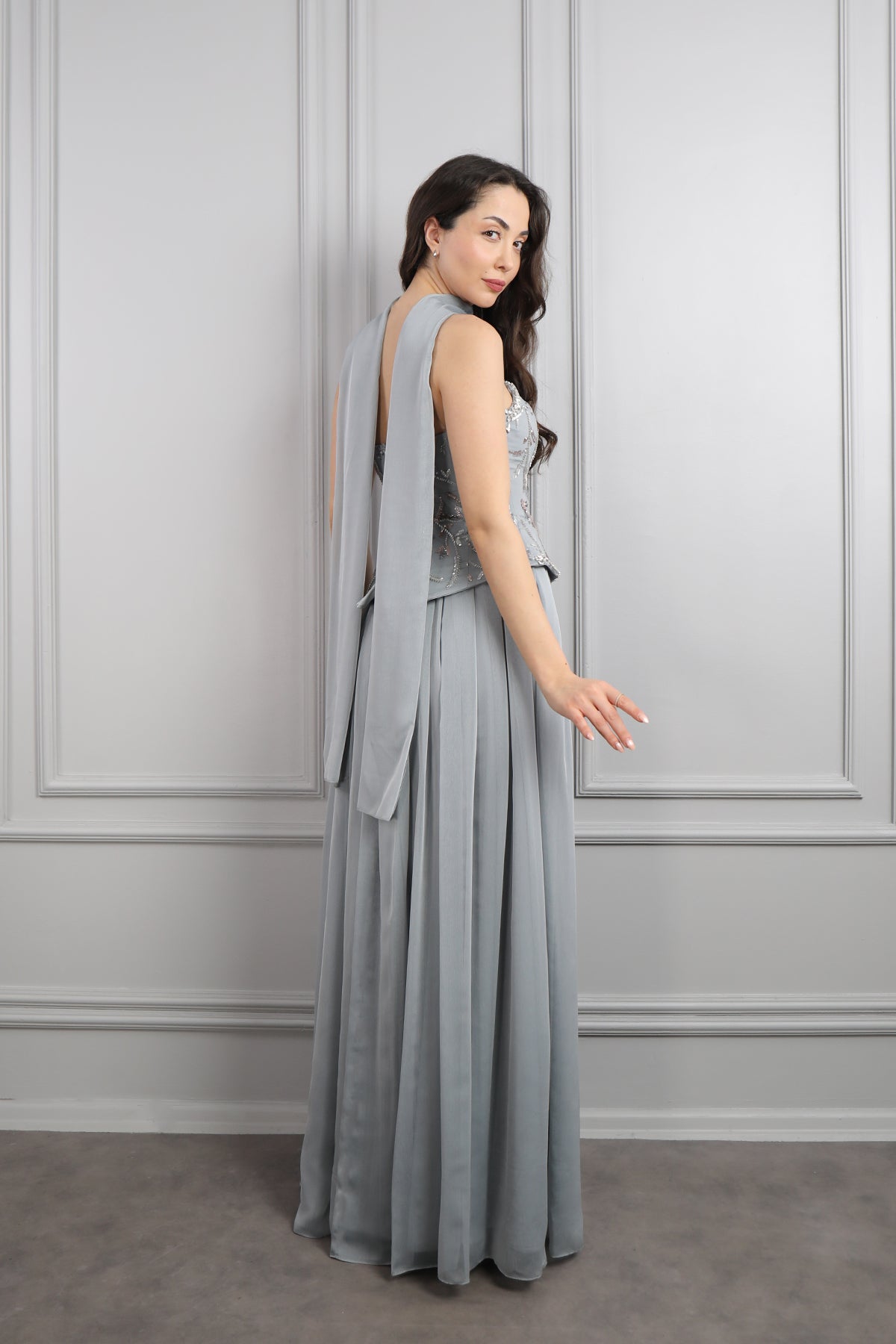 Straplez Boncuk İşlemeli Fular Detaylı Şifon Abiye Gri