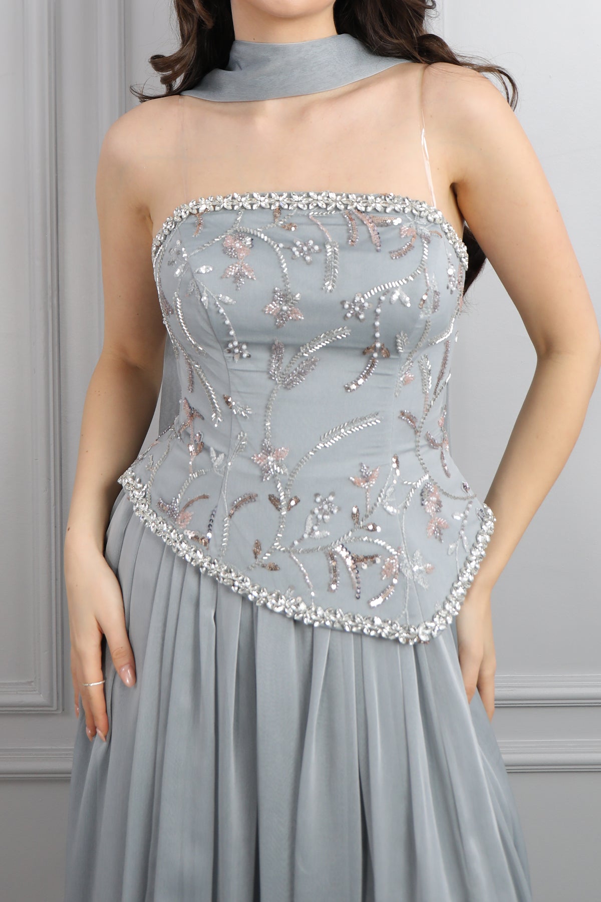 Straplez Boncuk İşlemeli Fular Detaylı Şifon Abiye Gri Özellikleri