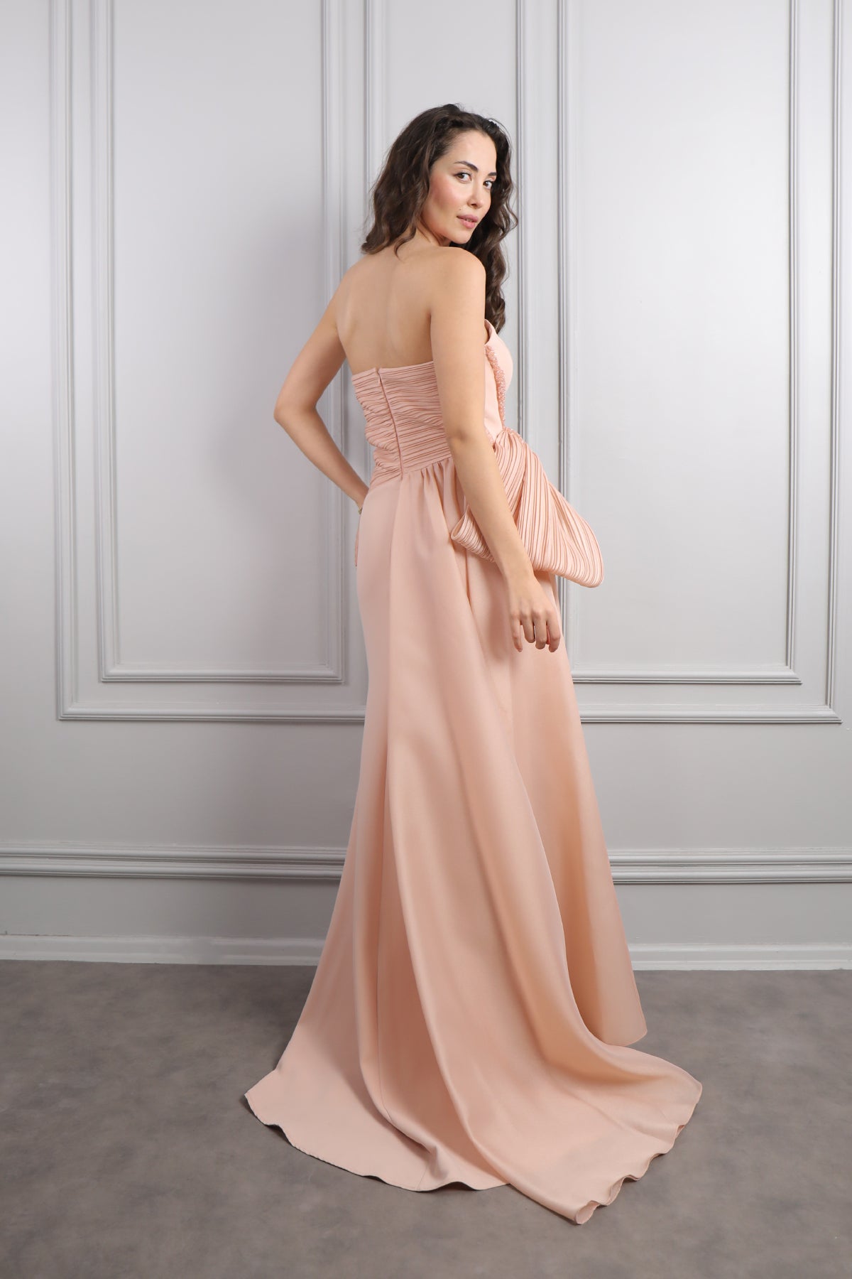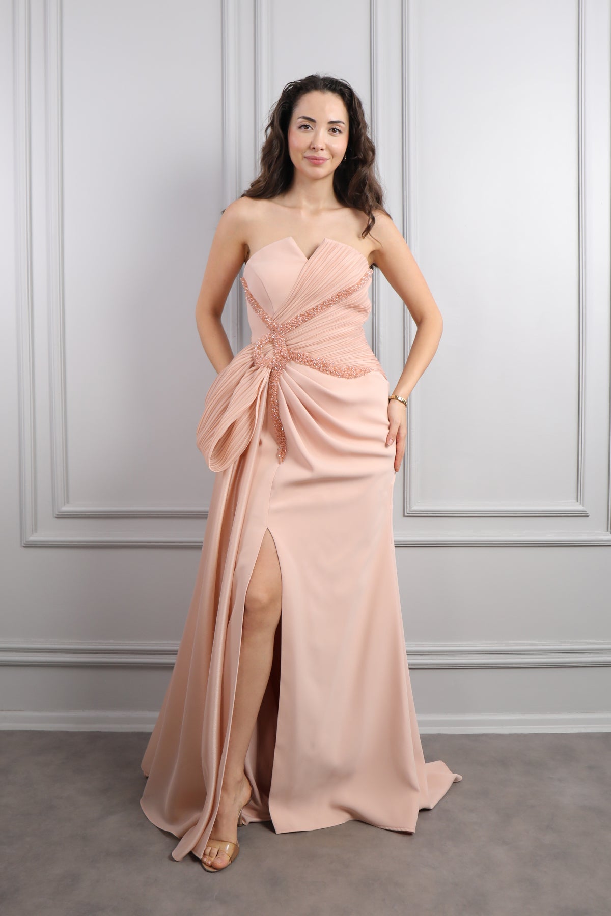 Bu zarif ve göz alıcı Straplez Boncuk İşlemeli Pelerin Detaylı abiye, özel davetlerde ve unutulmaz gecelerde ışıltınızı ön plana çıkaracak mükemmel bir tercihtir. Yumuşak ve romantik pudra tonuyla feminen bir duruş sergileyen model, straplez yaka tasarımıyla omuz ve boyun hattını zarifçe ortaya çıkarır. Gövde kısmındaki ince işçilikli boncuk işlemeler ve pelerin detaylı asimetrik drapeler, elbiseye lüks ve sofistike bir hava katar. Akıcı kumaşı sayesinde vücuda kusursuz şekilde otururken, dökümlü eteği hareket ettikçe zarafetle süzülür. hem konforlu hem de şık görünüm sunar. Düğün, nişan, gala gibi özel davetlerde fark yaratmak isteyenler için ideal bir seçenektir.