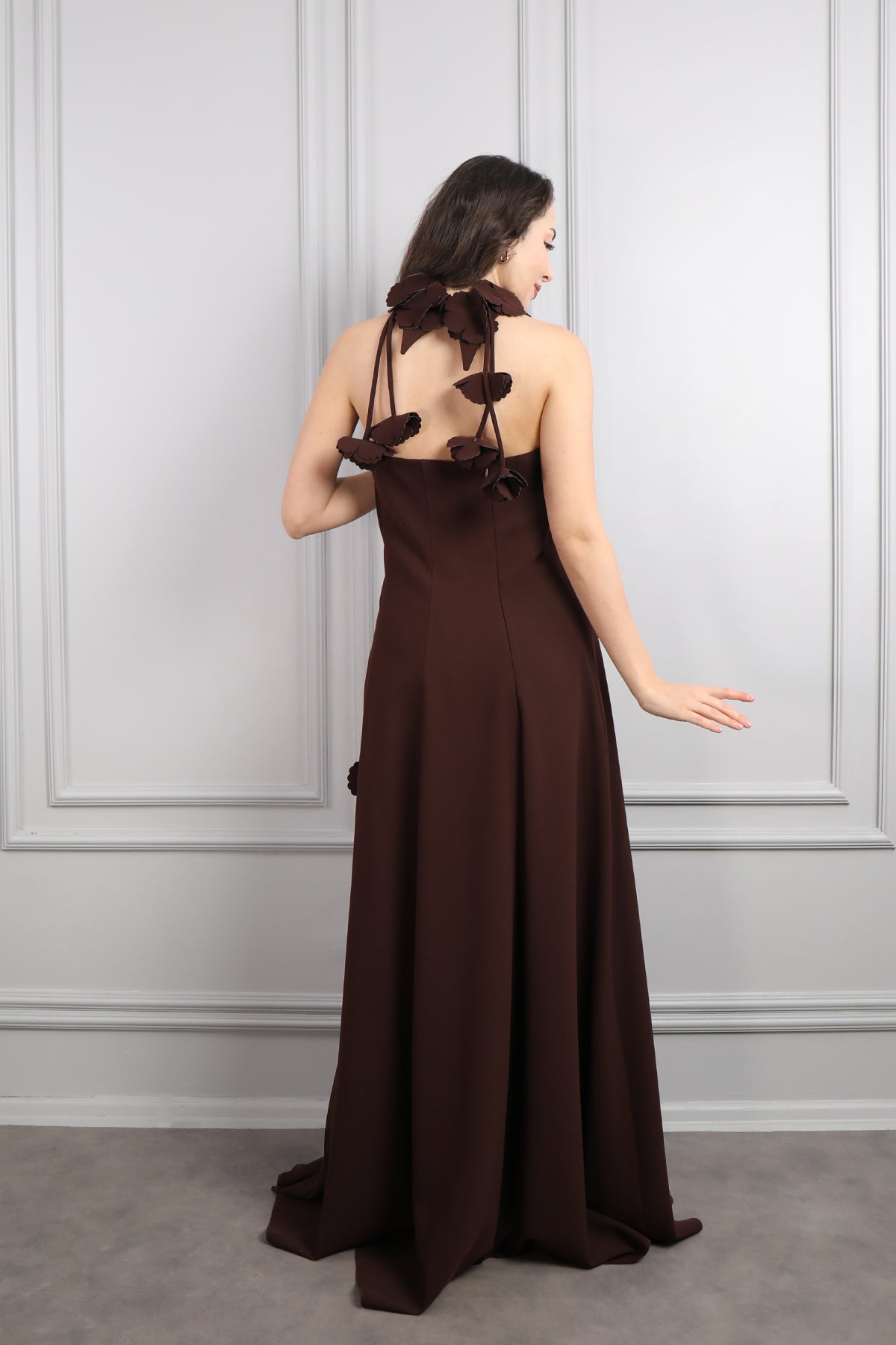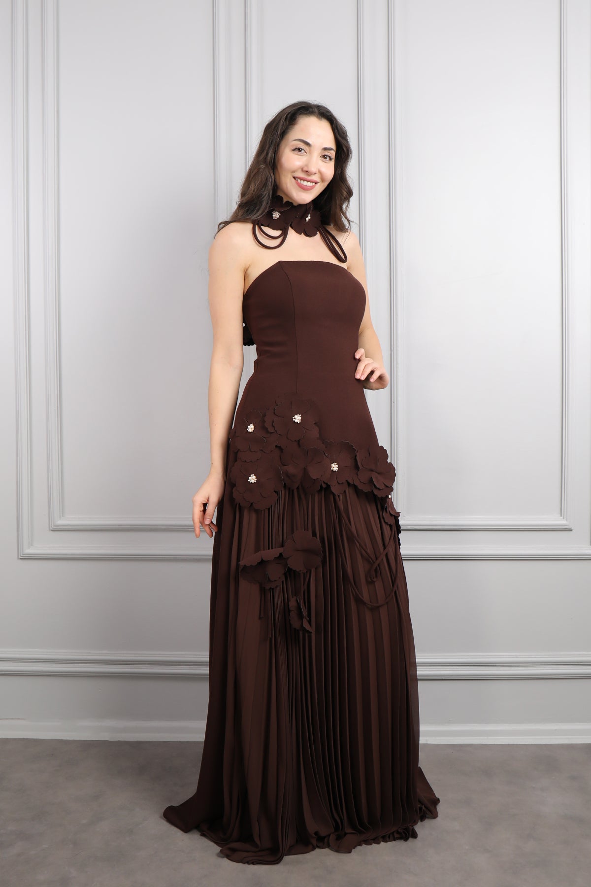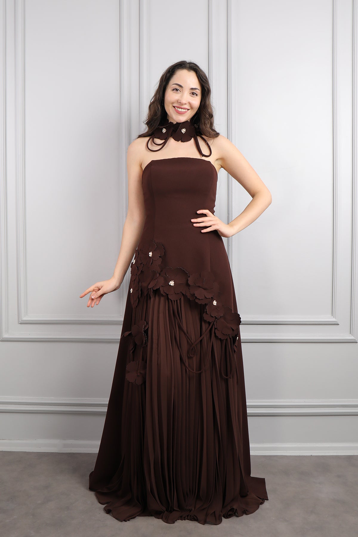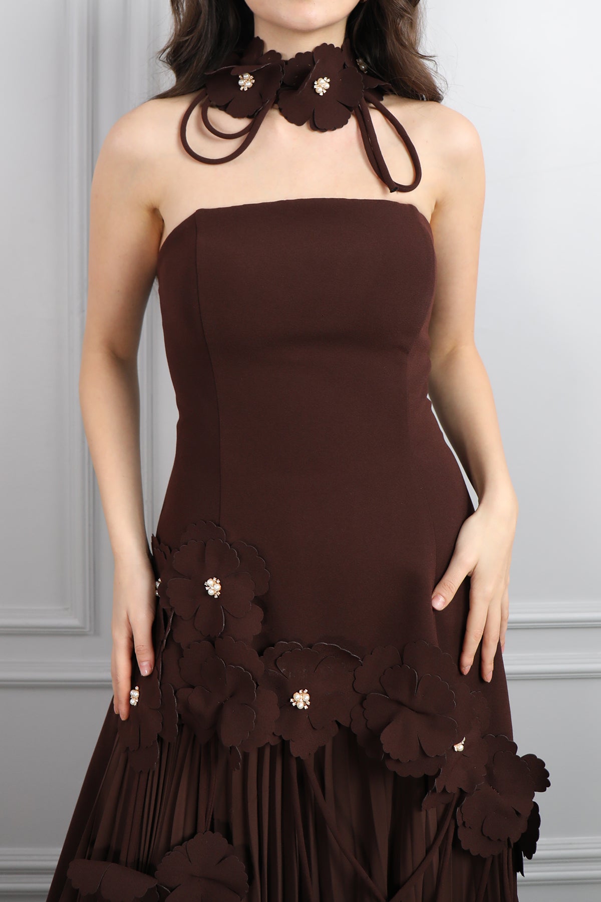 Straplez Çiçek Detaylı Eteği Pileli Abiye Kahve