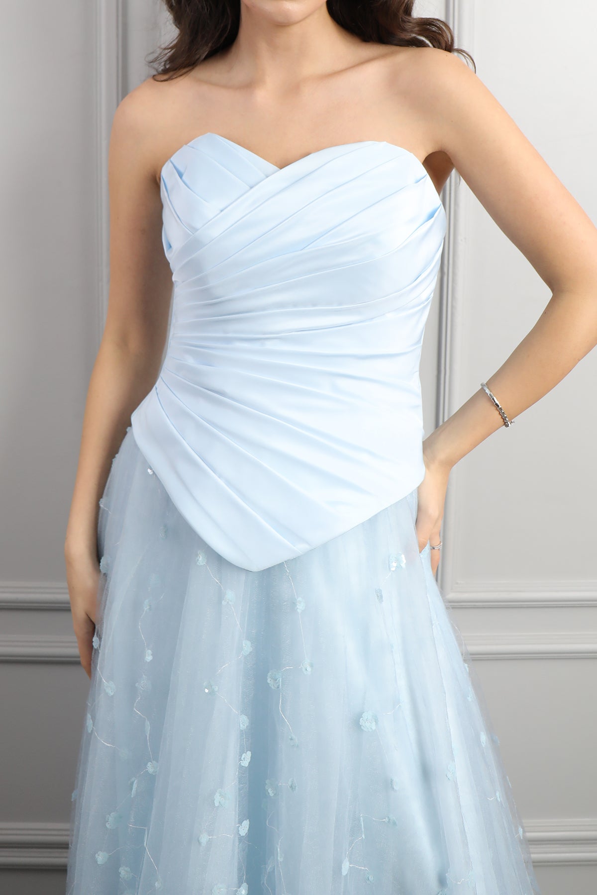 Straplez Drapeli Fular Detaylı Eteği Tüllü Abiye Bebe-Mavi