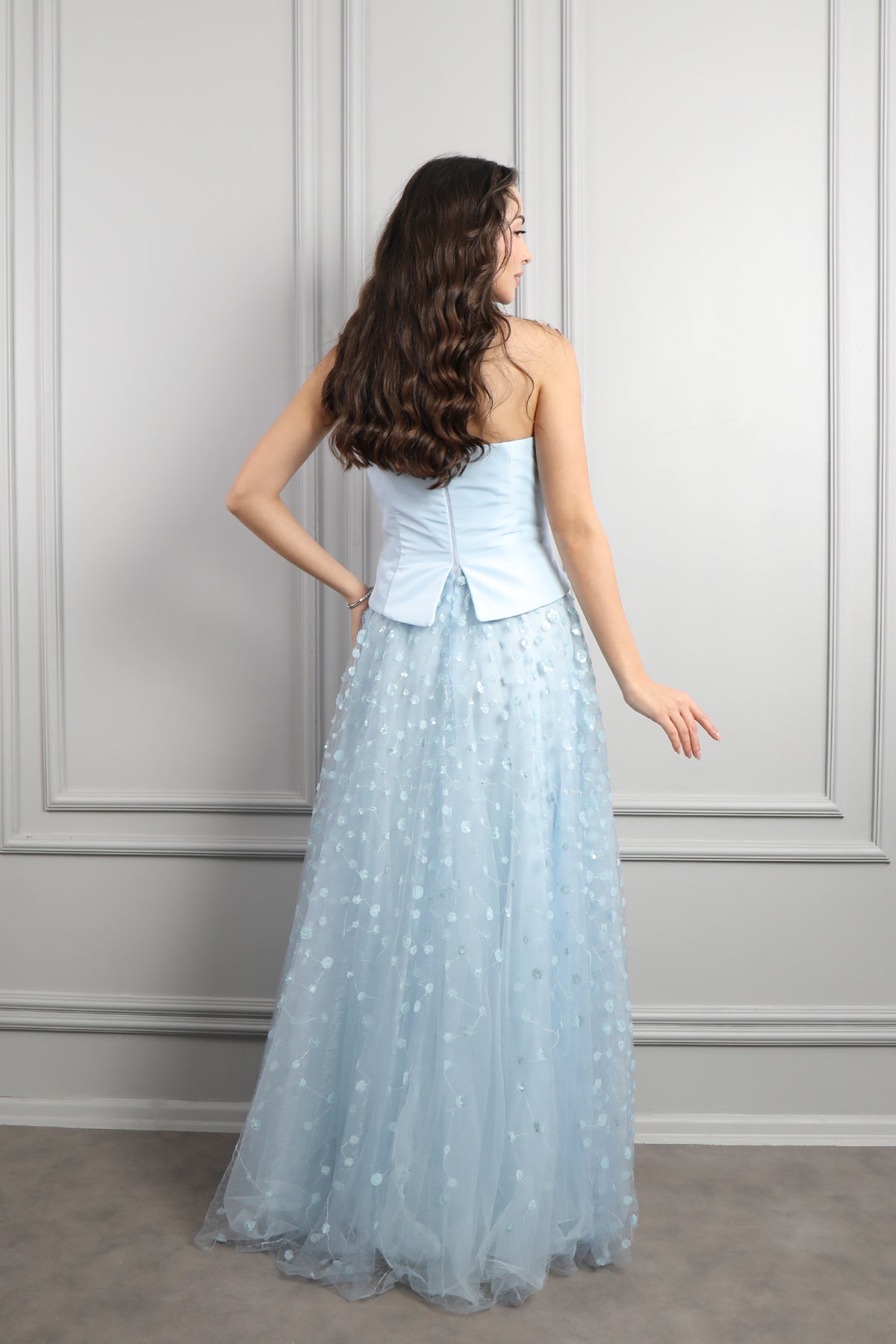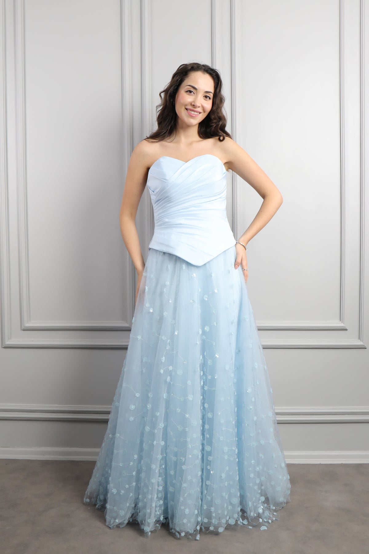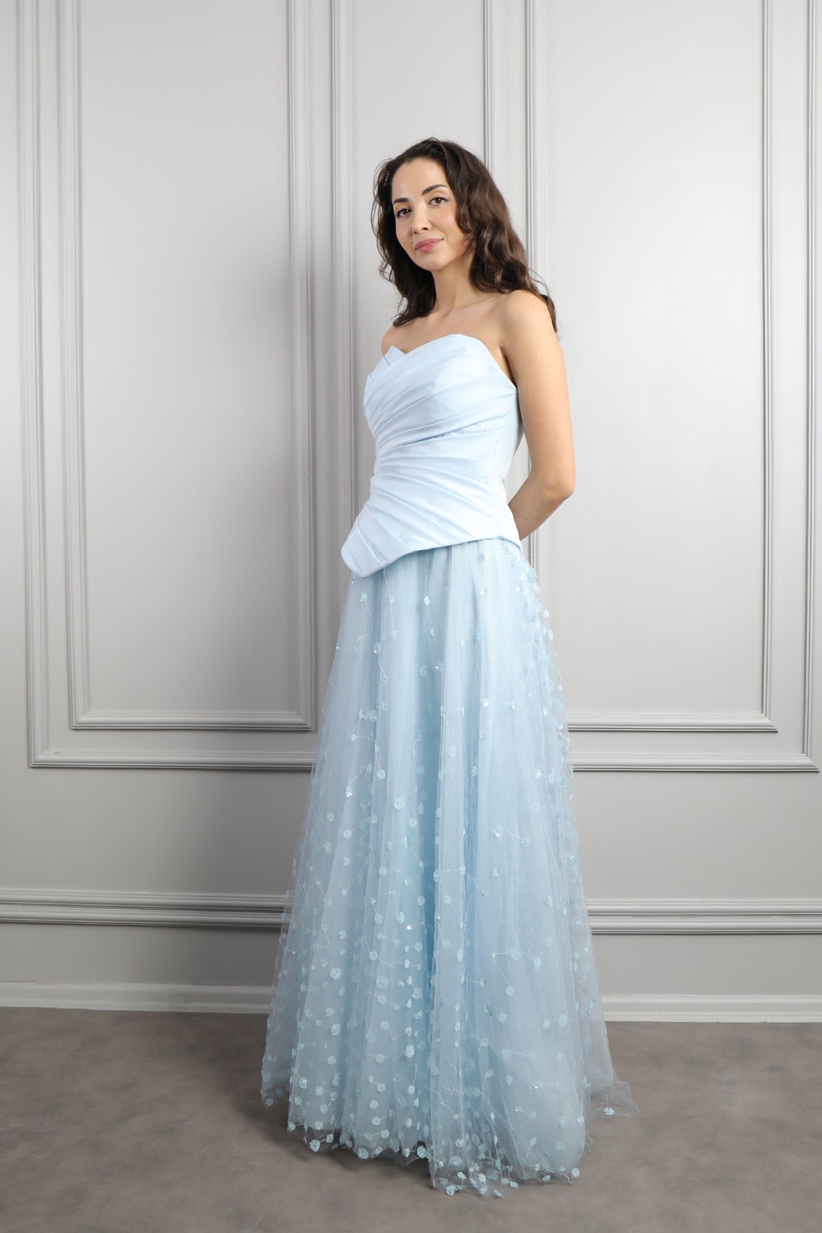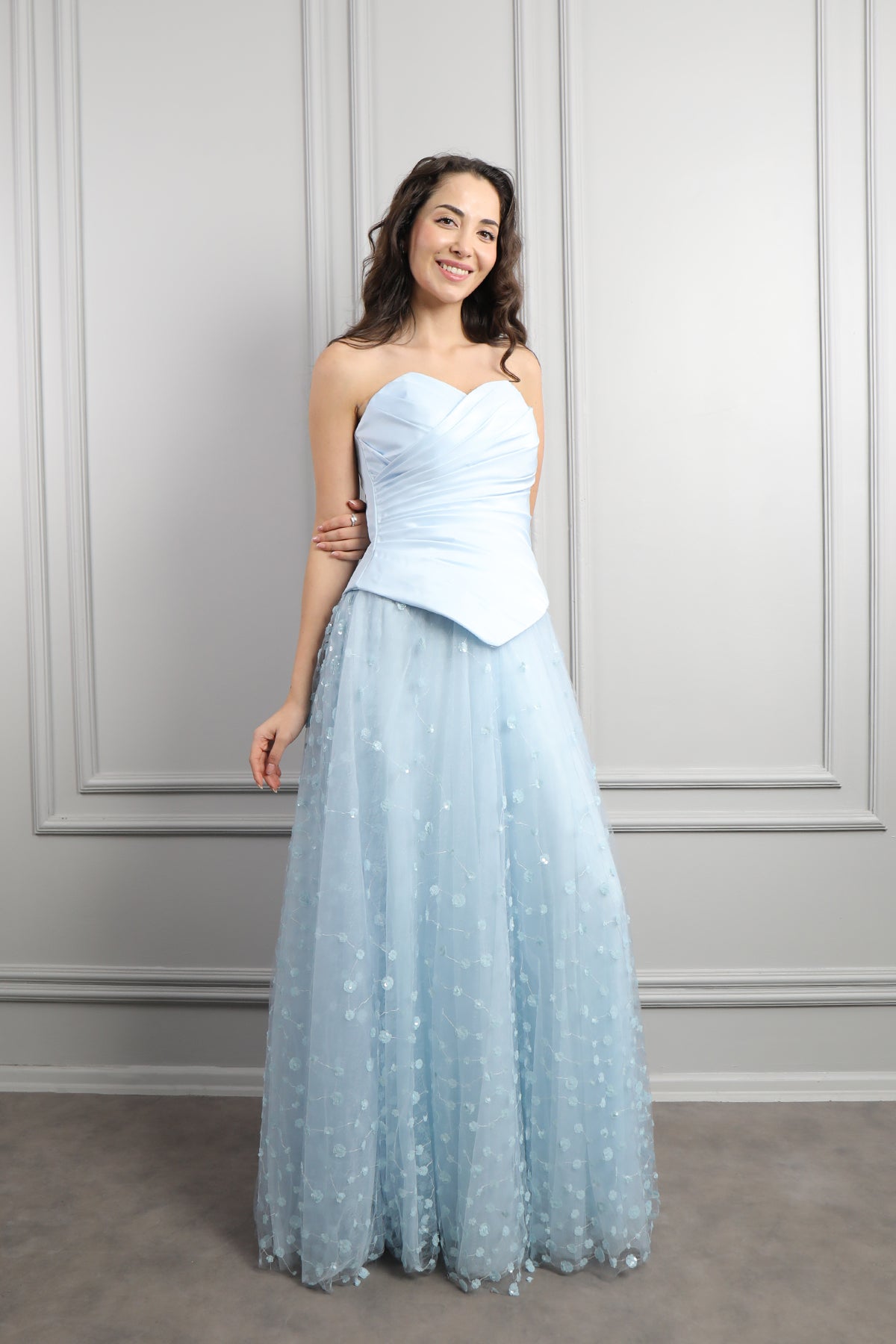 Straplez Drapeli Fular Detaylı Eteği Tüllü Abiye Bebe-Mavi Özellikleri