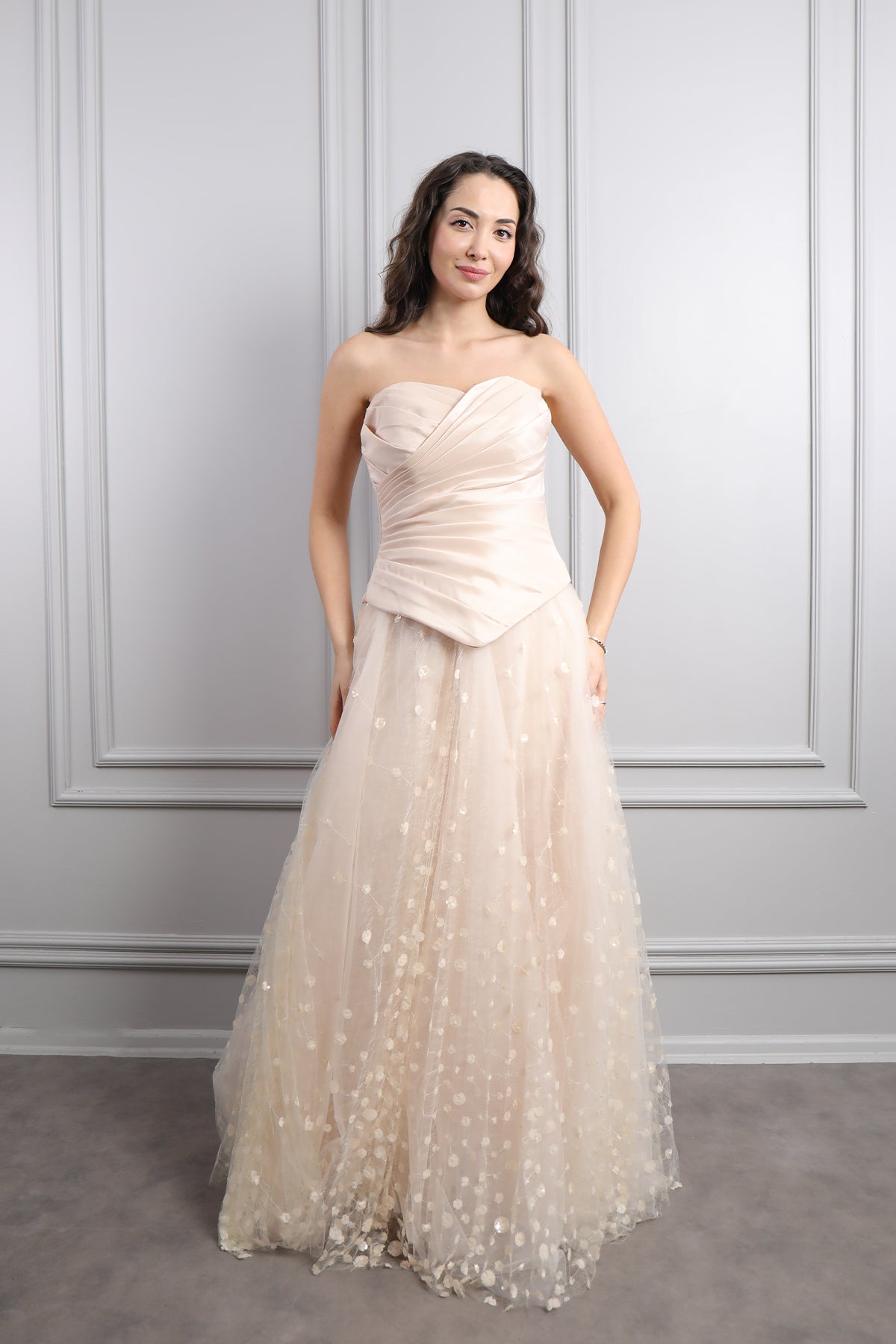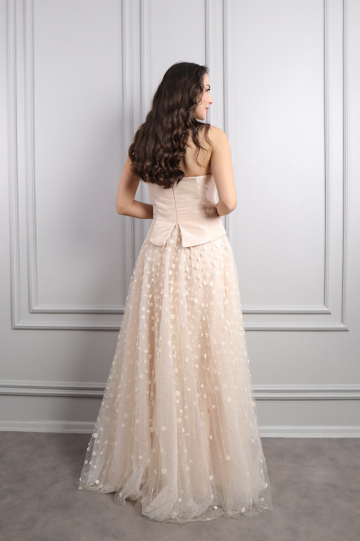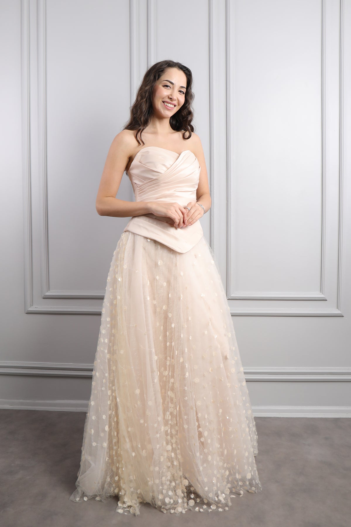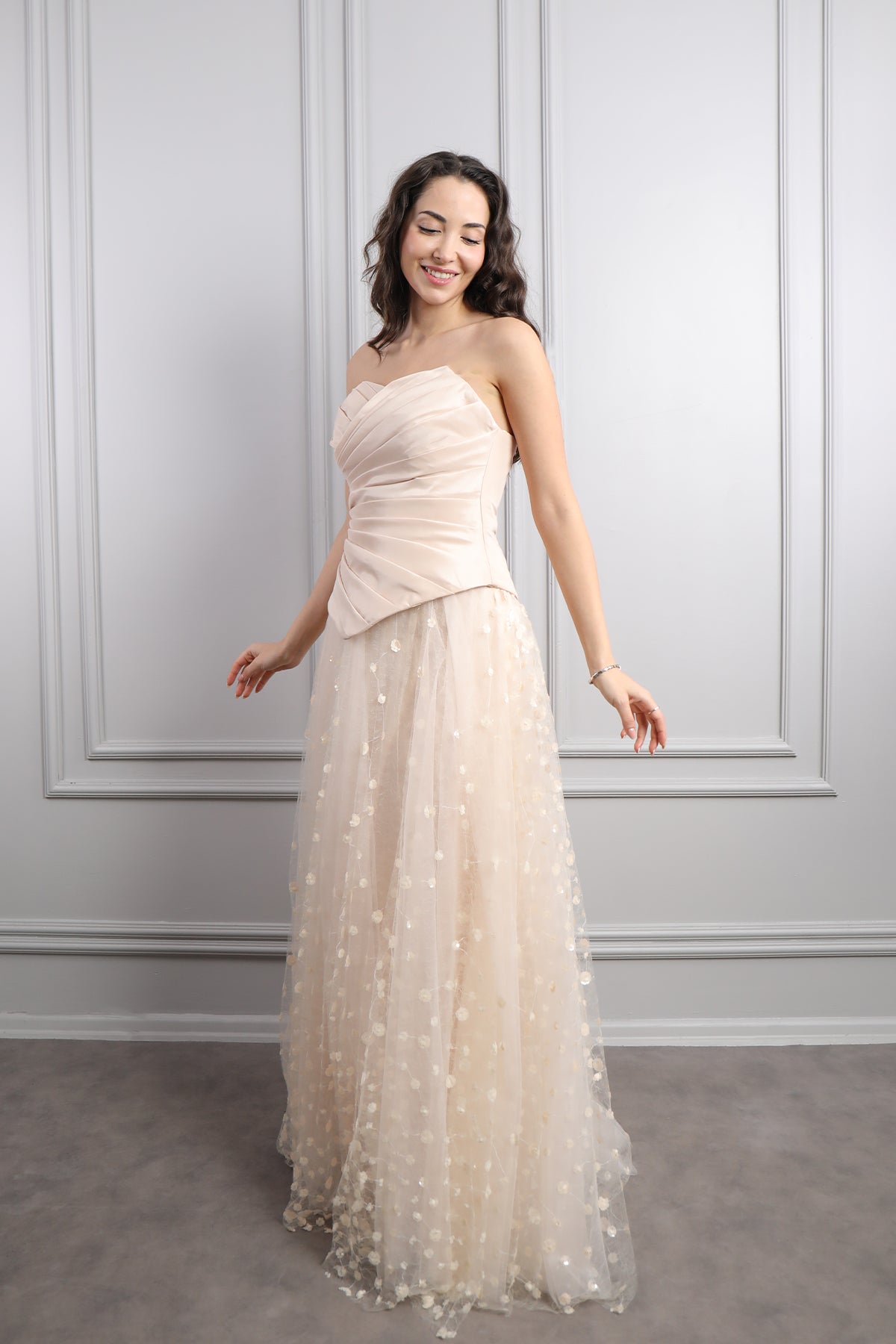 Straplez Drapeli Fular Detaylı Eteği Tüllü Abiye Somon