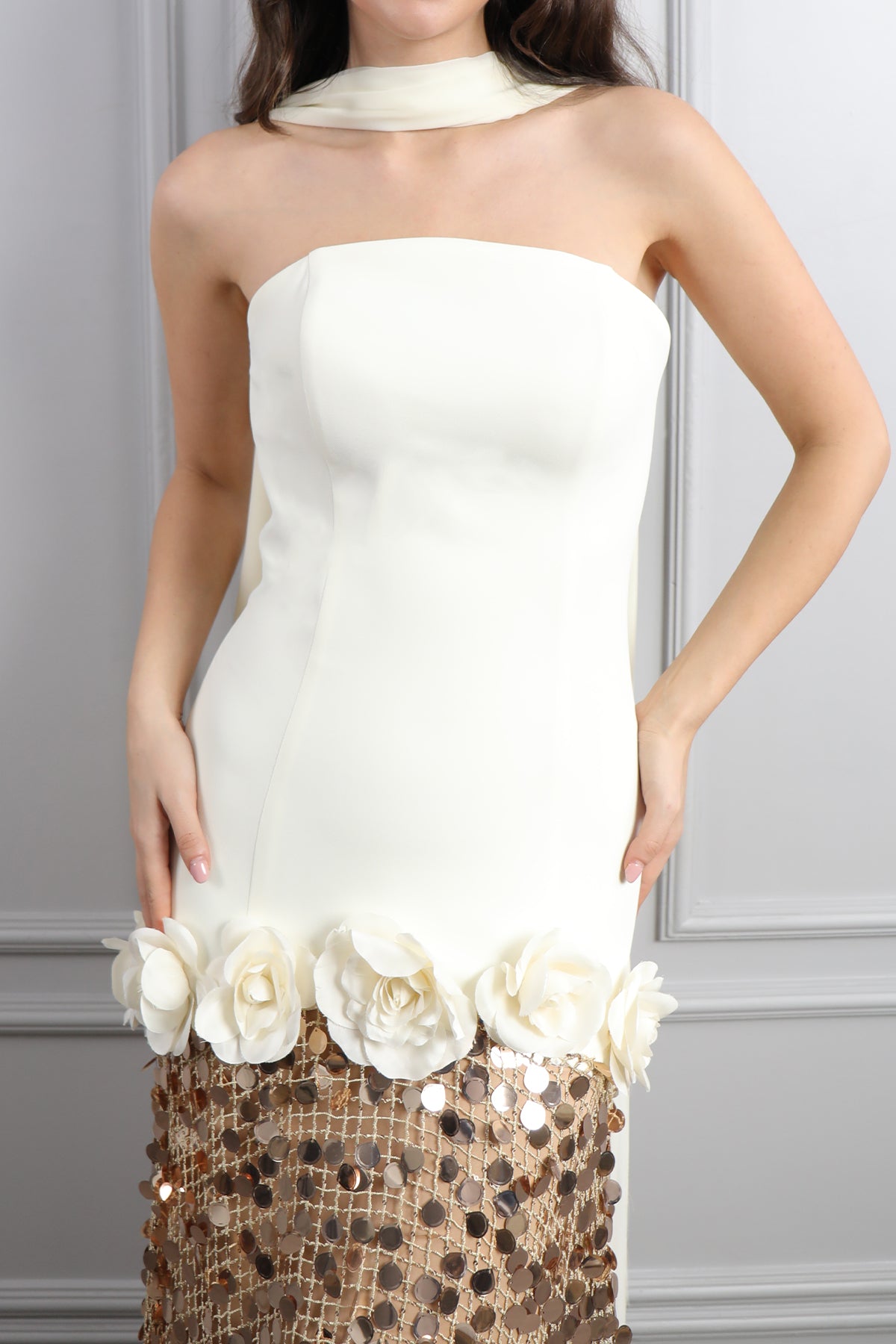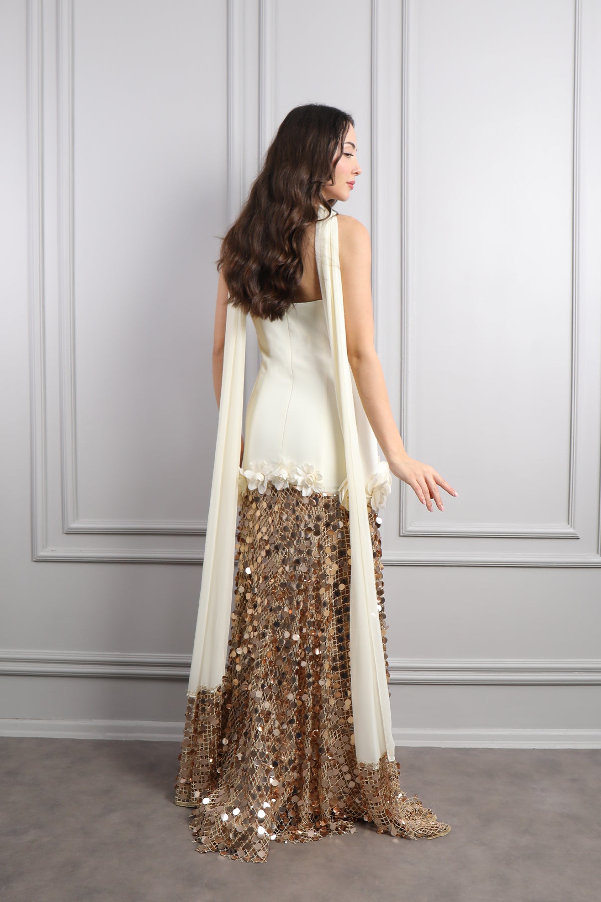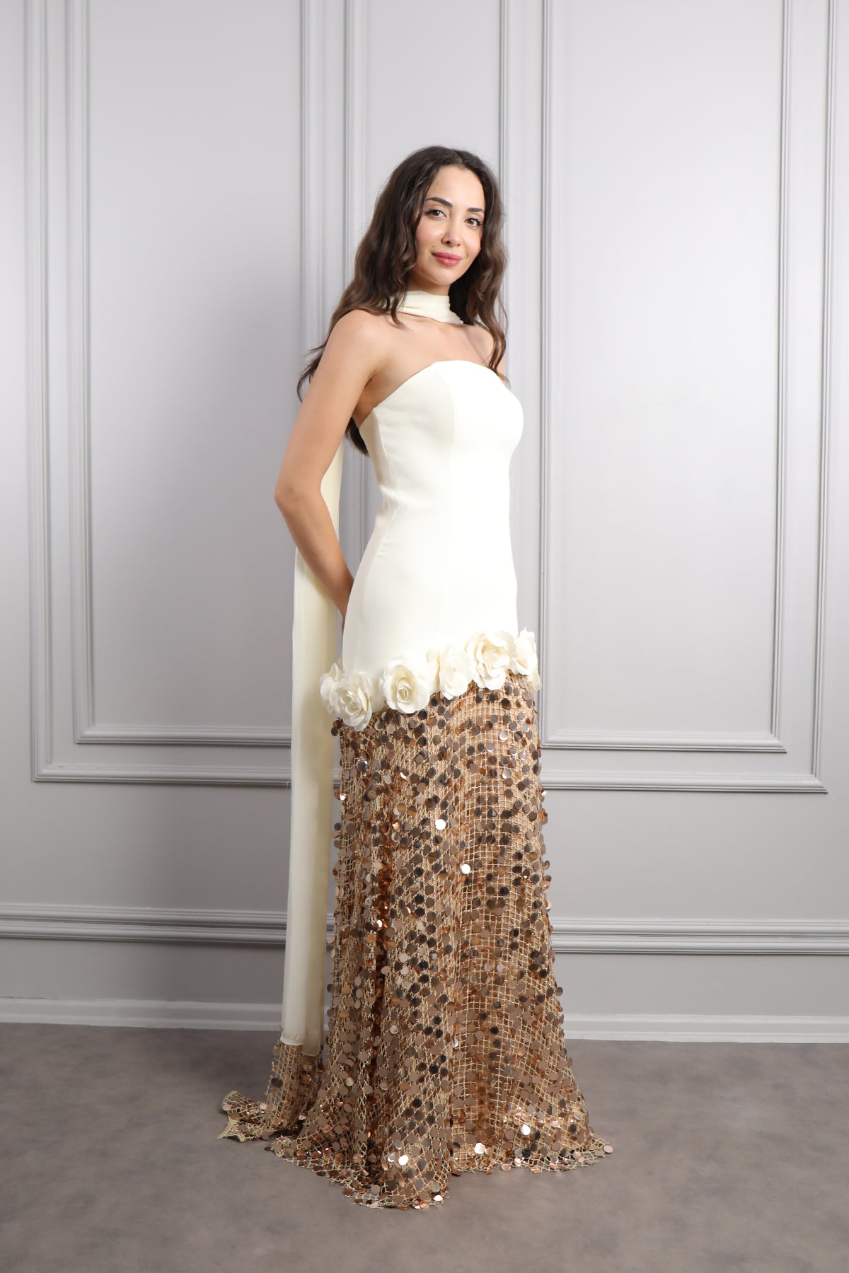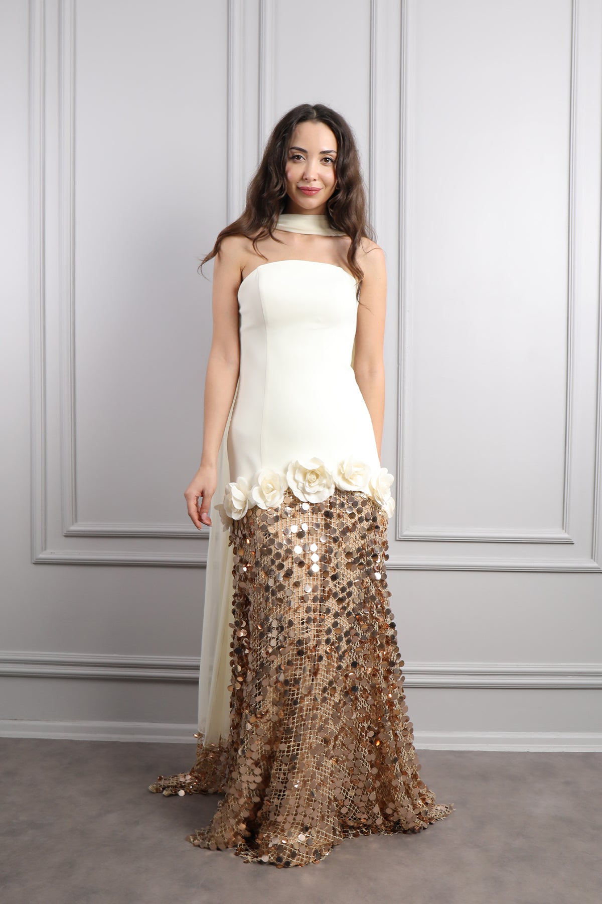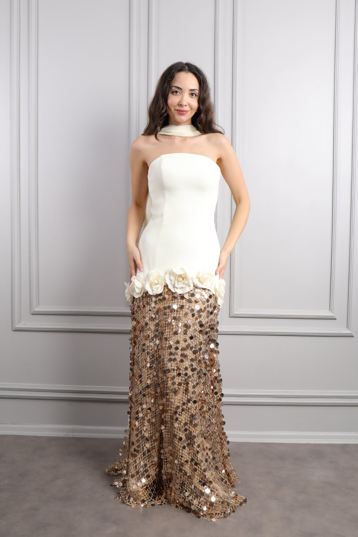 Straplez Fular Detaylı Eteği Payetli Abiye Ekru-Gold