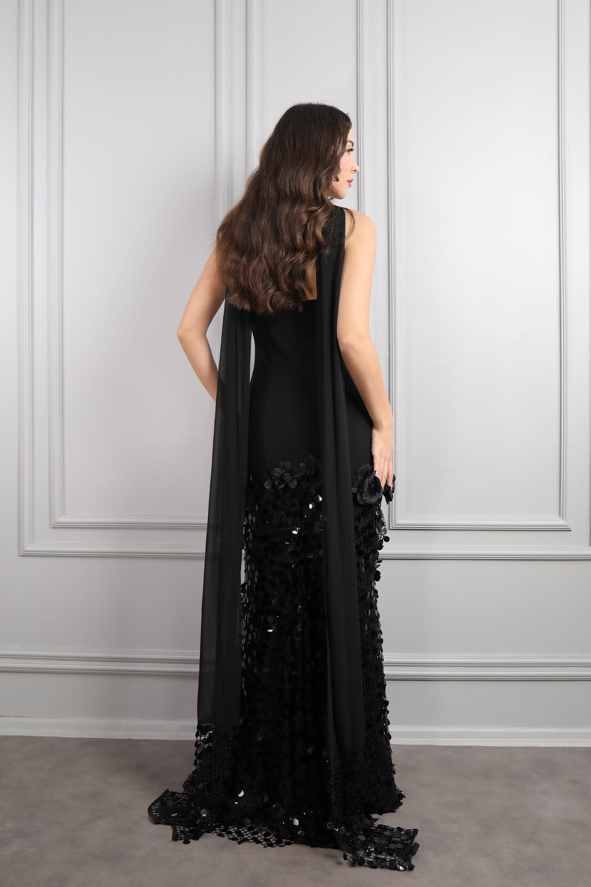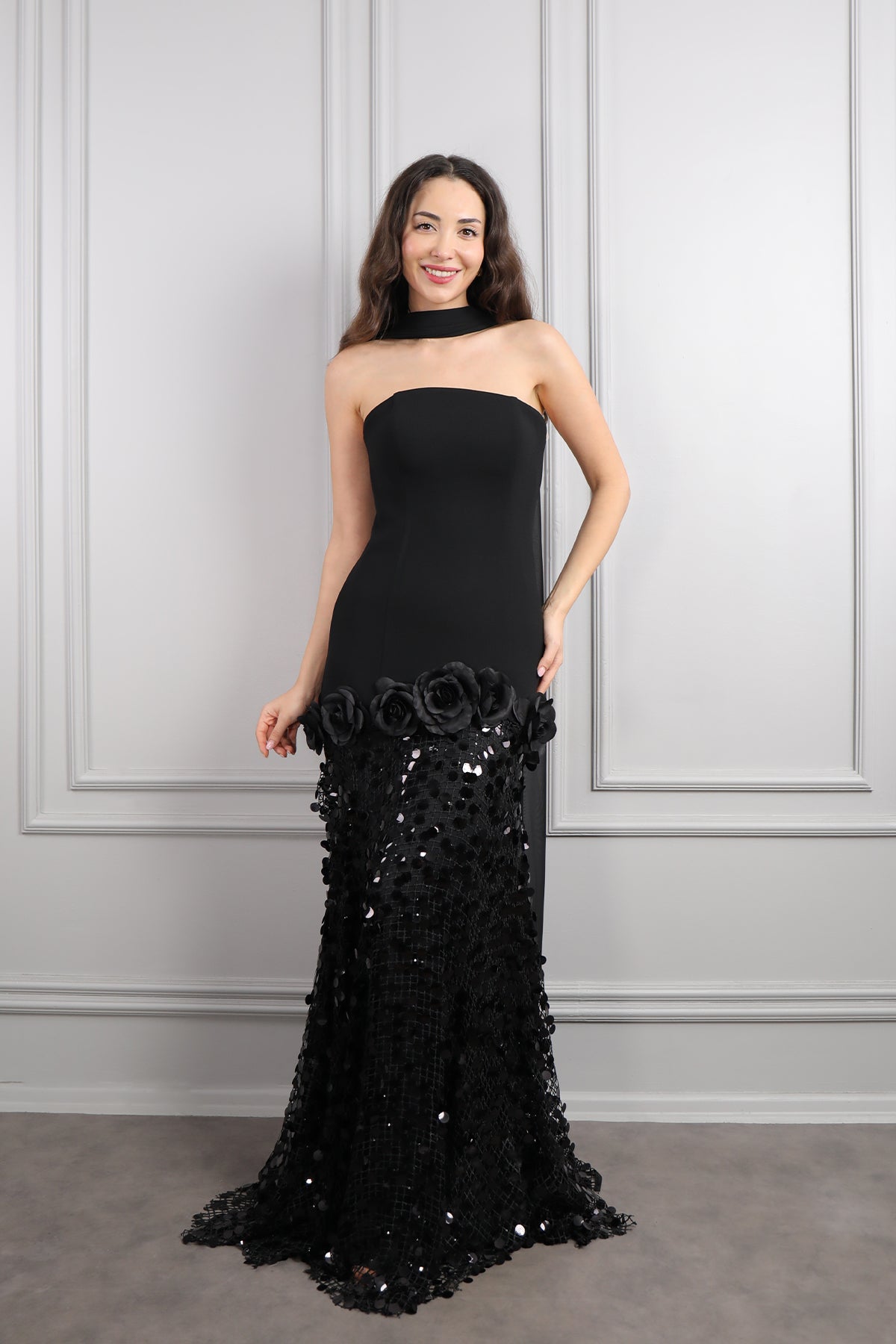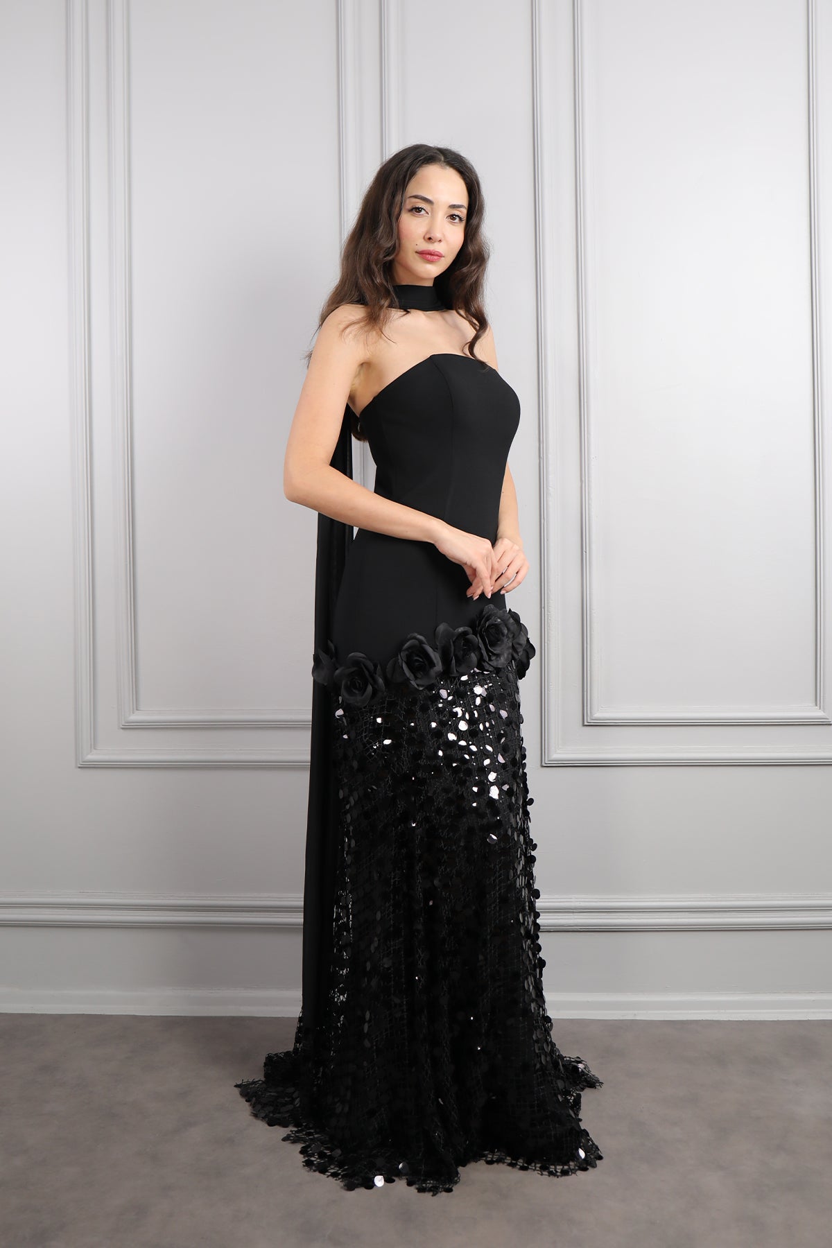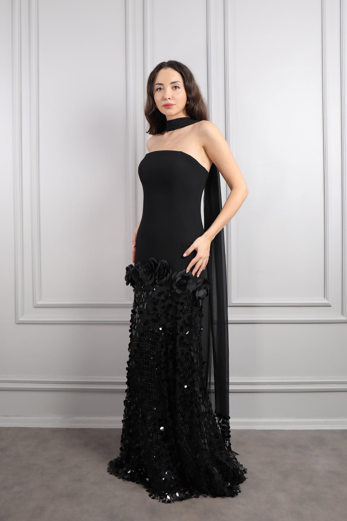 Straplez Fular Detaylı Eteği Payetli Abiye Siyah-Siyah