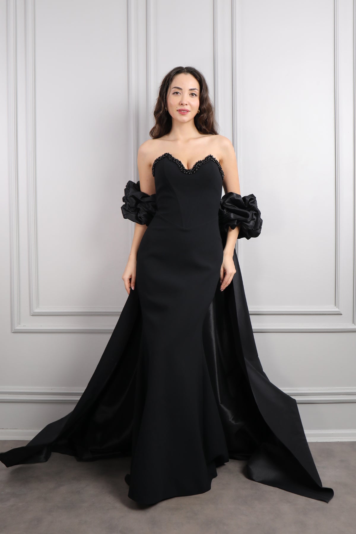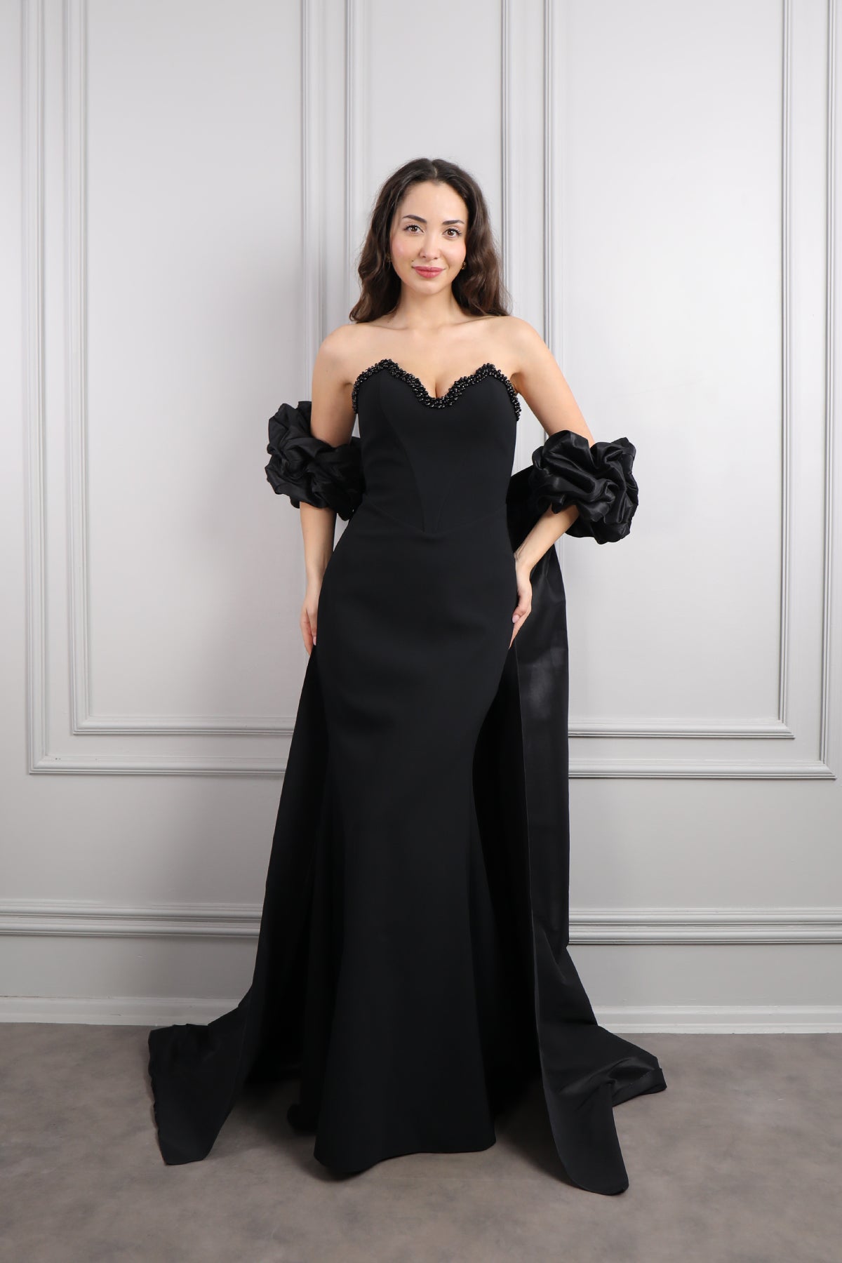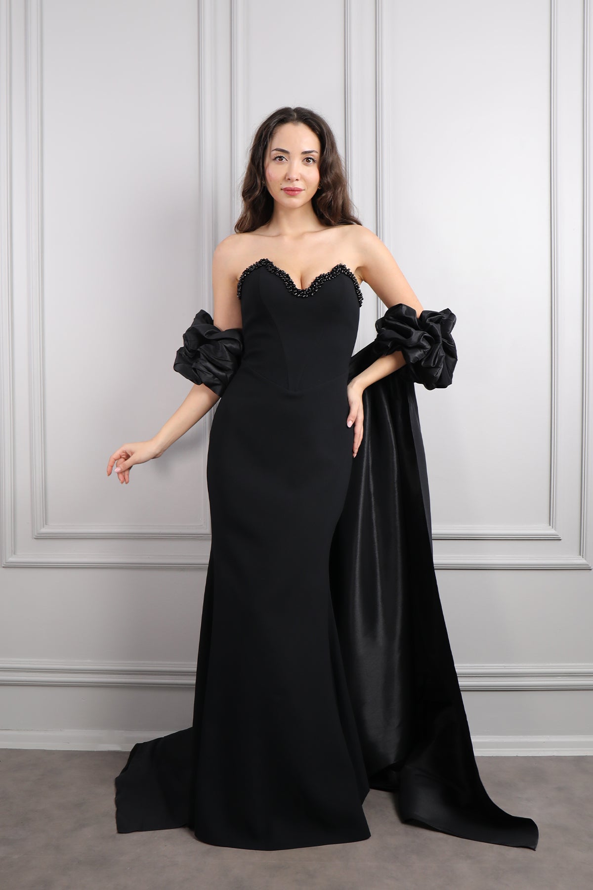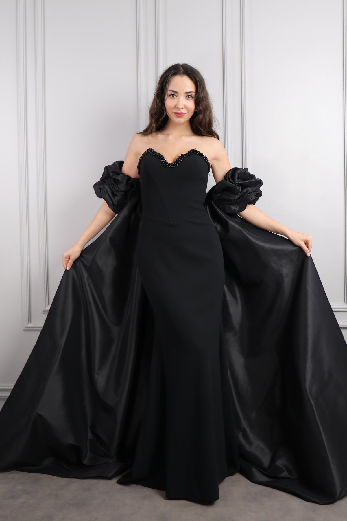 Straplez İnci İşlemeli Pelerin Detaylı Abiye Siyah