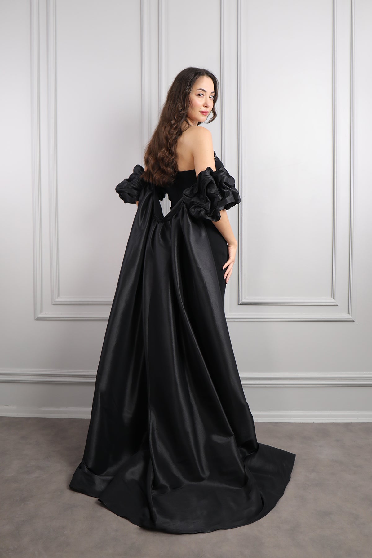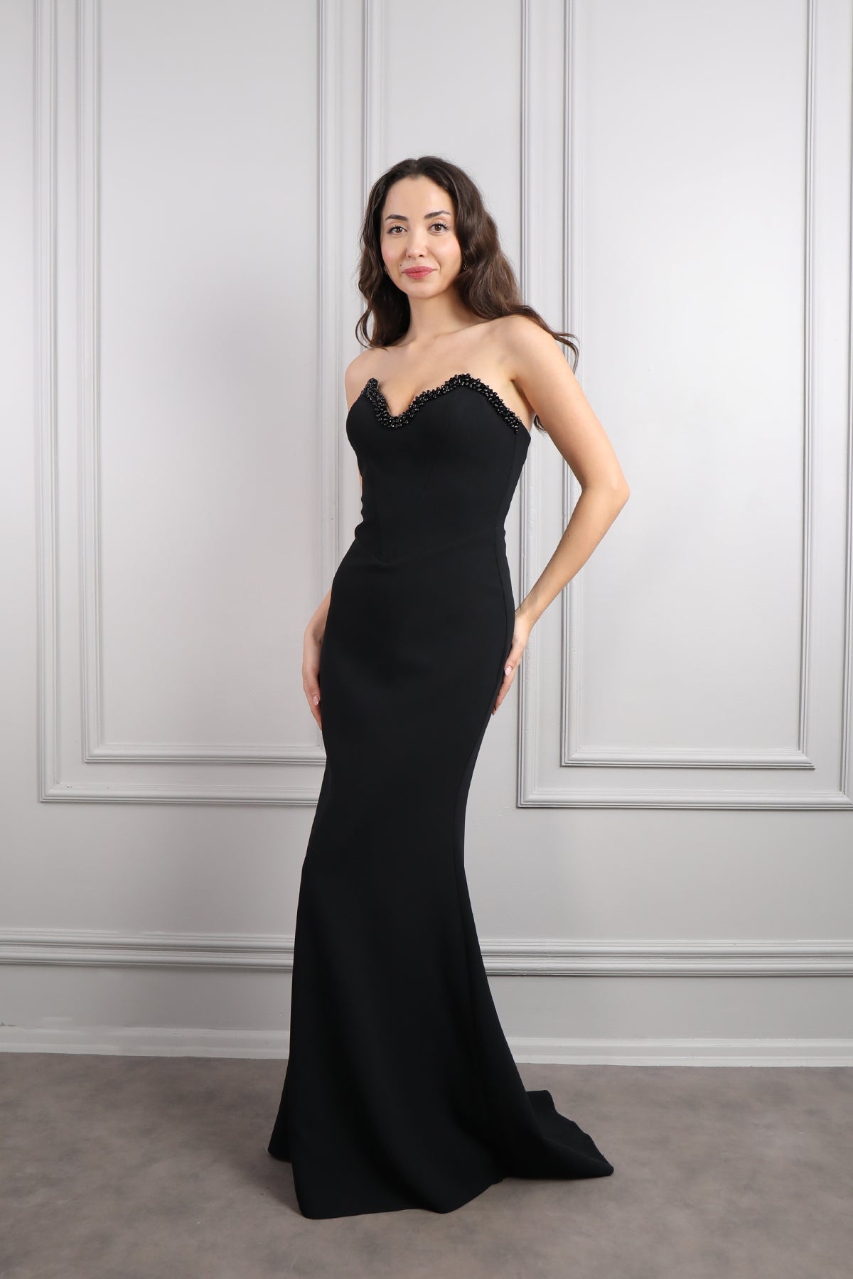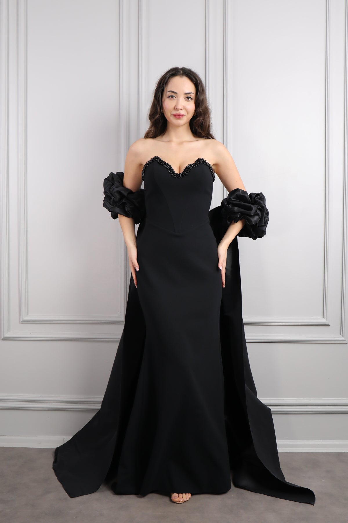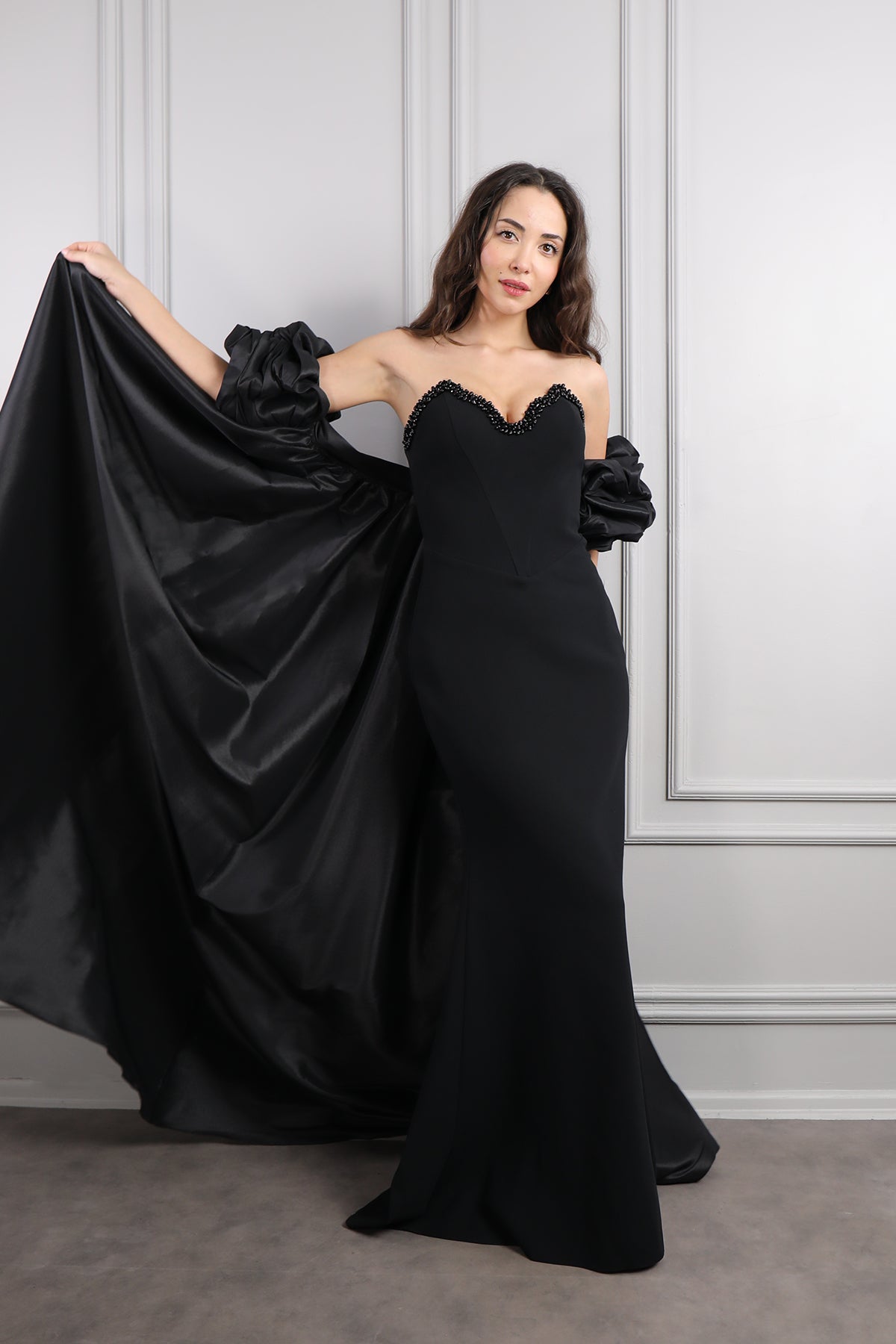 Straplez İnci İşlemeli Pelerin Detaylı Abiye Siyah