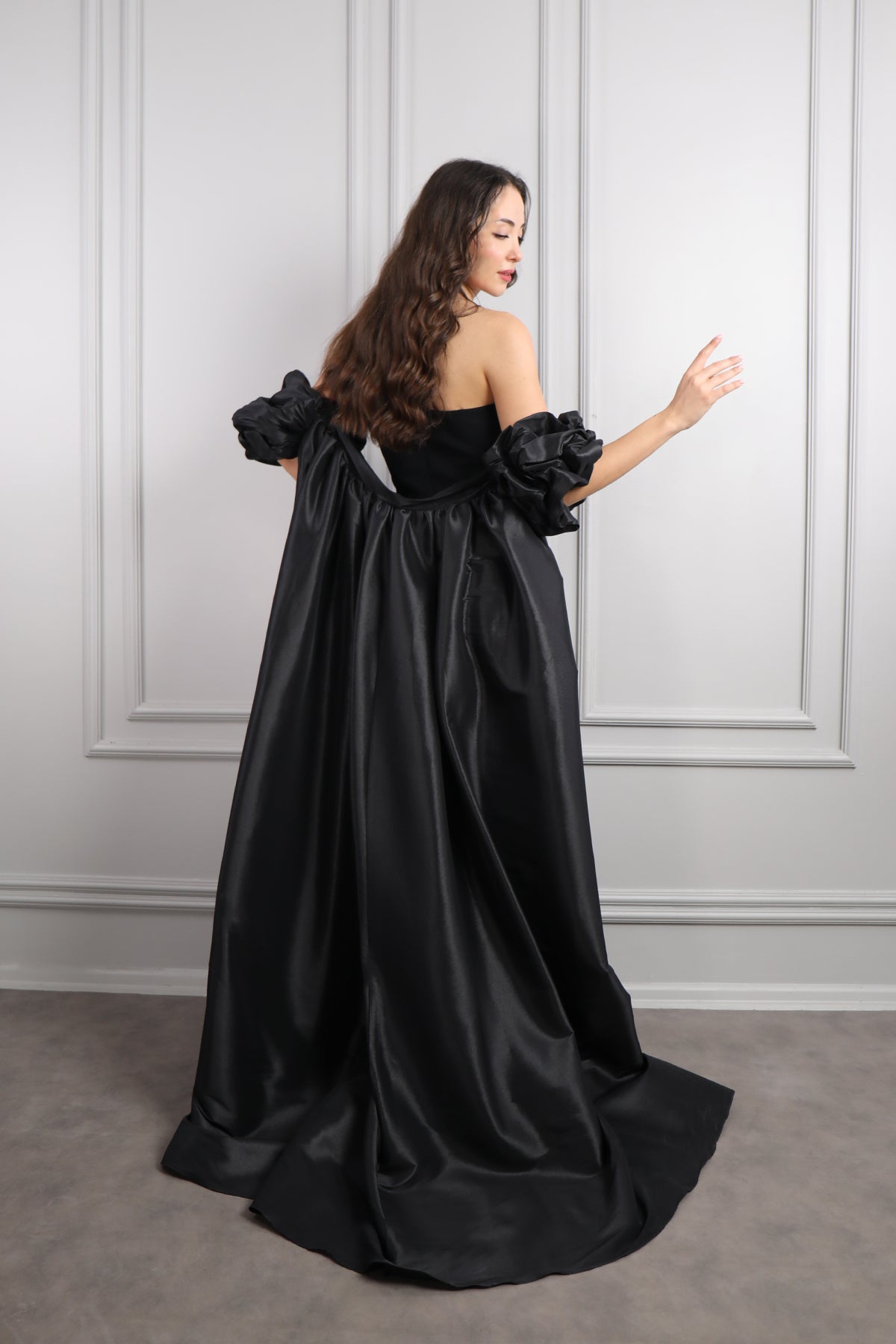 Straplez İnci İşlemeli Pelerin Detaylı Abiye Siyah Özellikleri