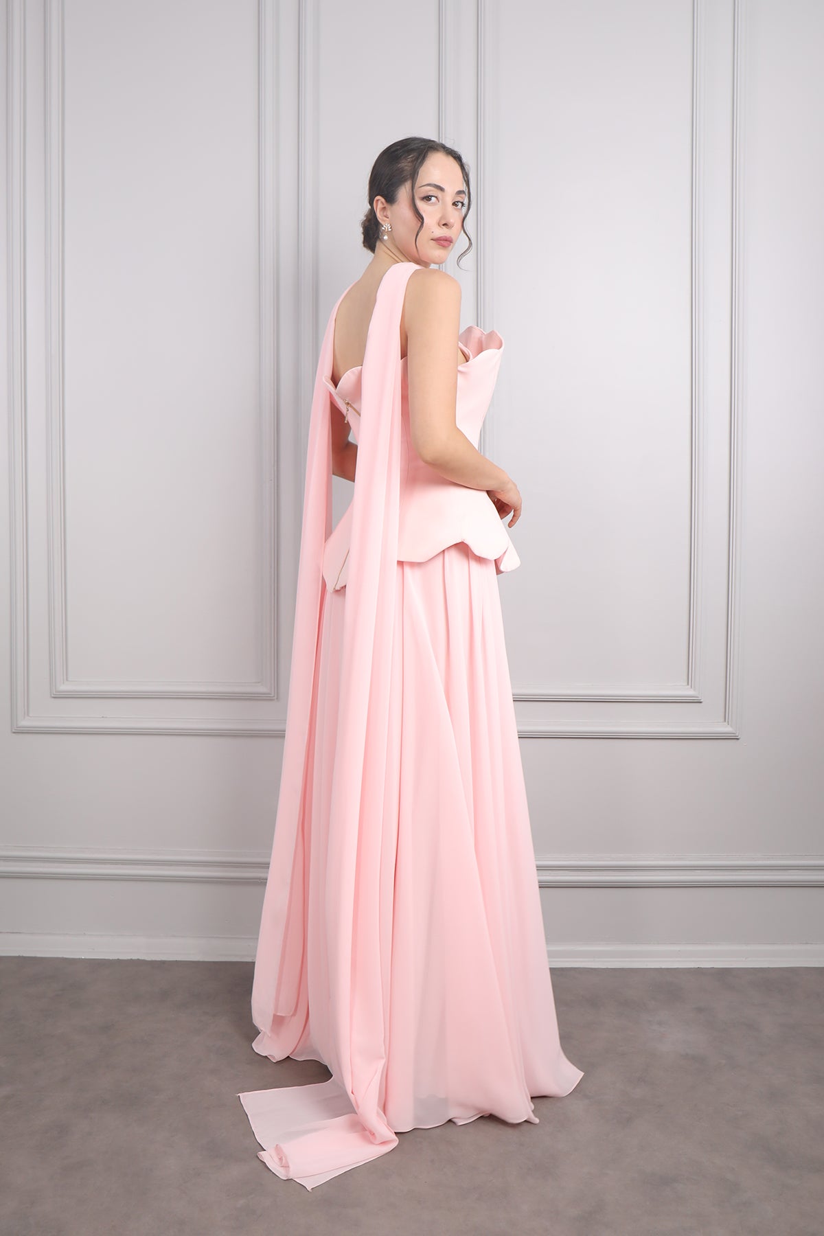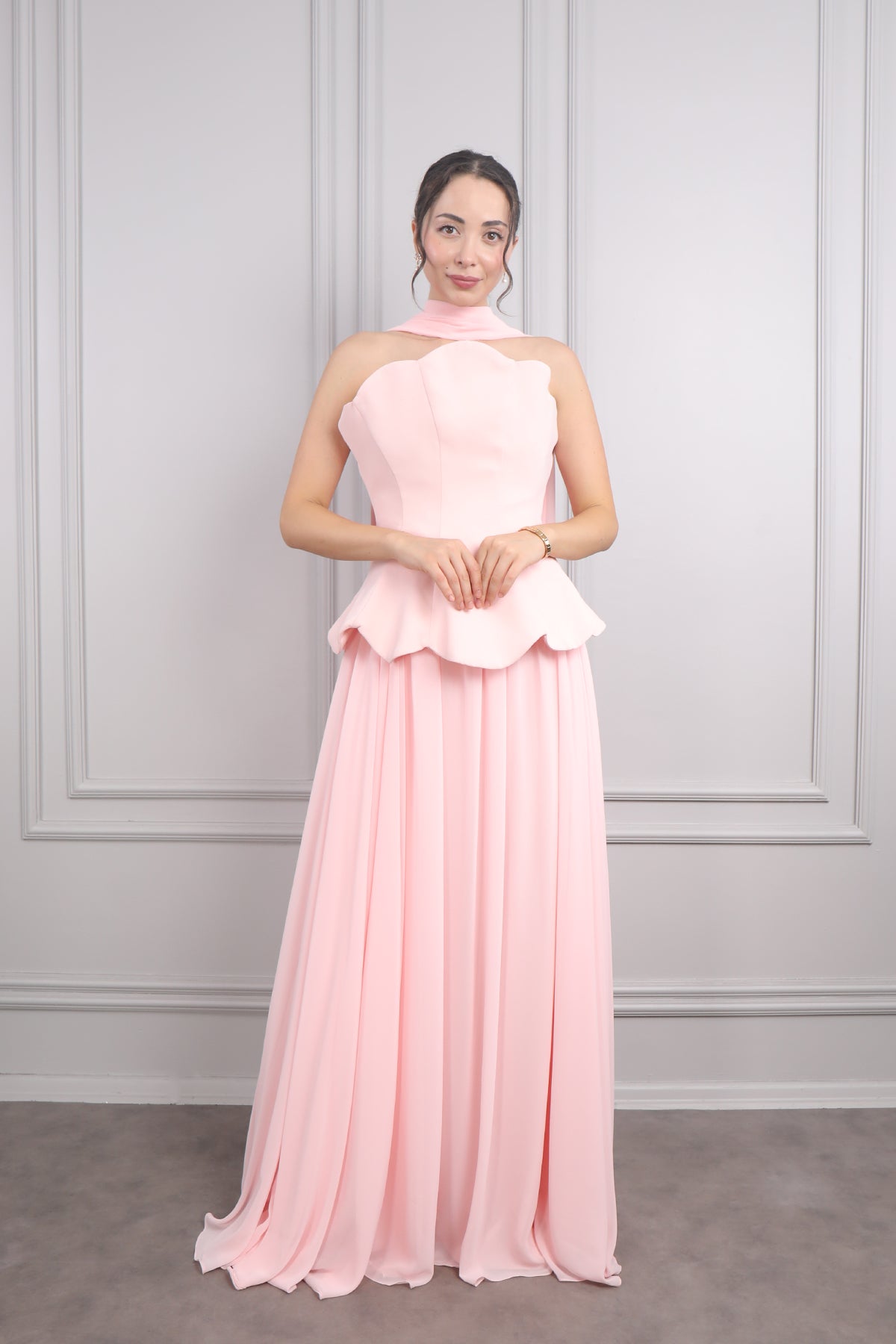 Straplez elbisemiz belinden aşağı bol bir şekilde inerken tamamı şifon kumaş kullanılarak tasarlanmıştır. Üzerine sonradan giyilen korse görünümlü parçasıyla bütünlük oluşturarak vücudunu sararken boynundaki şifon aksesuarıyla modern görünüme sahiptir. Tam boy abiyemizi özel gün veya davetlerinizde tercih etmeniz sizler için ideal bir seçim olacaktır.