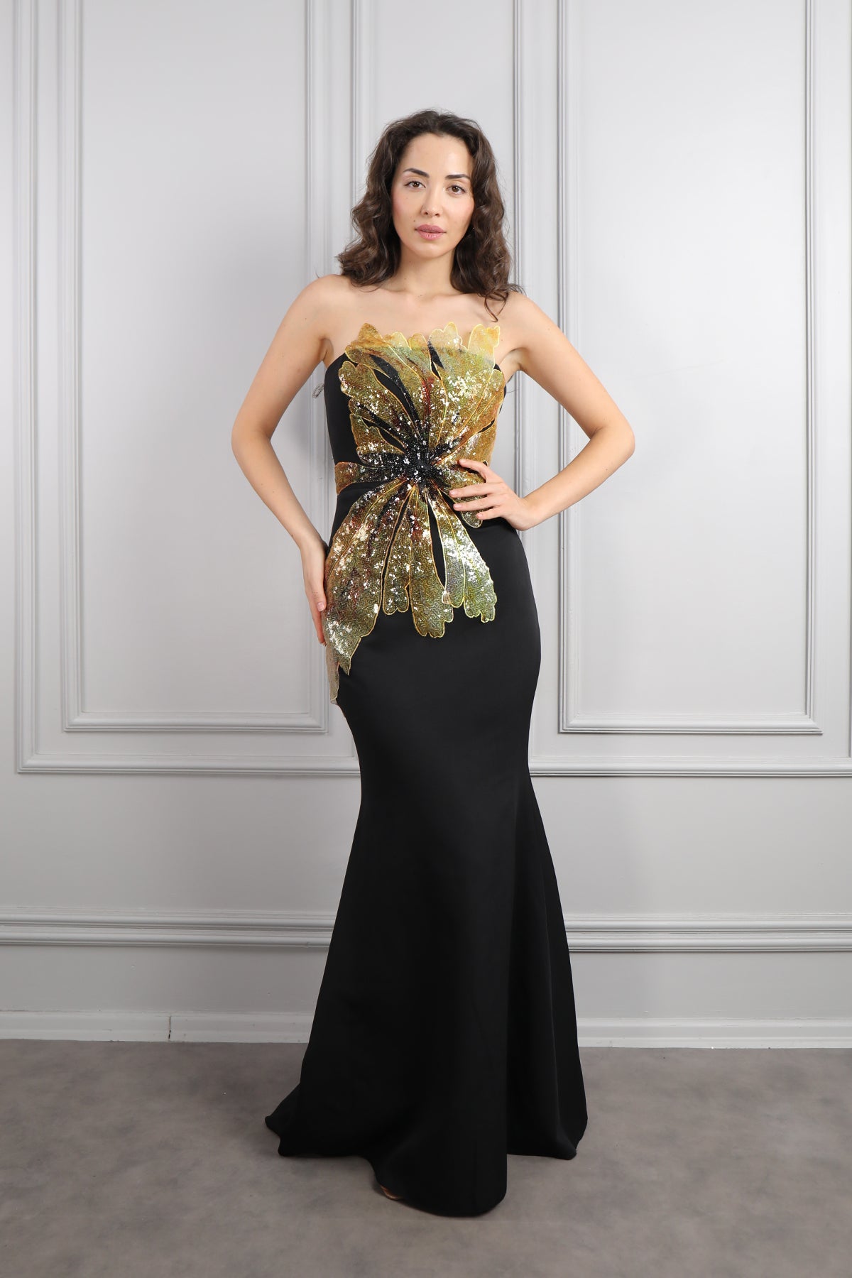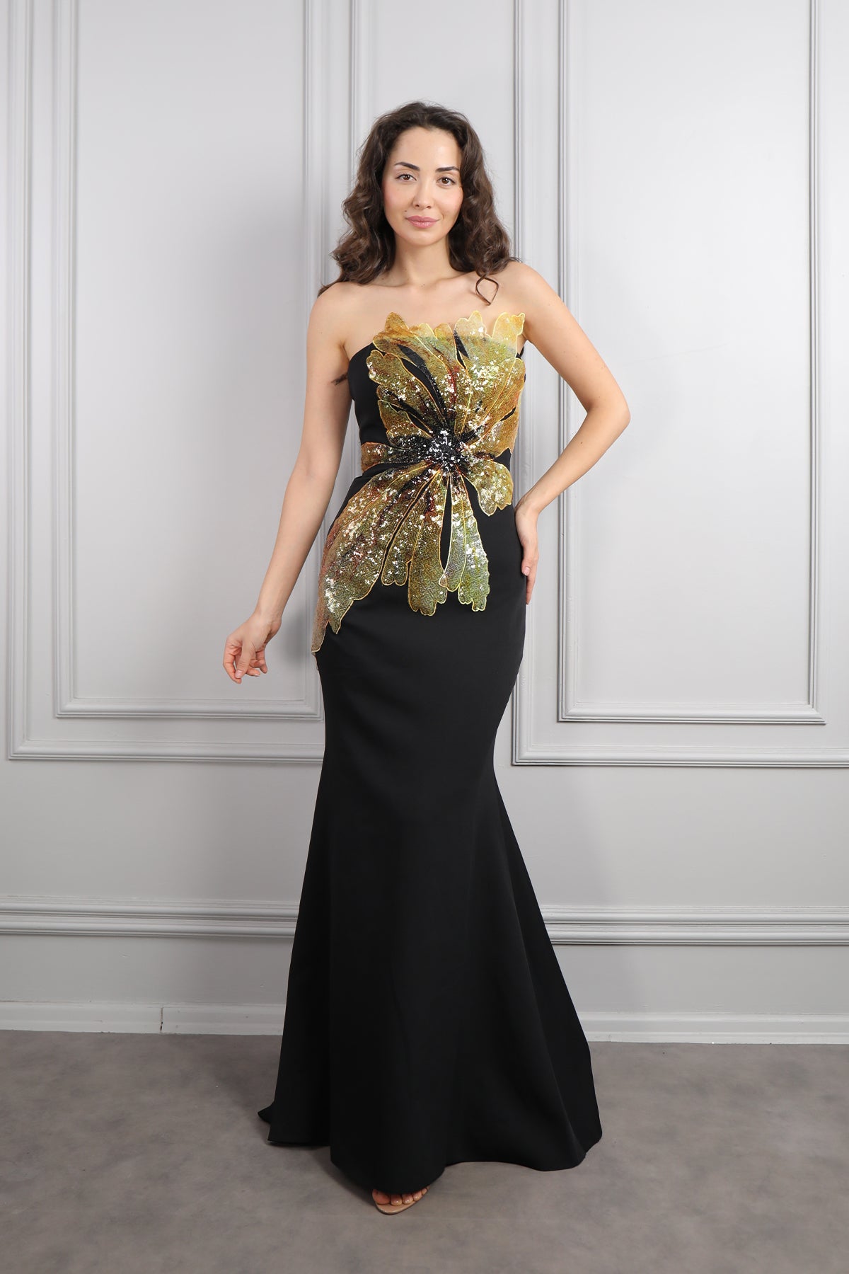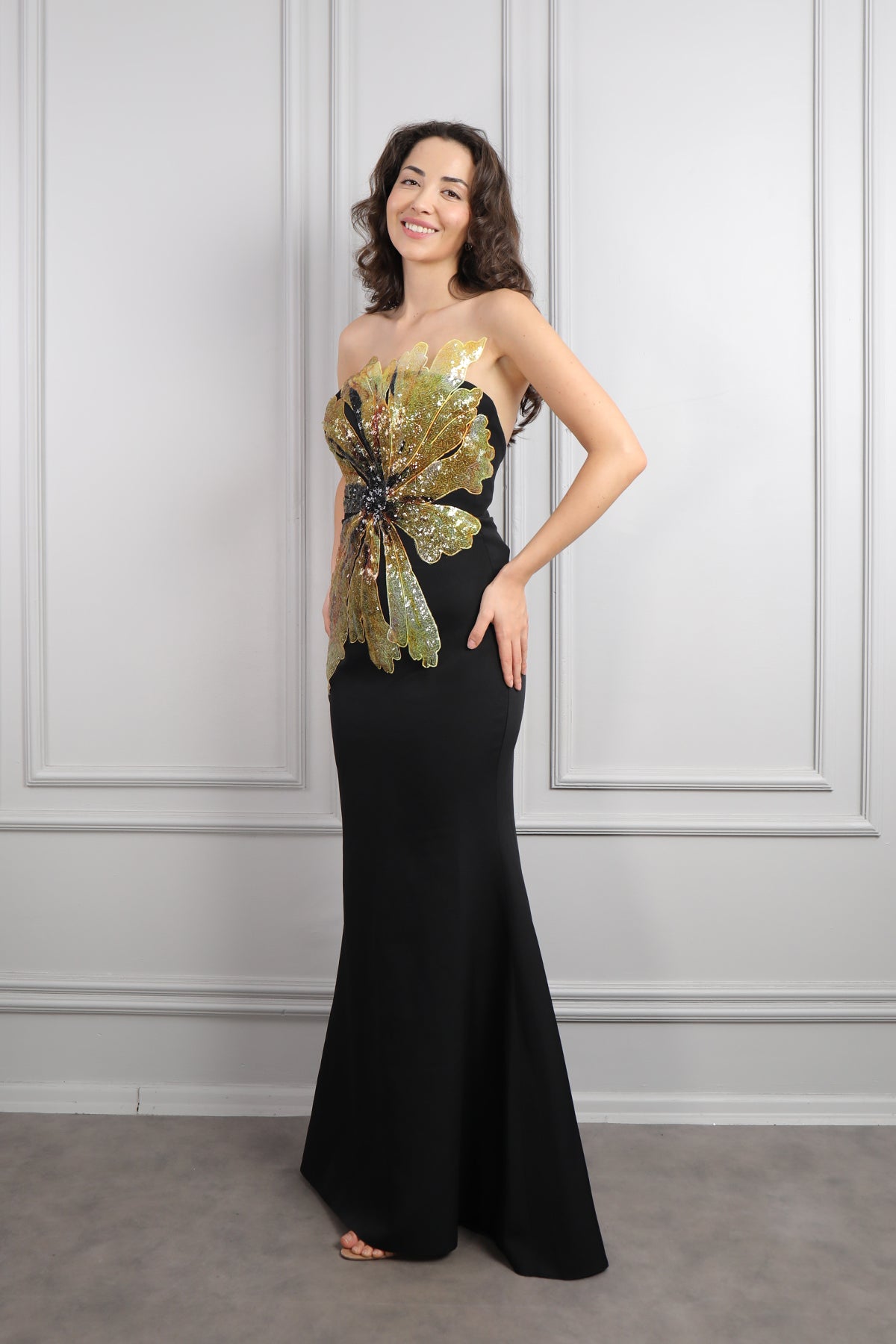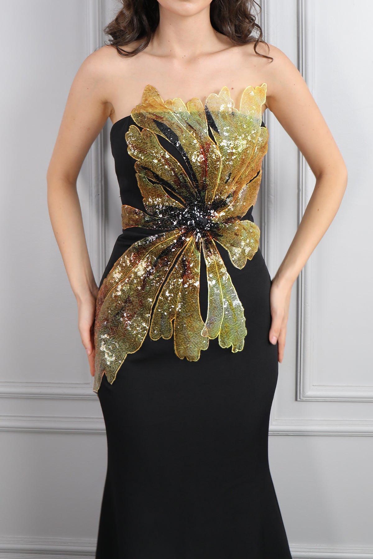 Straplez Önü Çiçek Detaylı Abiye Siyah
