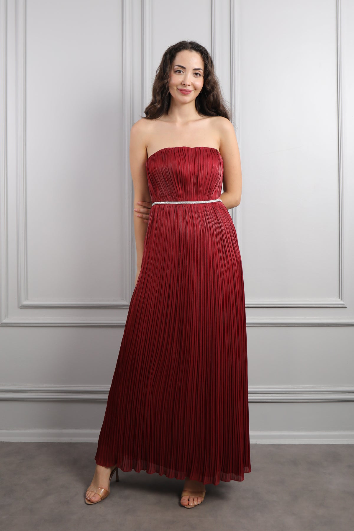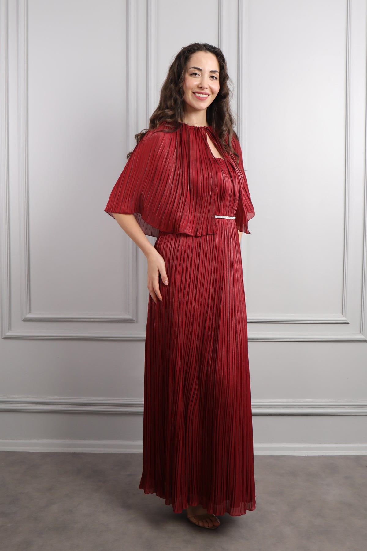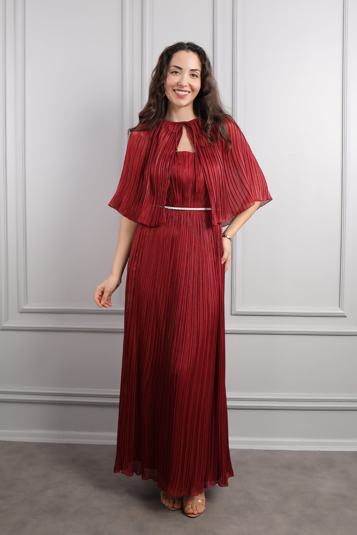 Straplez Pelerin Detaylı Kemeri Taş İşlemeli Pileli Şifon Elbise Bordo Özellikleri