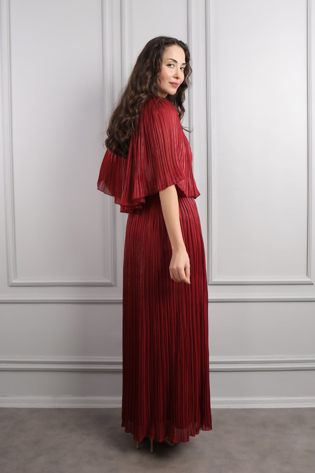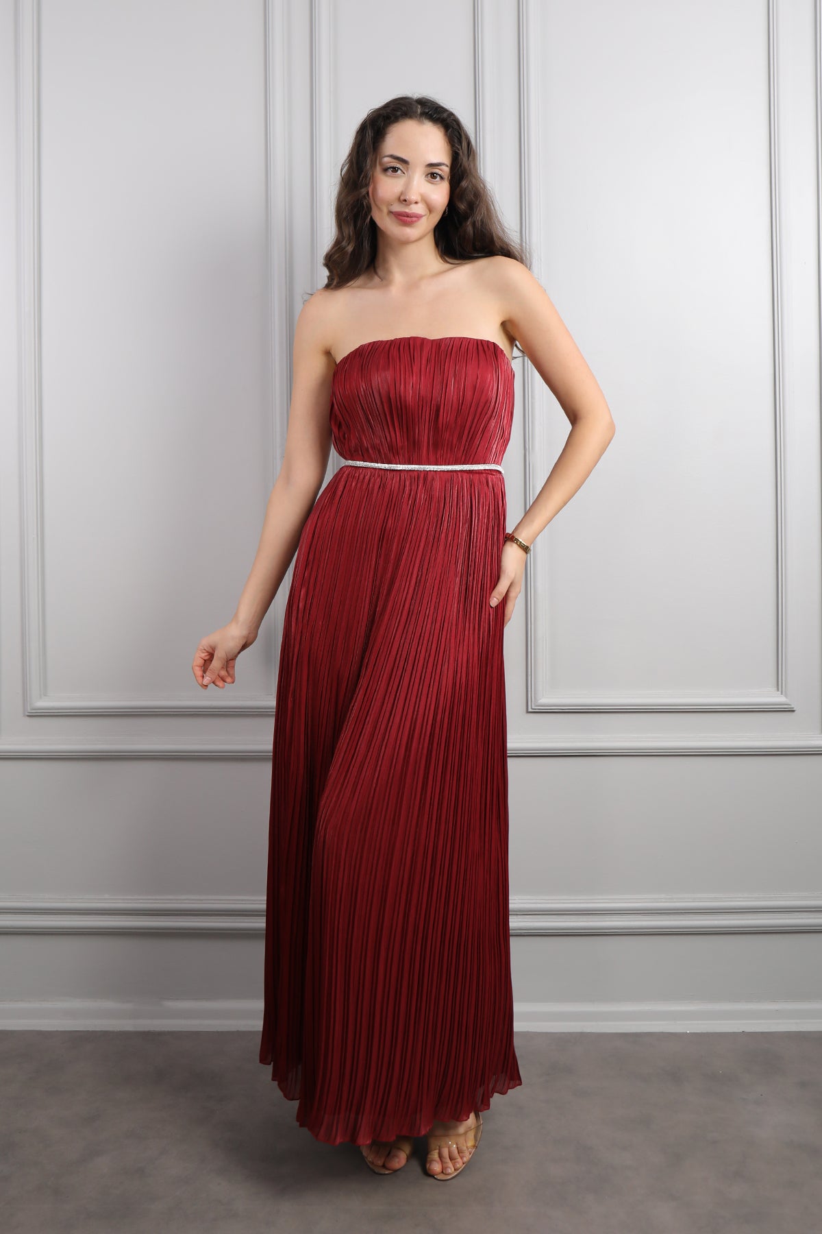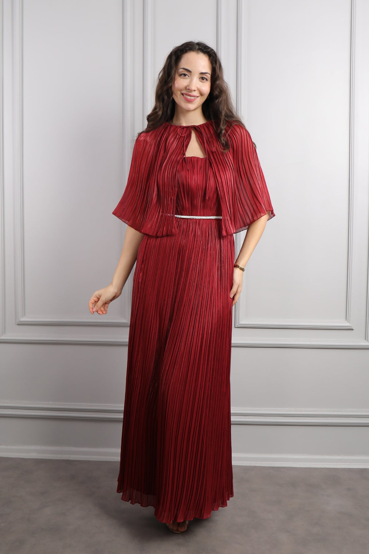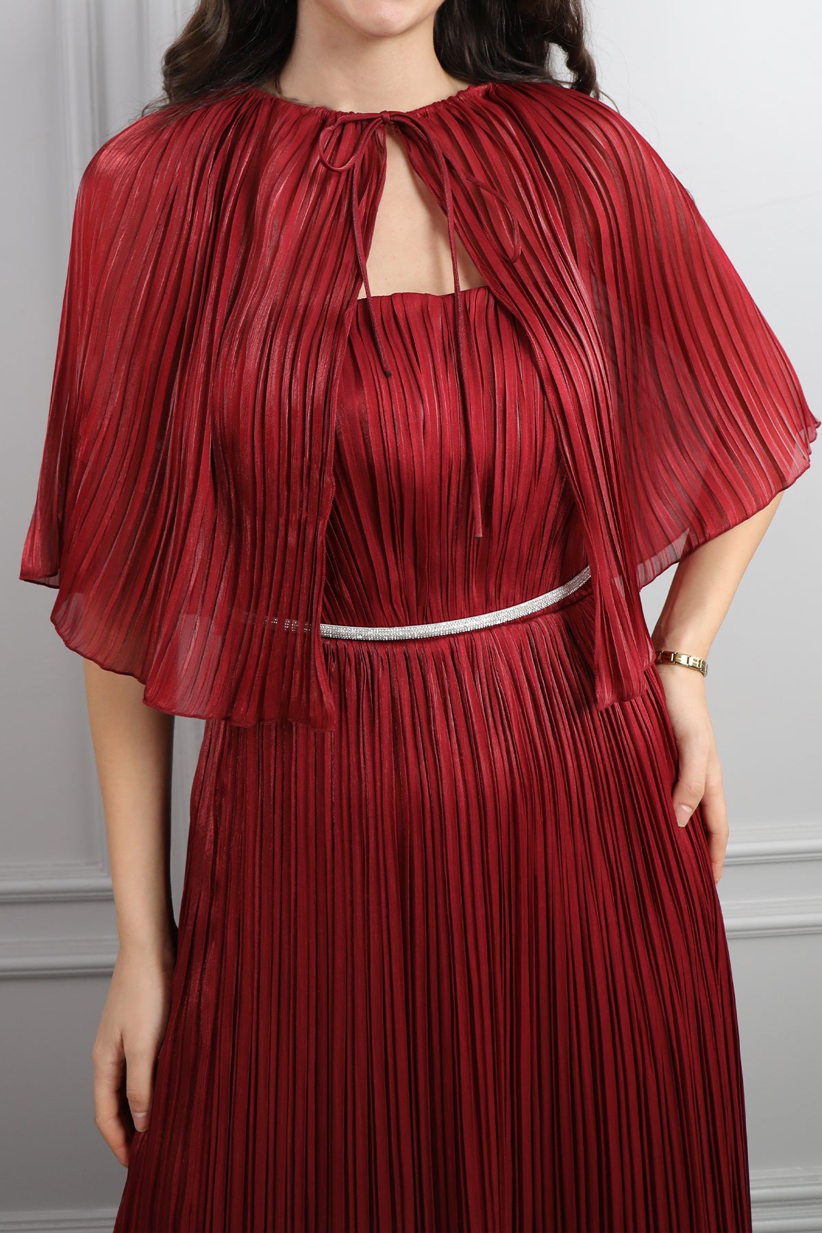 Straplez Pelerin Detaylı Kemeri Taş İşlemeli Pileli Şifon Elbise Bordo