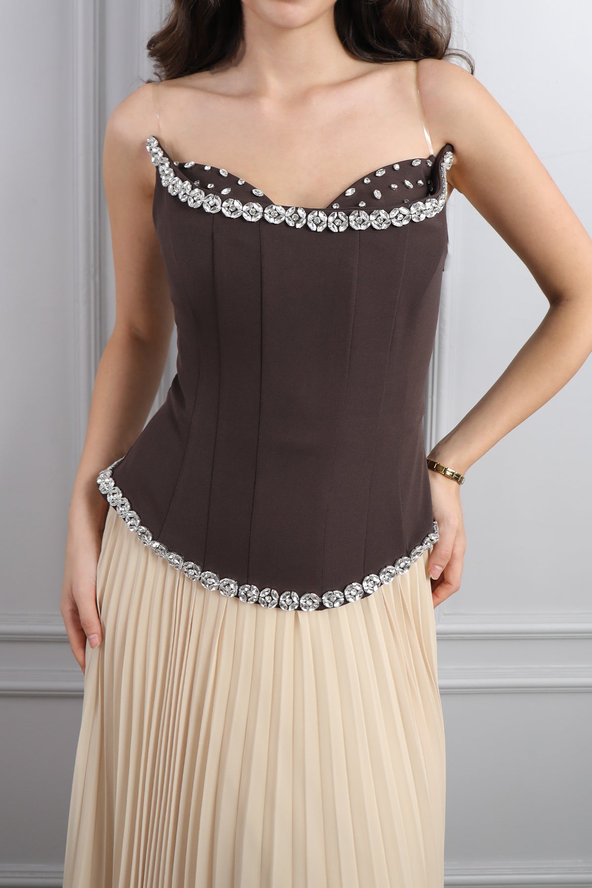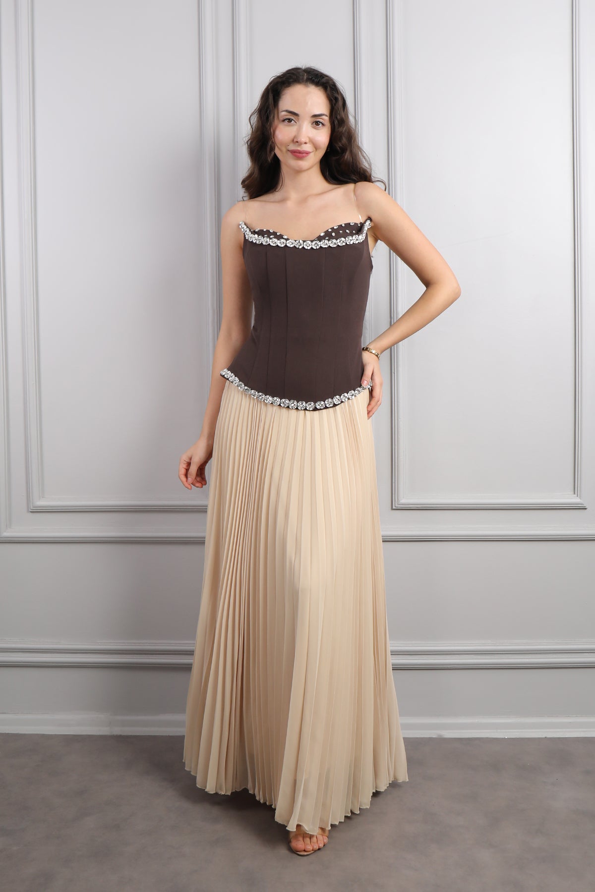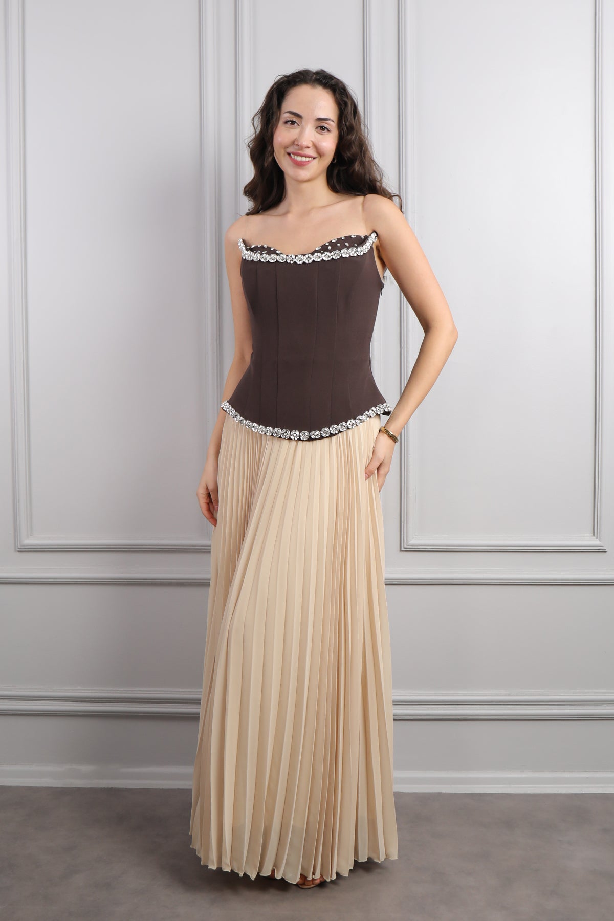 Straplez Taş Detaylı Eteği Pileli Abiye Bej-Kahve