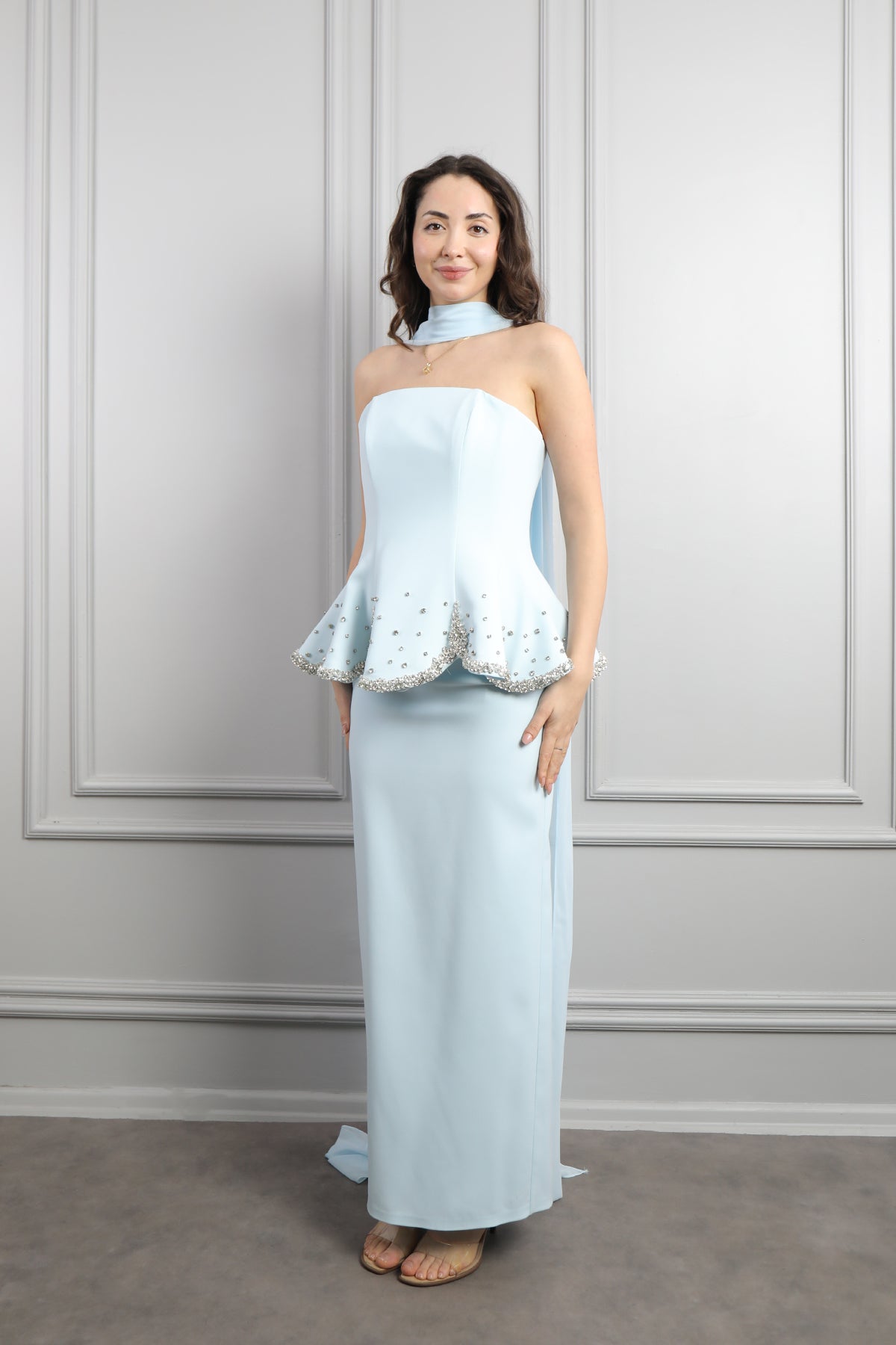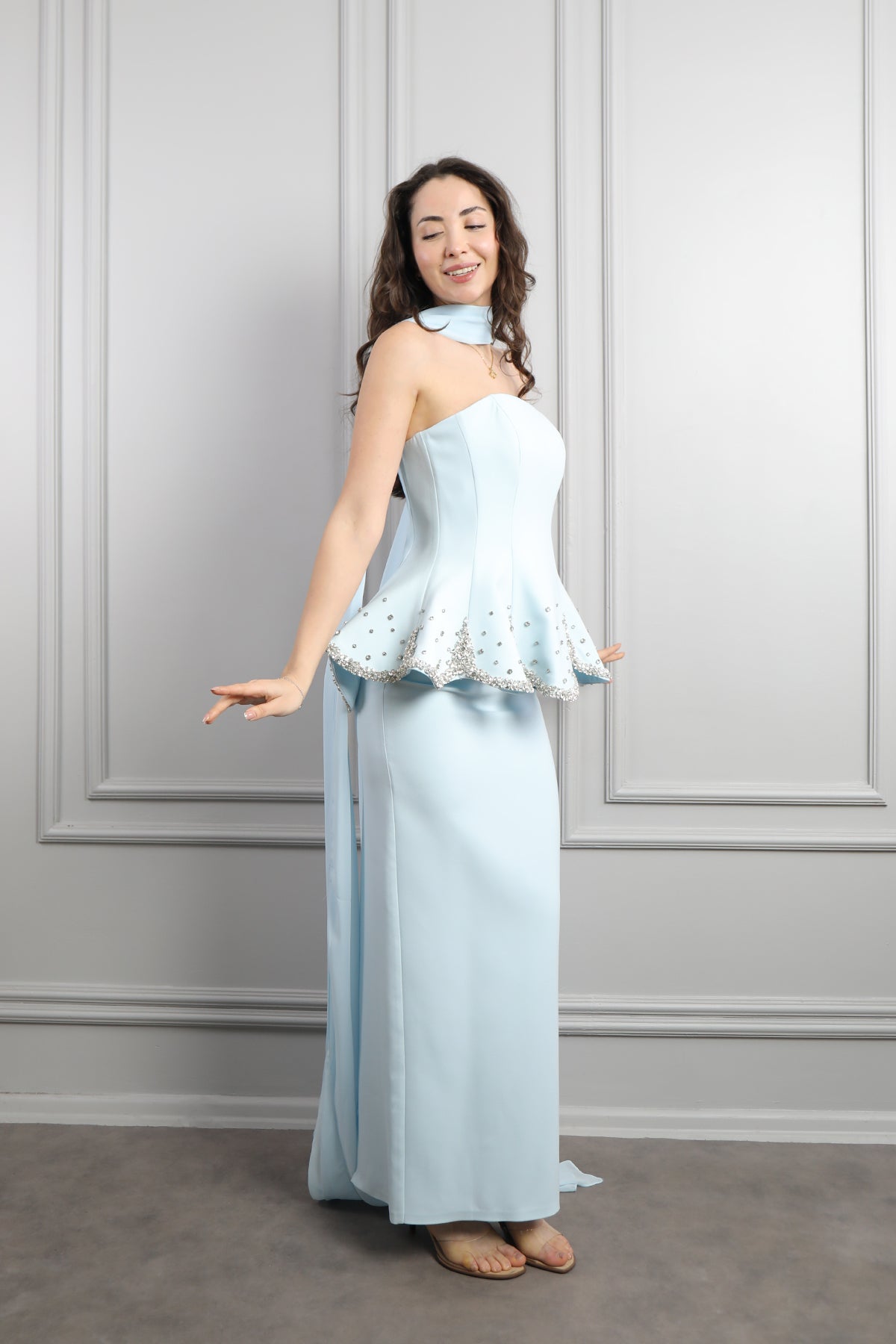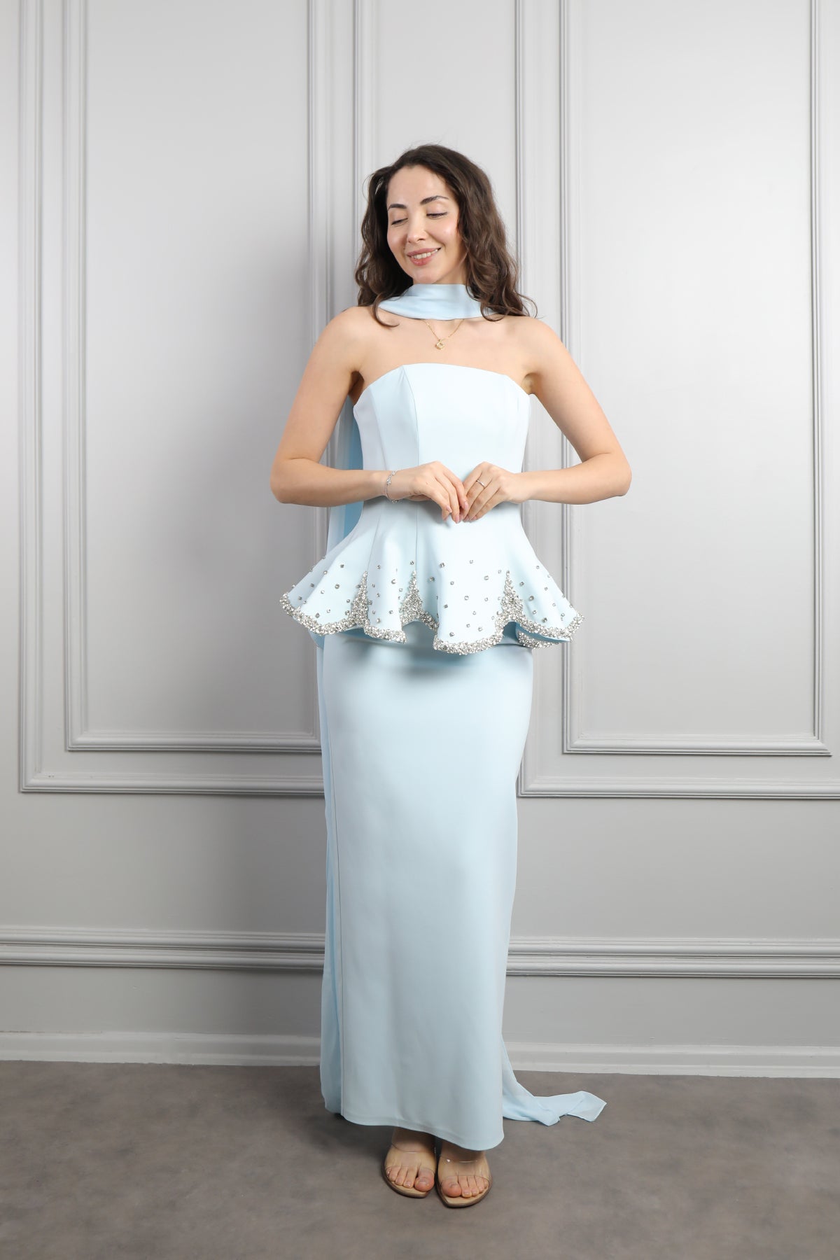 Straplez Taş İşlemeli Fular Detaylı Abiye Mavi Özellikleri