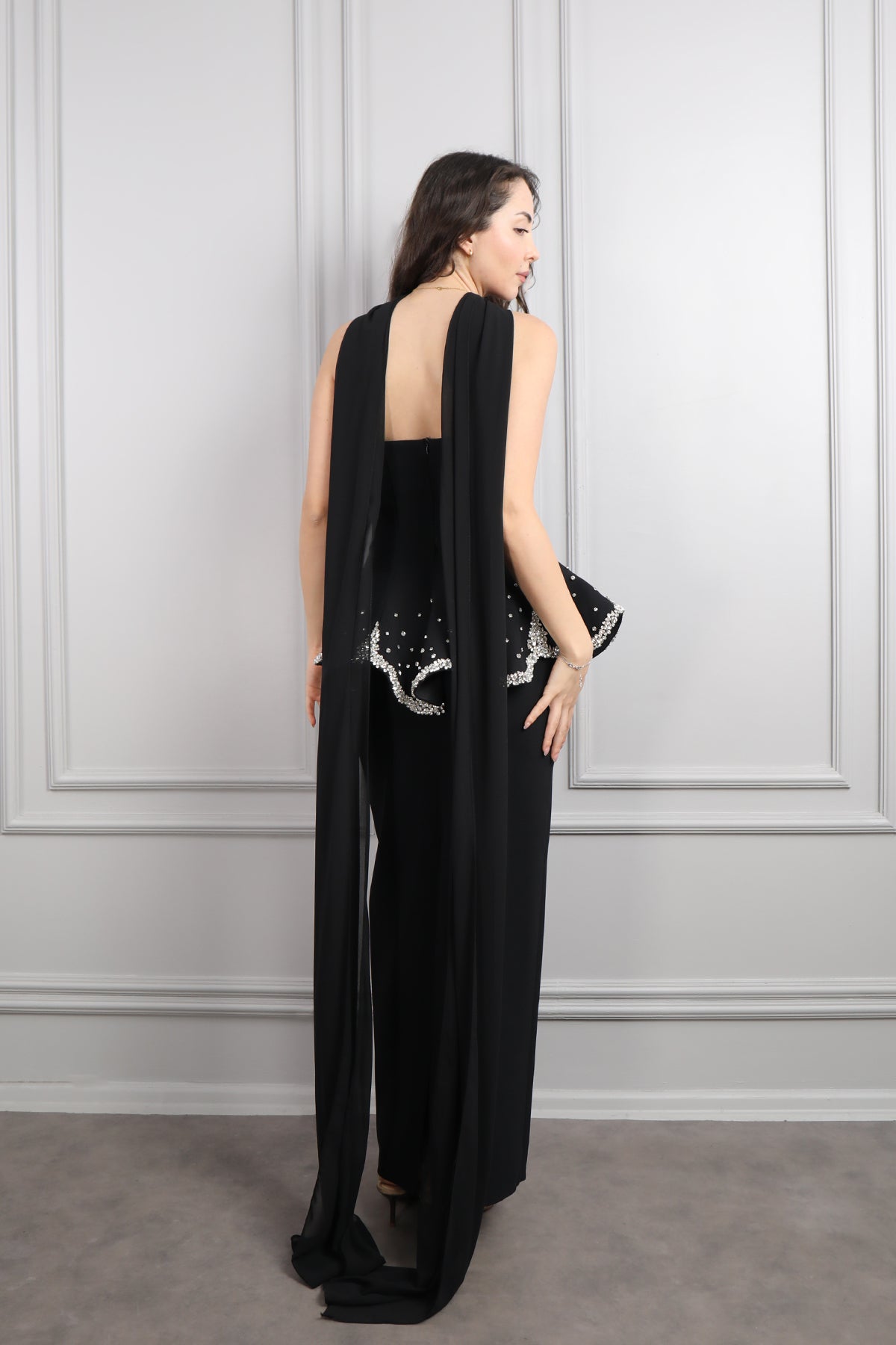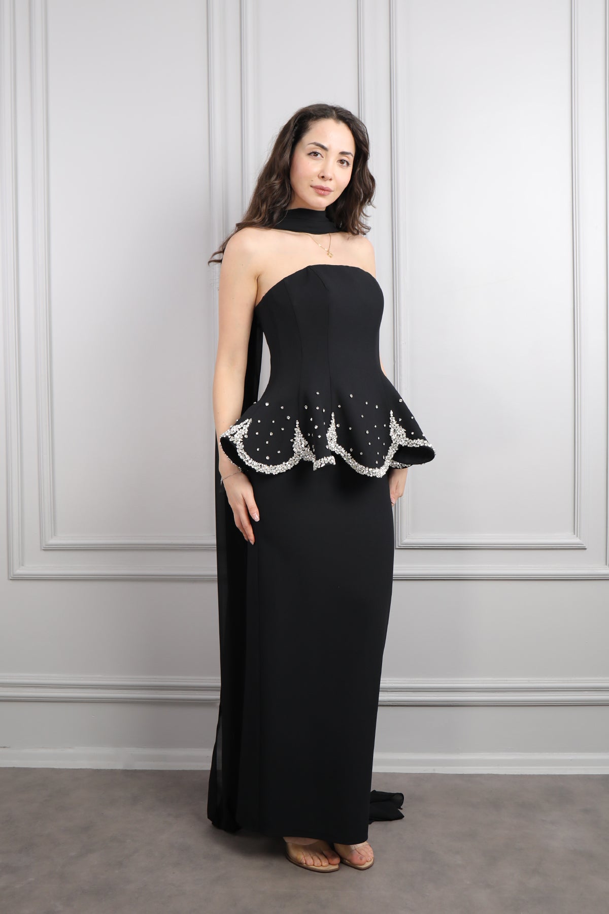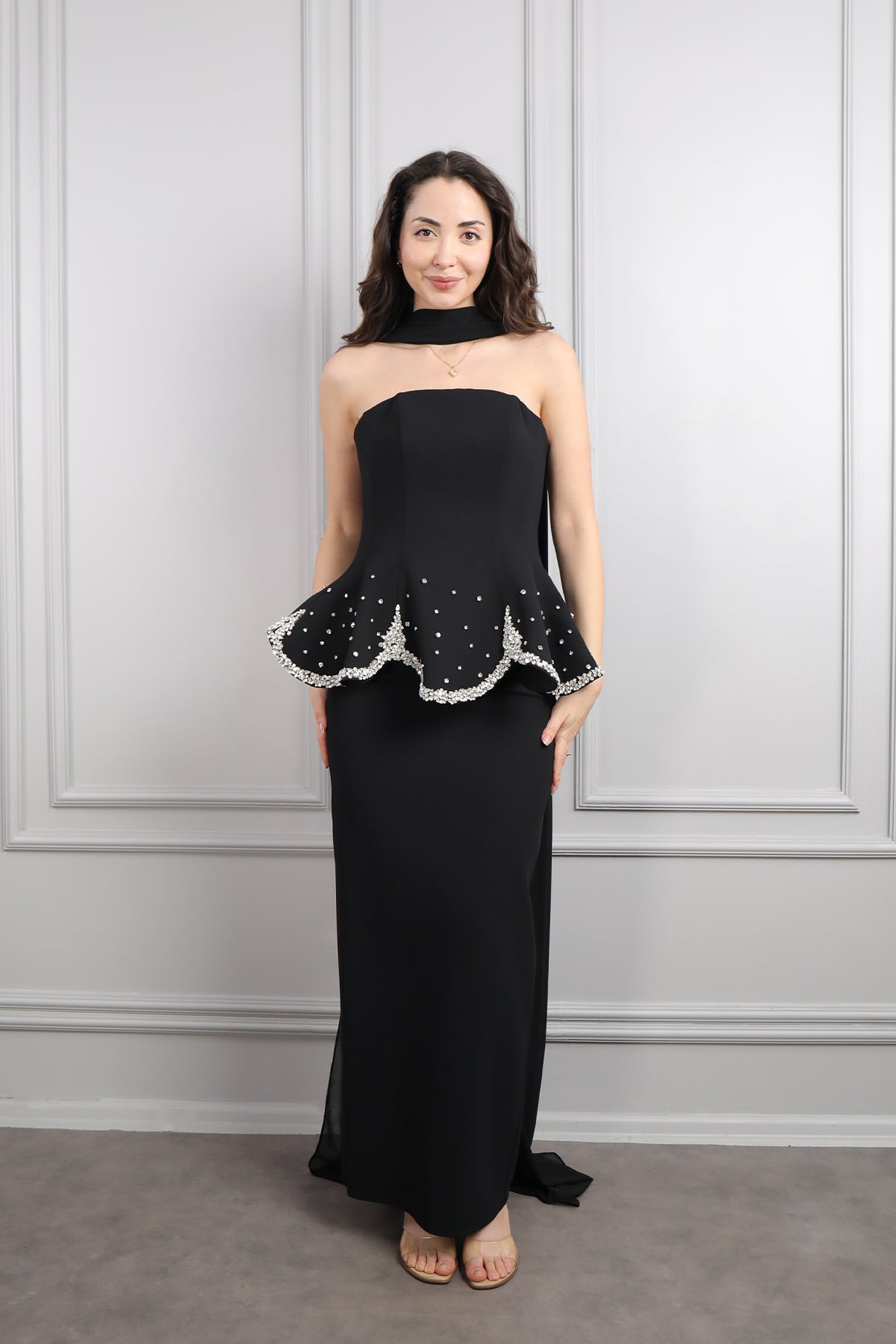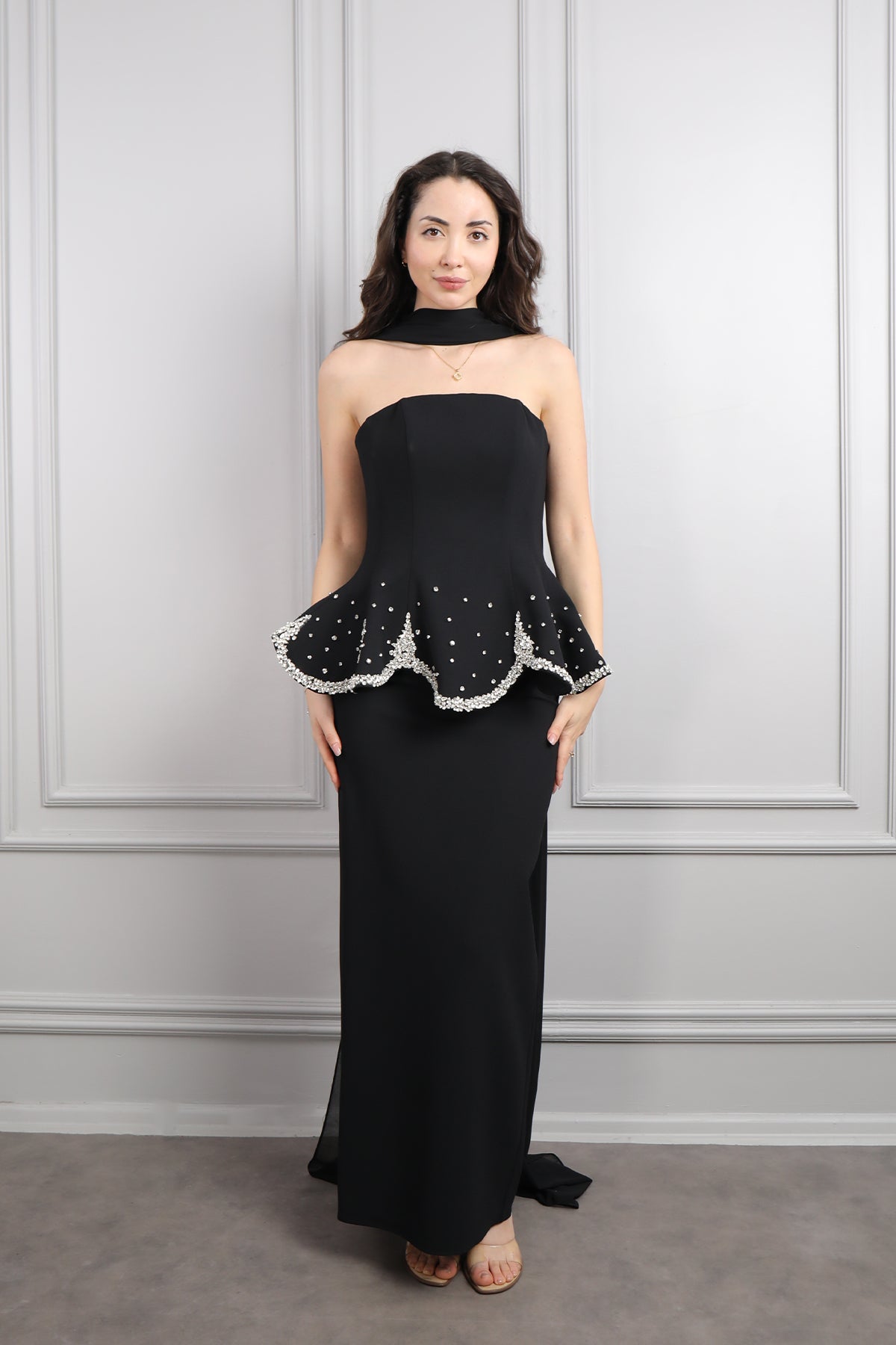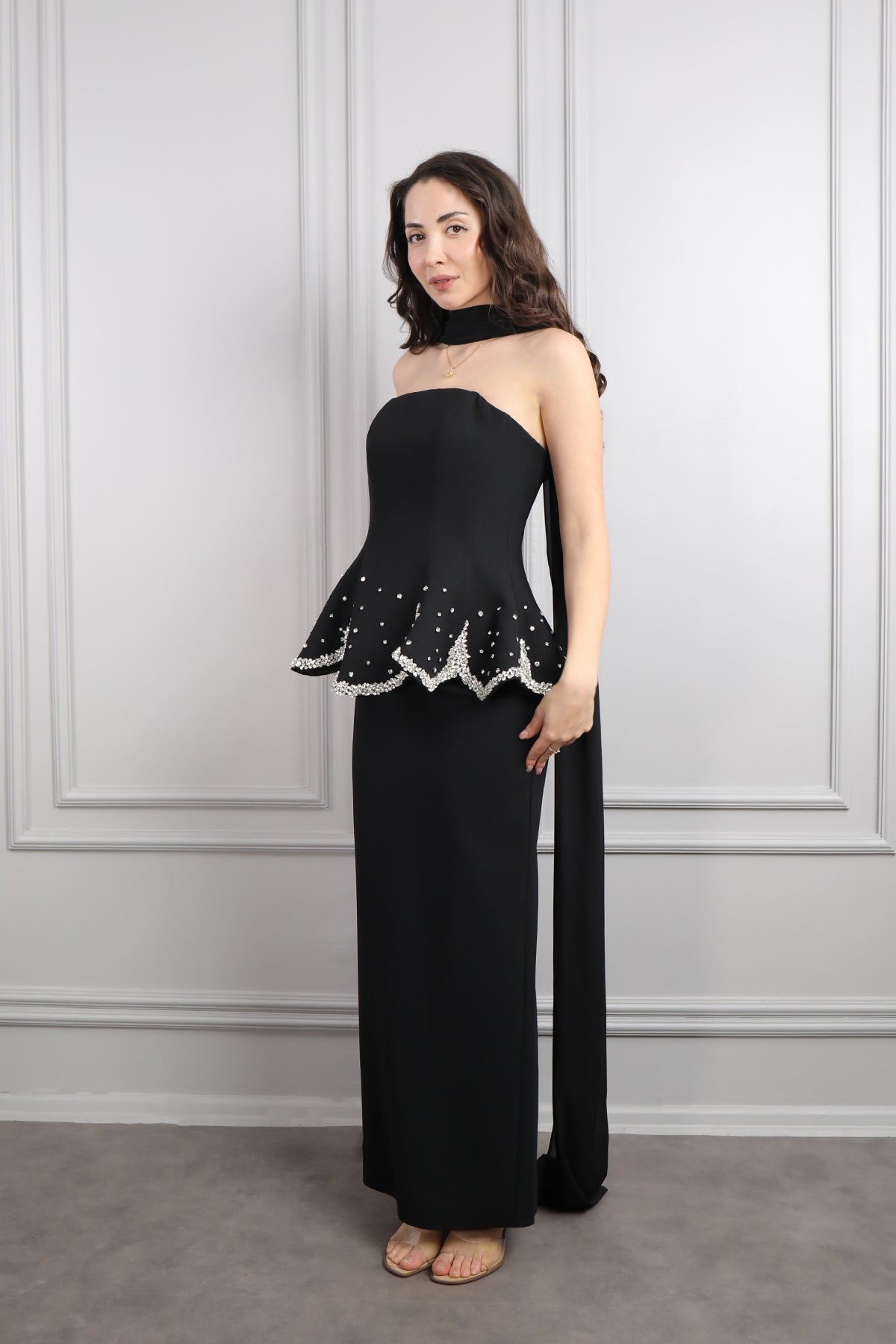 Straplez Taş İşlemeli Fular Detaylı Abiye Siyah