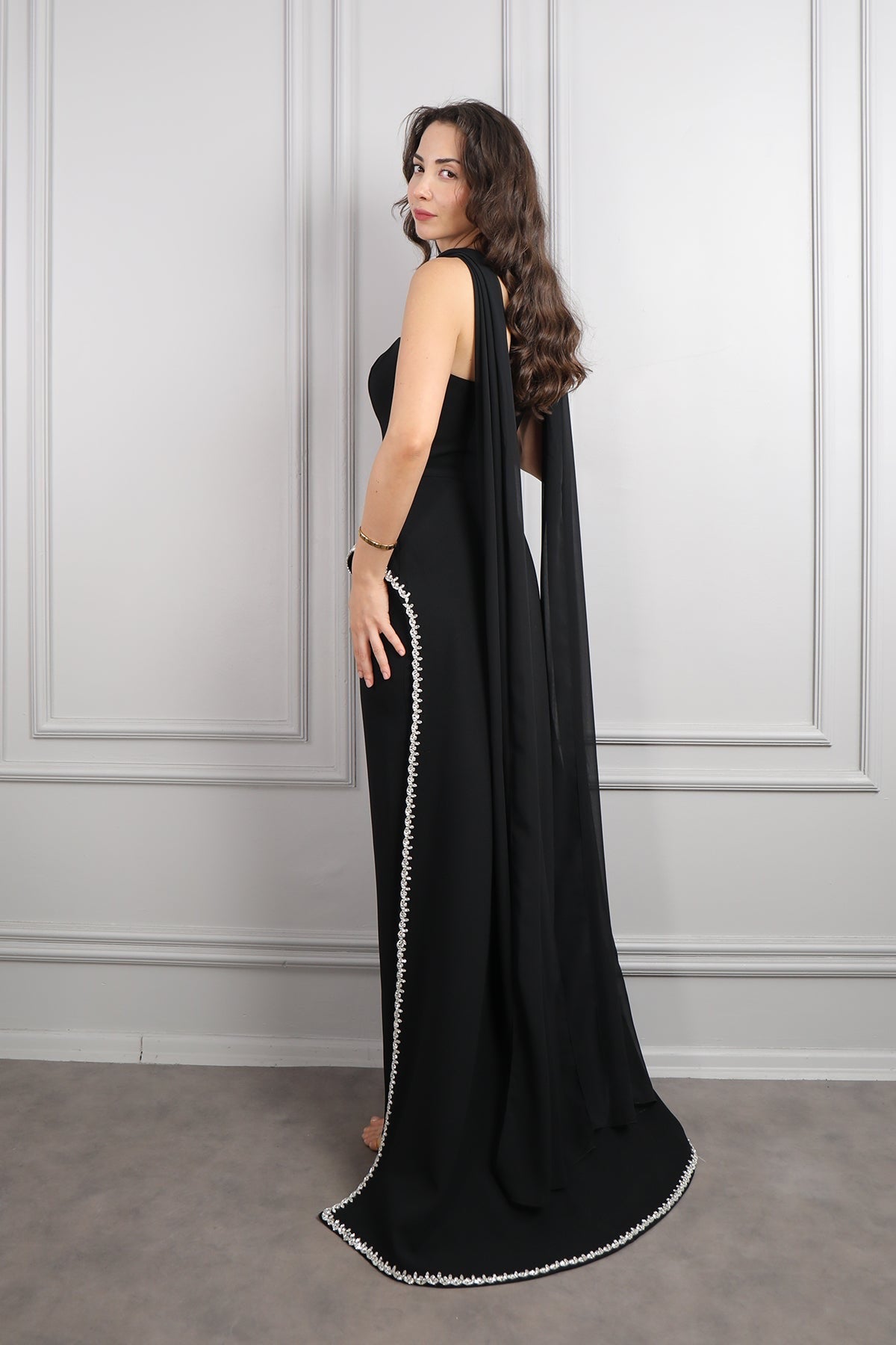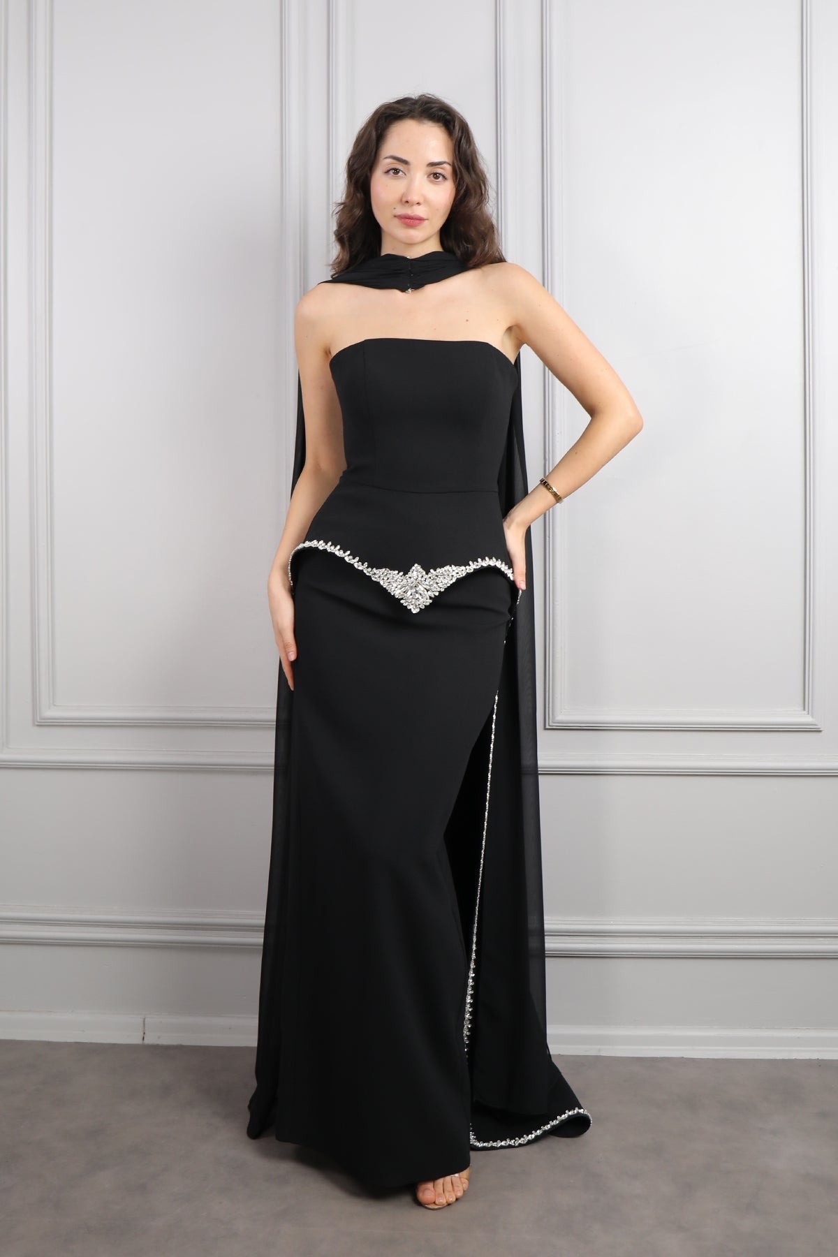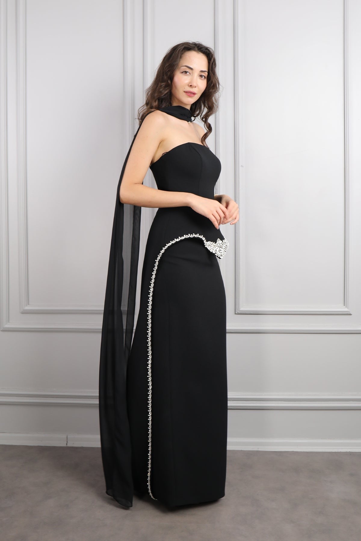 Straplez Taş İşlemeli Fular Detaylı Pelerinli Abiye Siyah