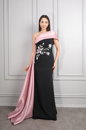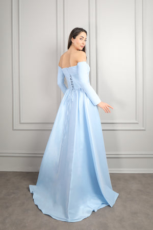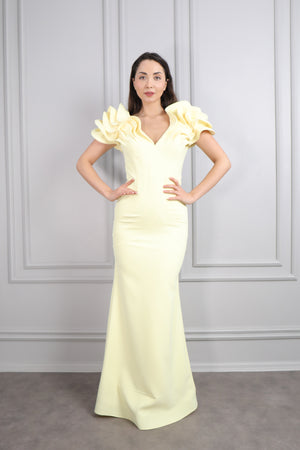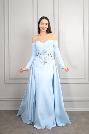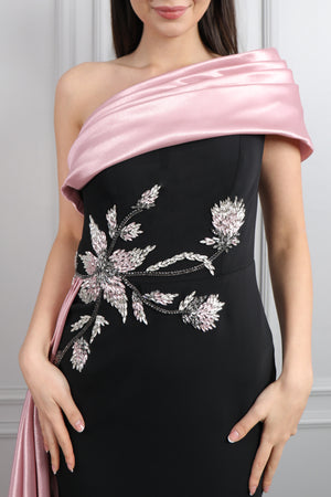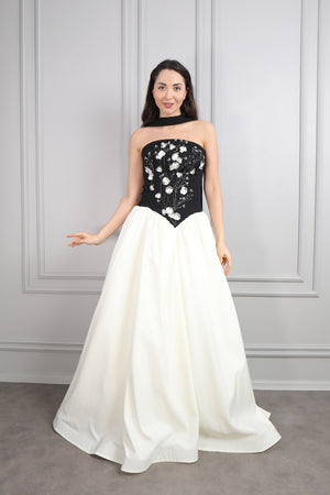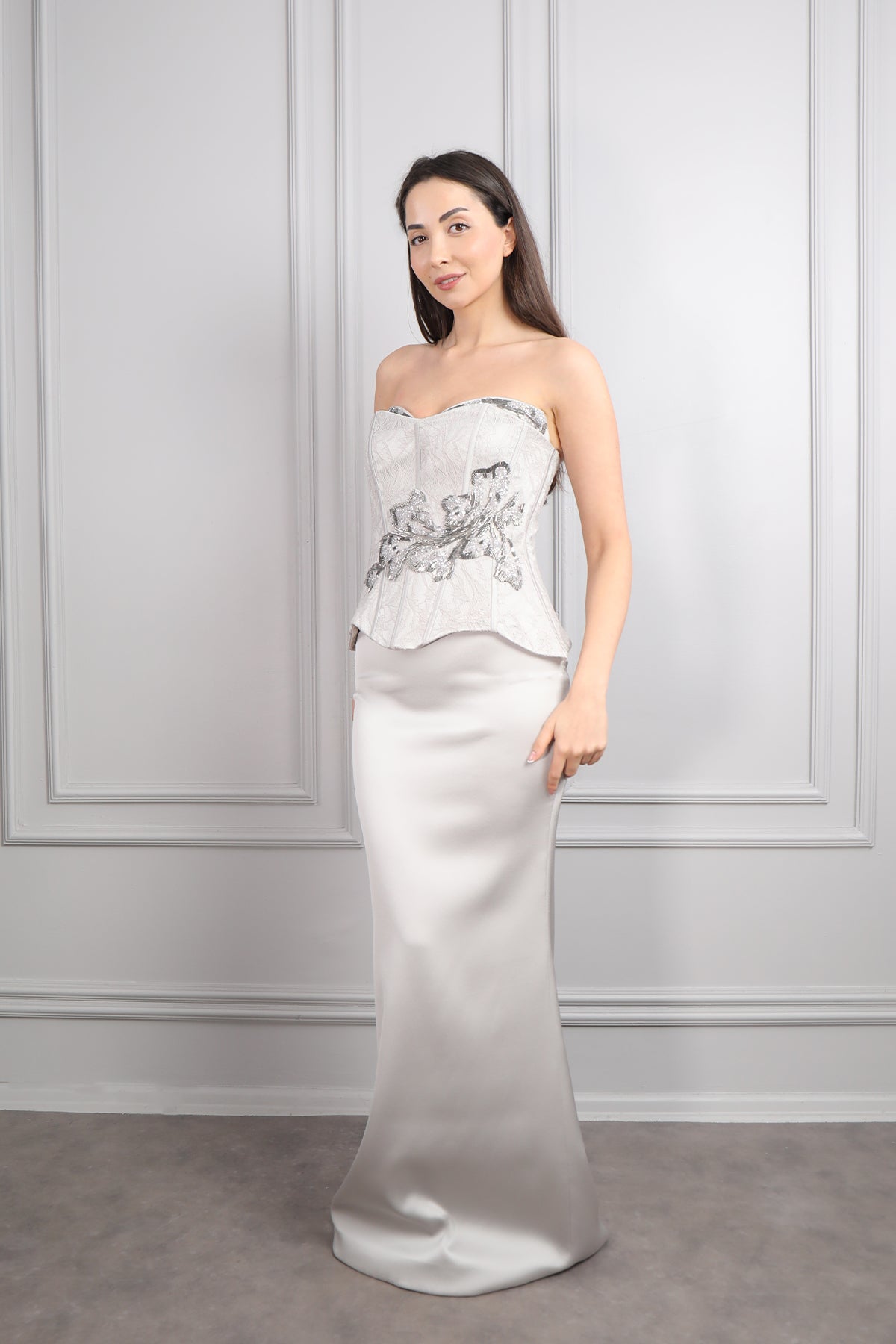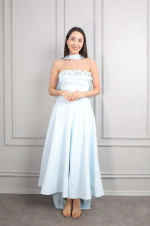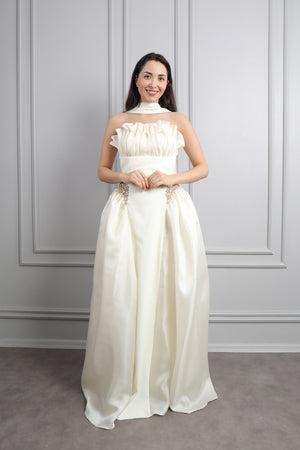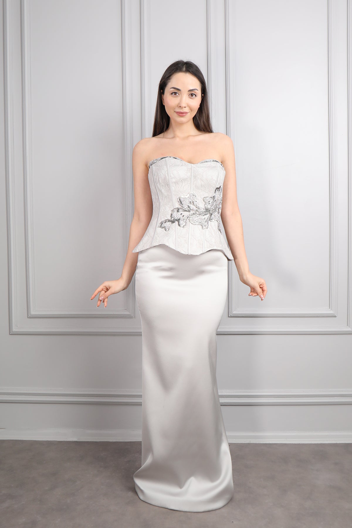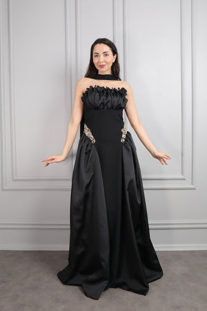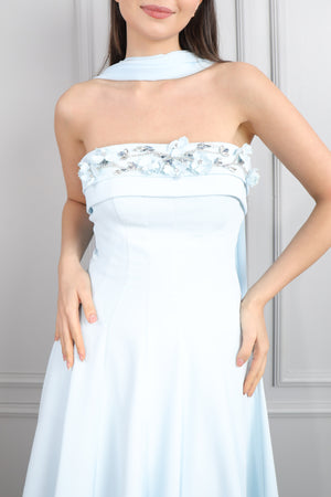 Straplez Yakası Taş İşlemeli Beli Çiçek Detaylı Balık Abiye Taş