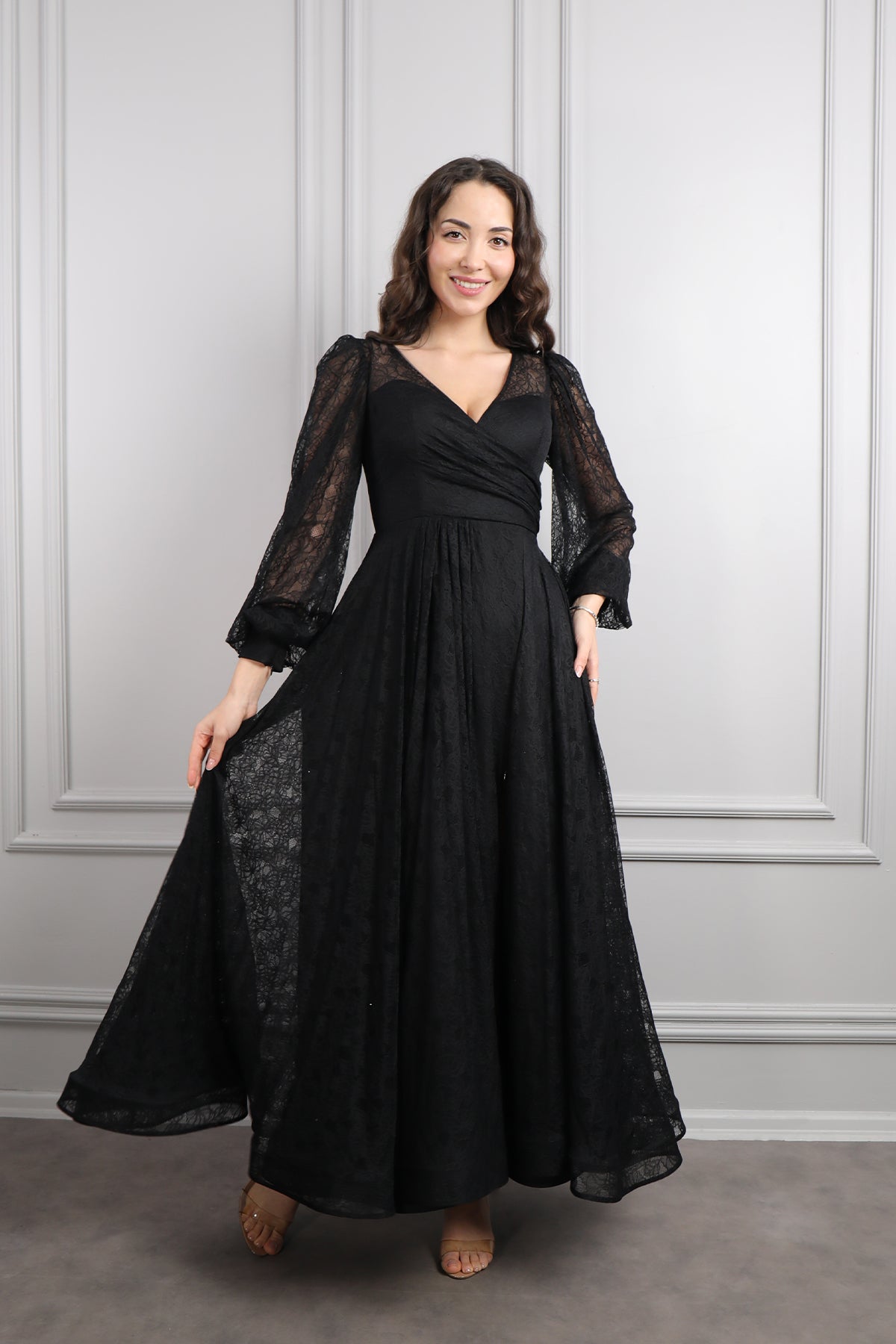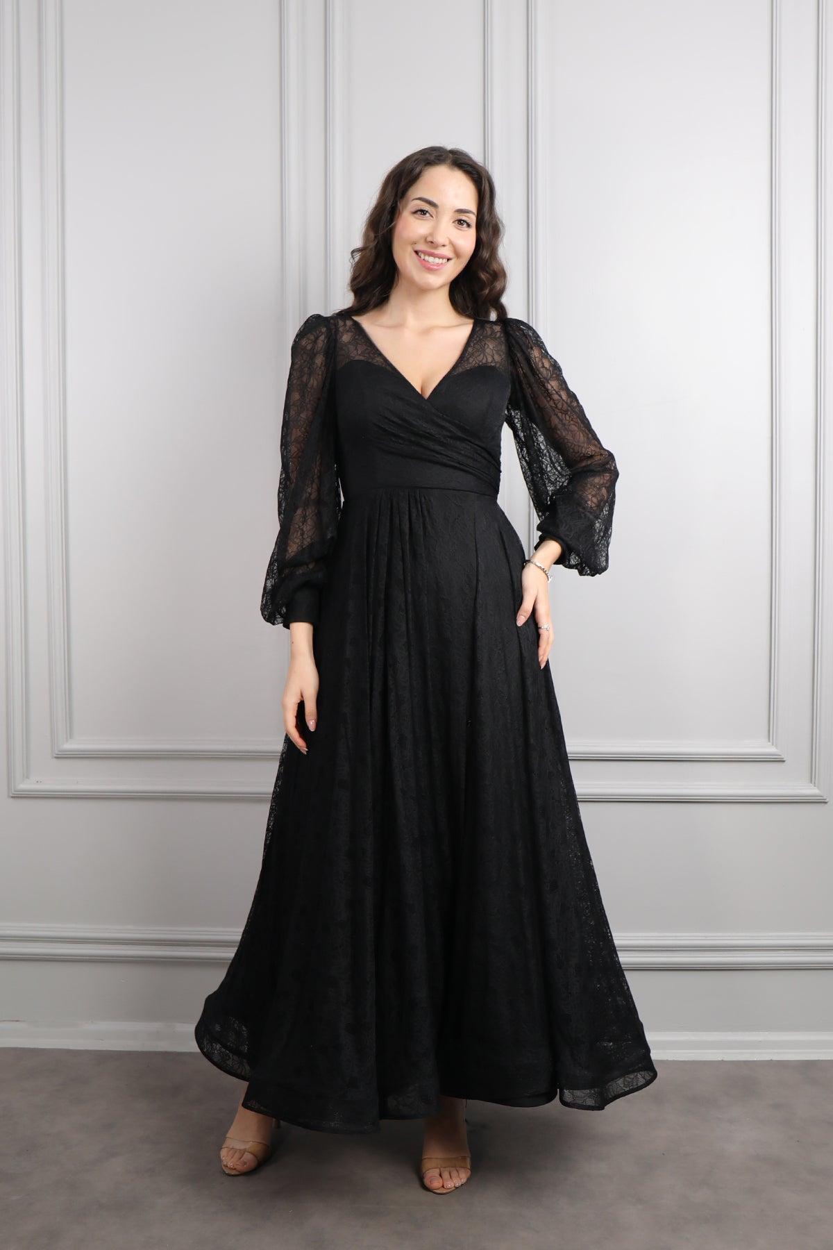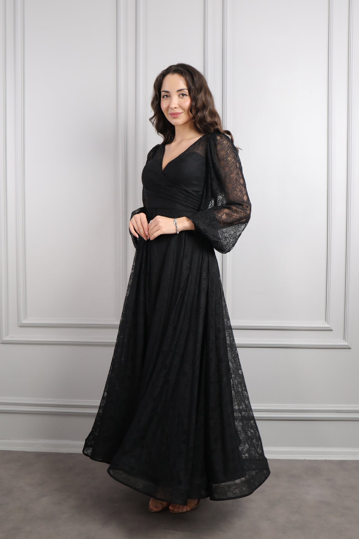 V Yaka Balon Kol Yırtmaçlı Büyük Beden Midi Boy Abiye Siyah Özellikleri