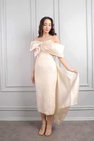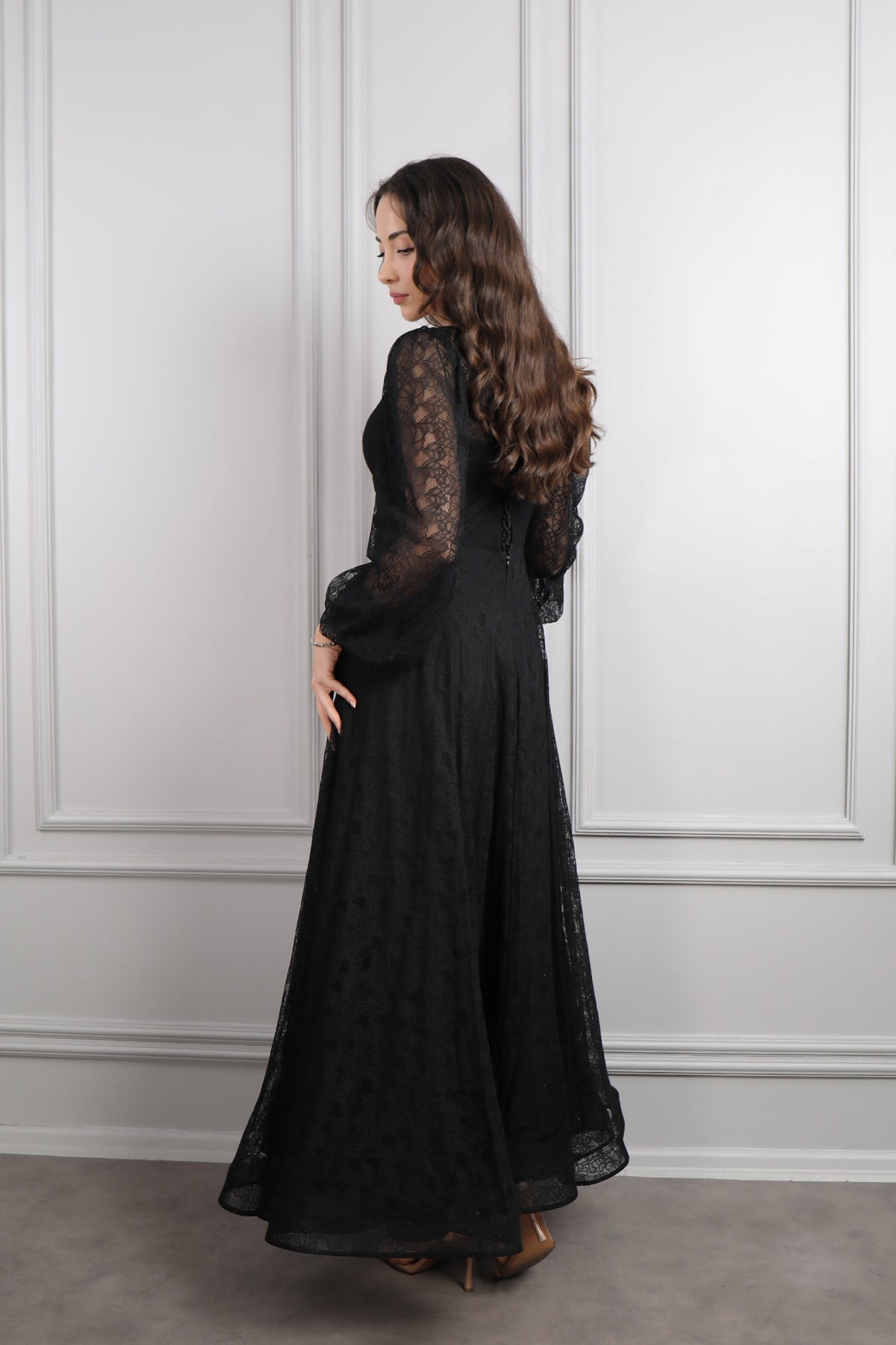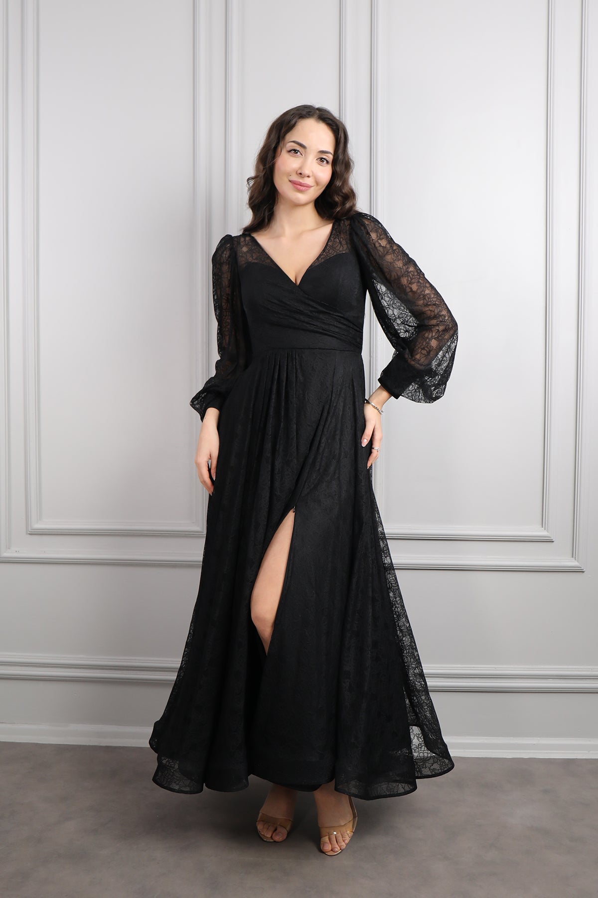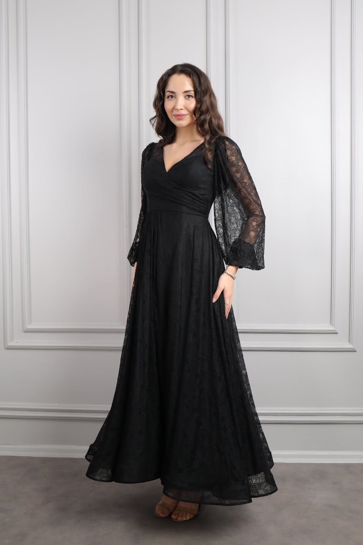 V Yaka Balon Kol Yırtmaçlı Büyük Beden Midi Boy Abiye Siyah Özellikleri