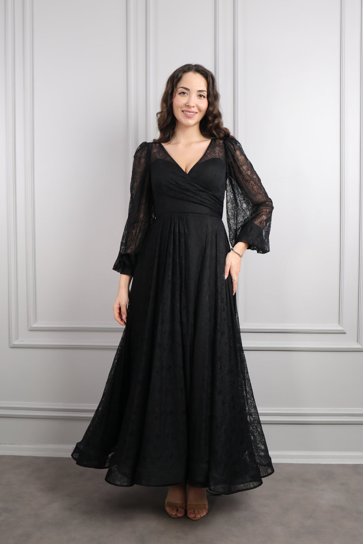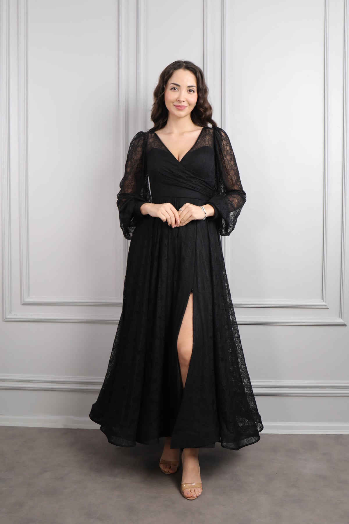 V Yaka Balon Kol Yırtmaçlı Büyük Beden Midi Boy Abiye Siyah