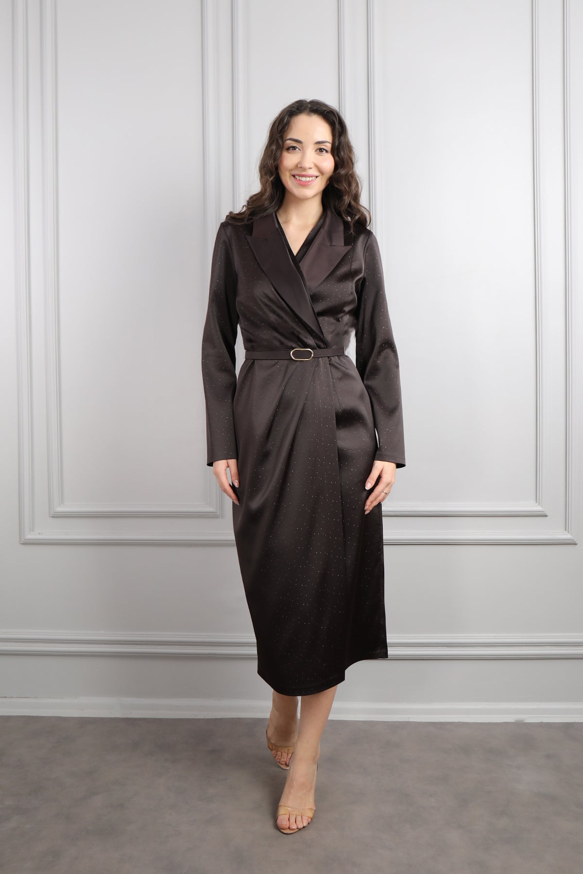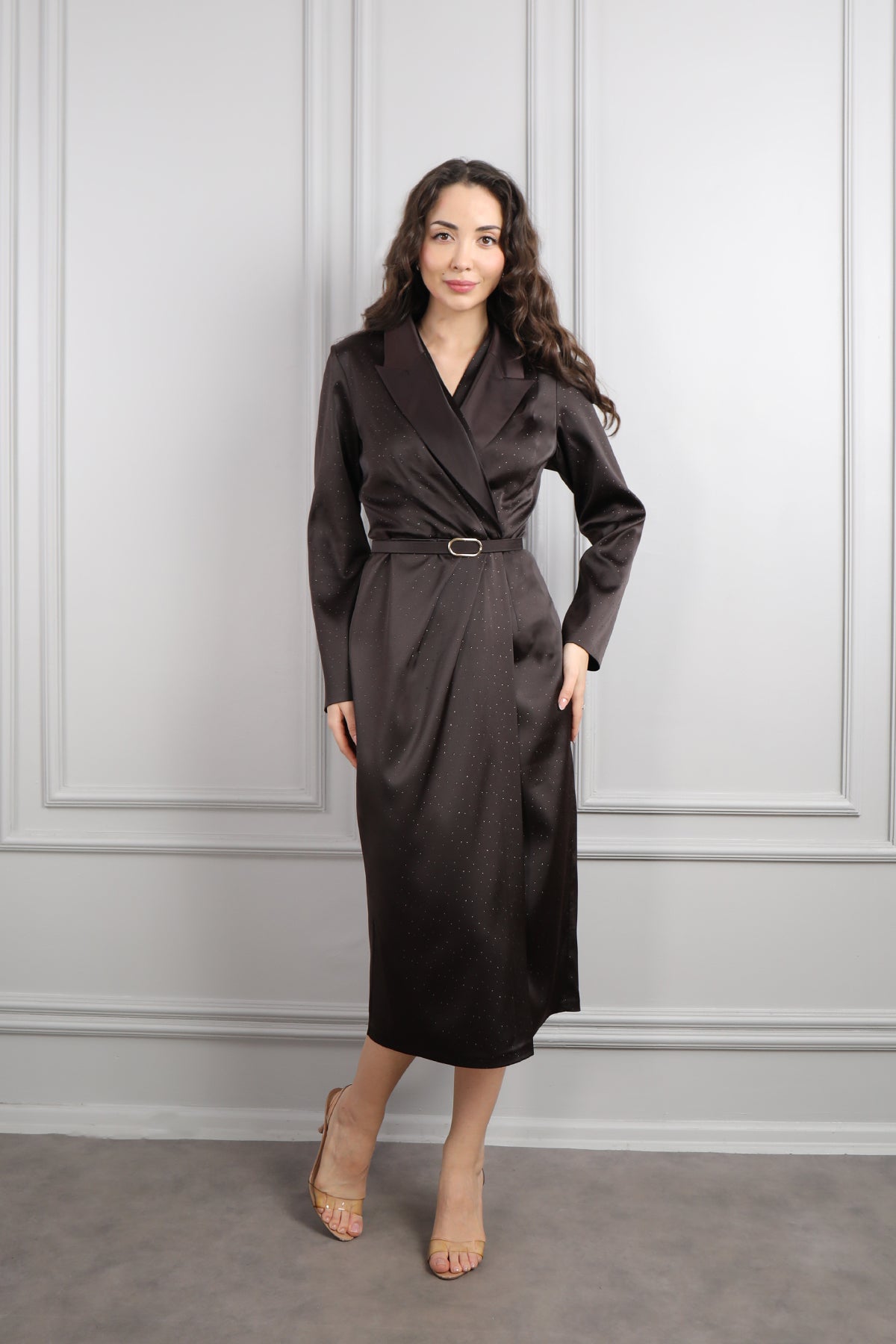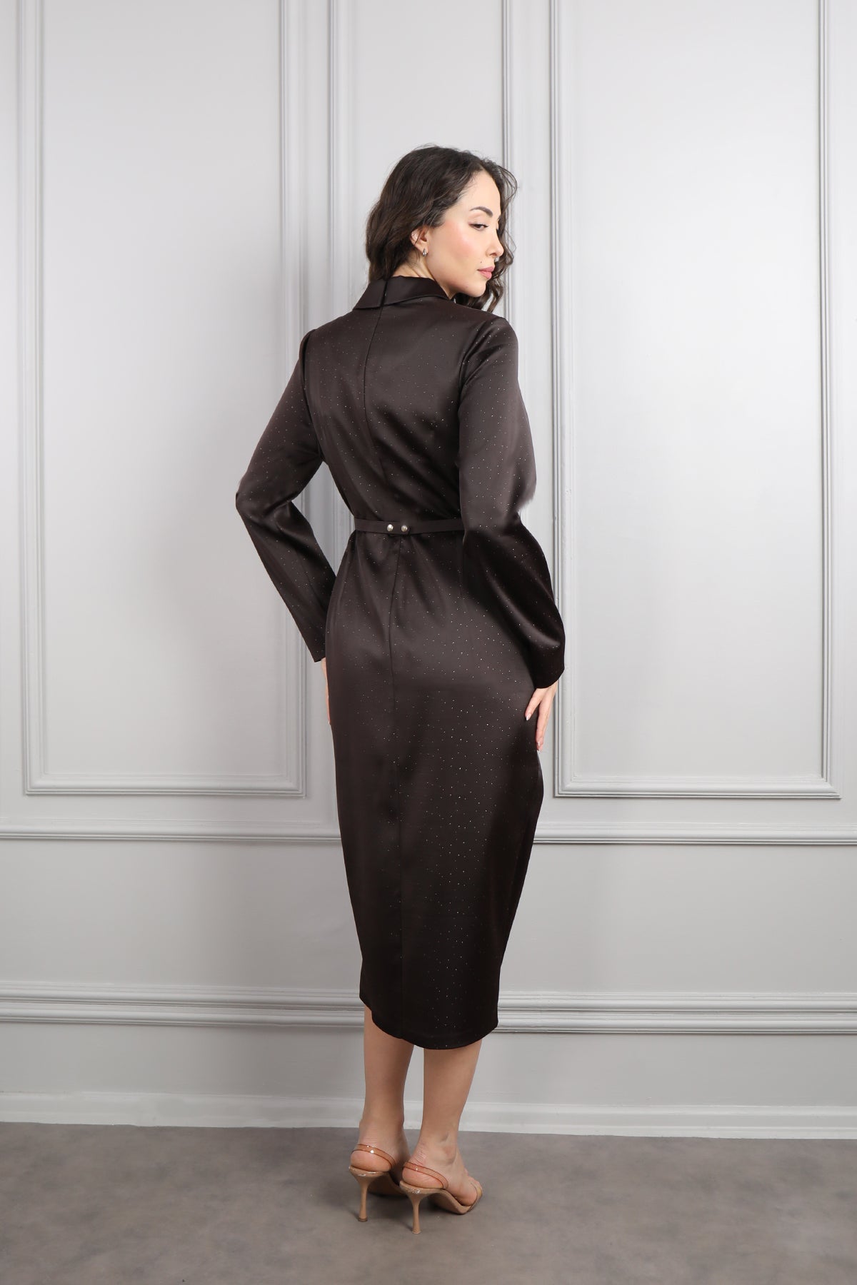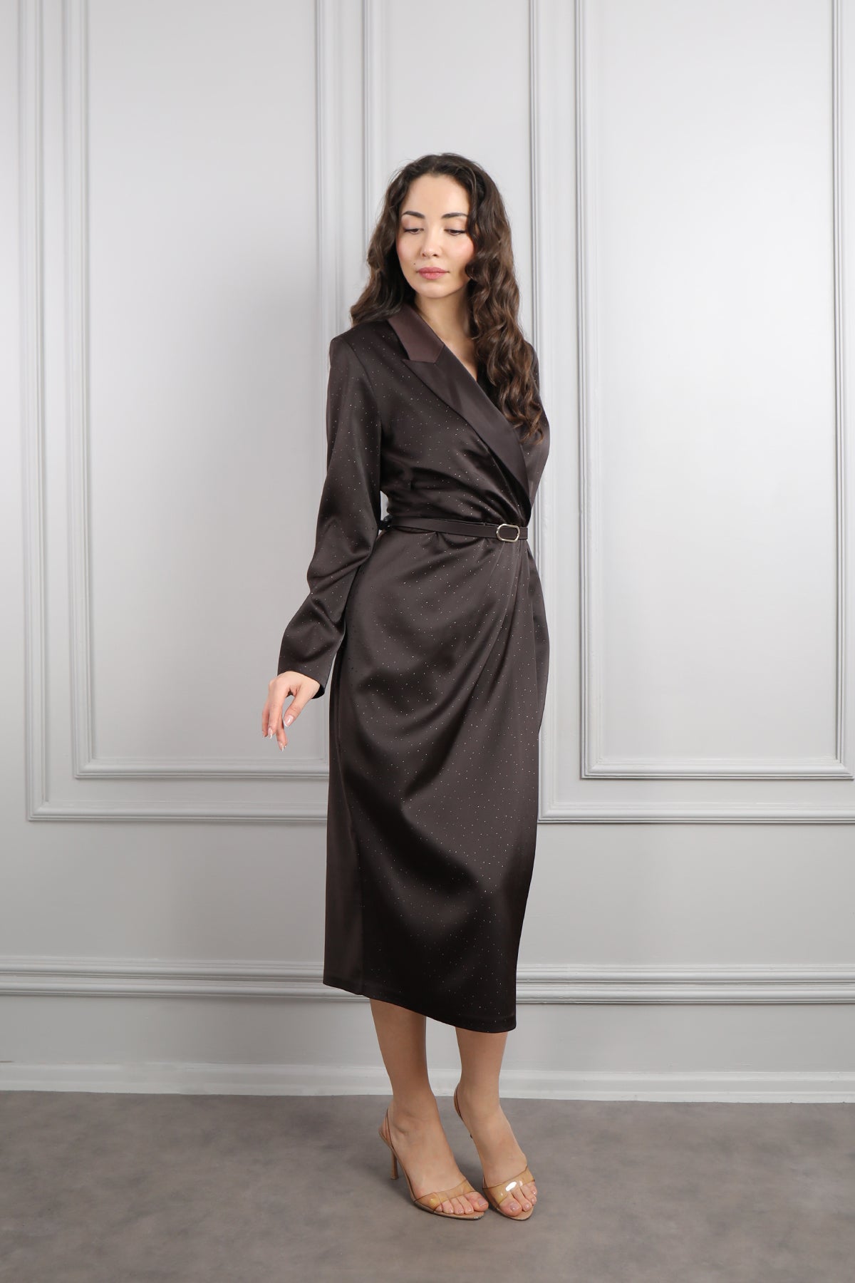 V Yaka Beli Kemerli Büyük Beden Midi Boy Saten Elbise Kahve