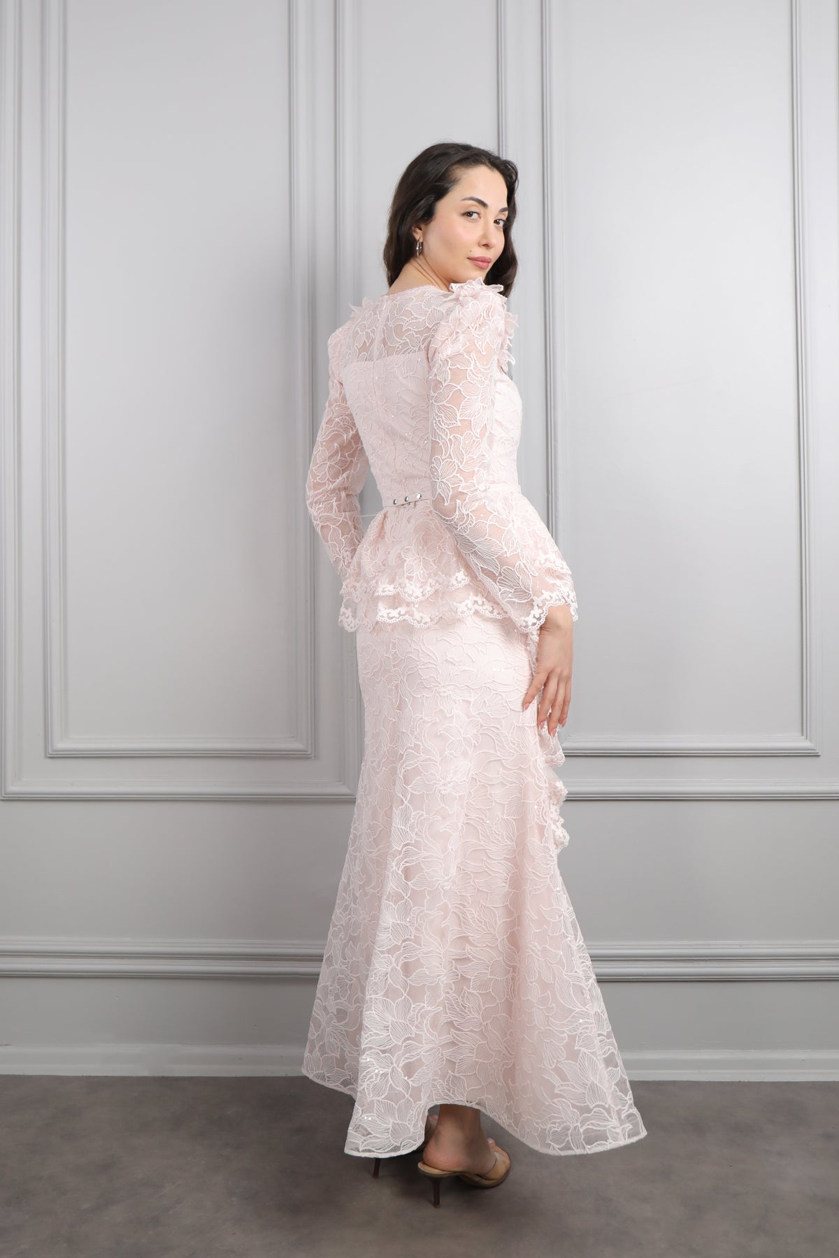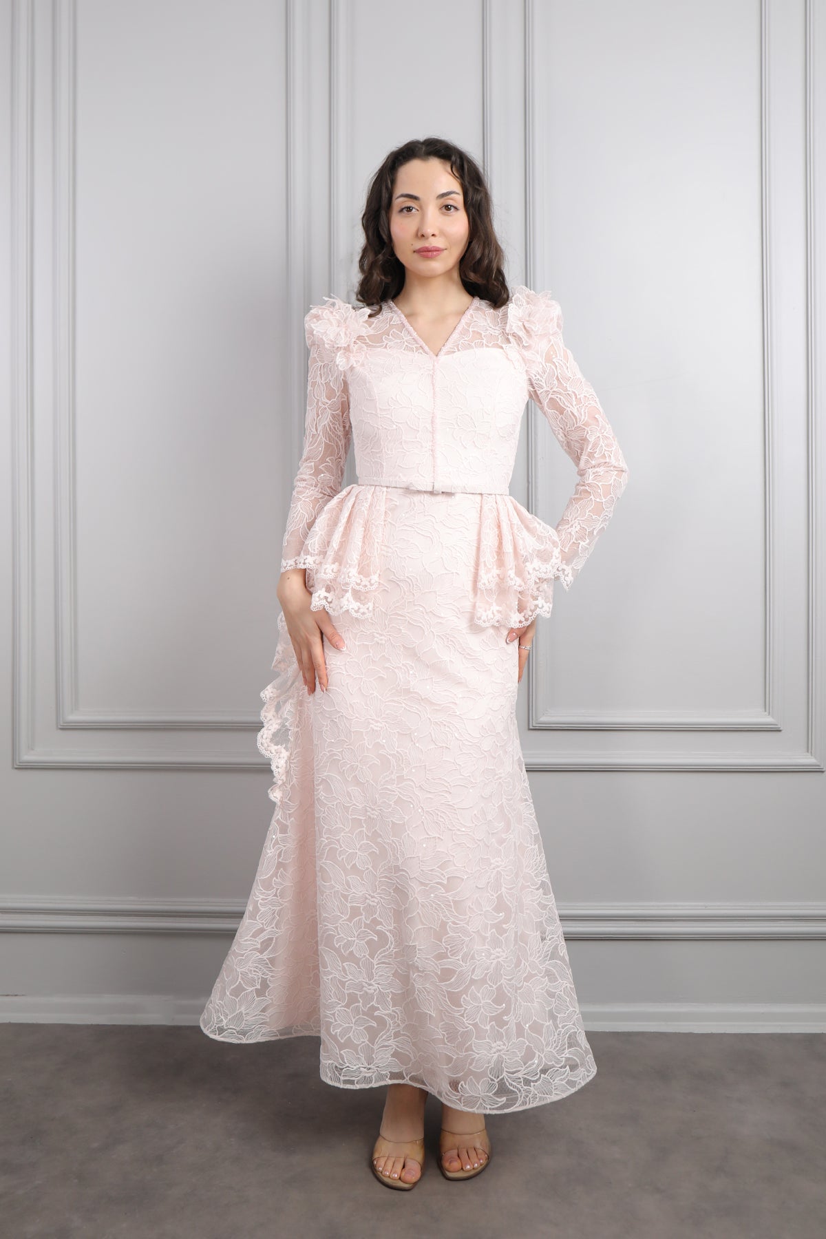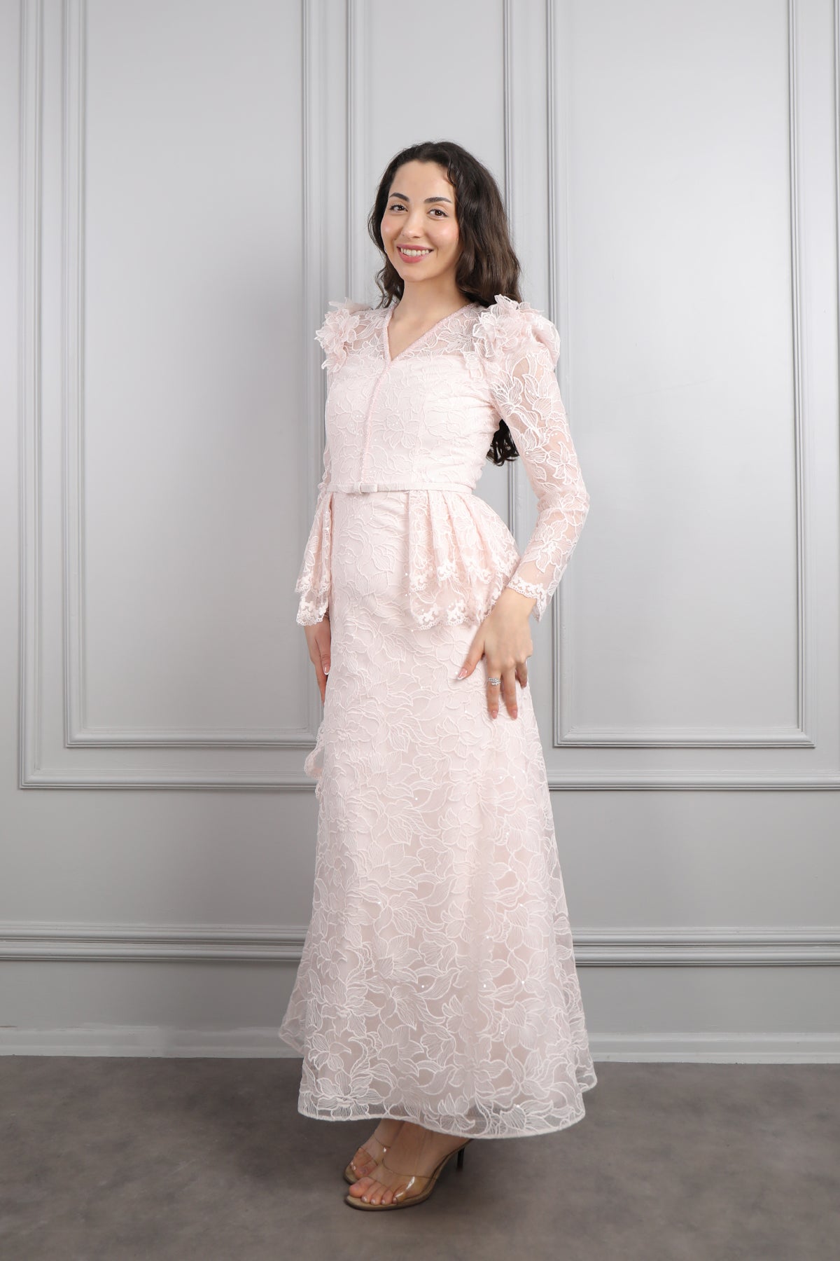 V Yaka Beli Kemerli Omuzu Çiçek Detaylı Dantelli Elbise Pudra Özellikleri