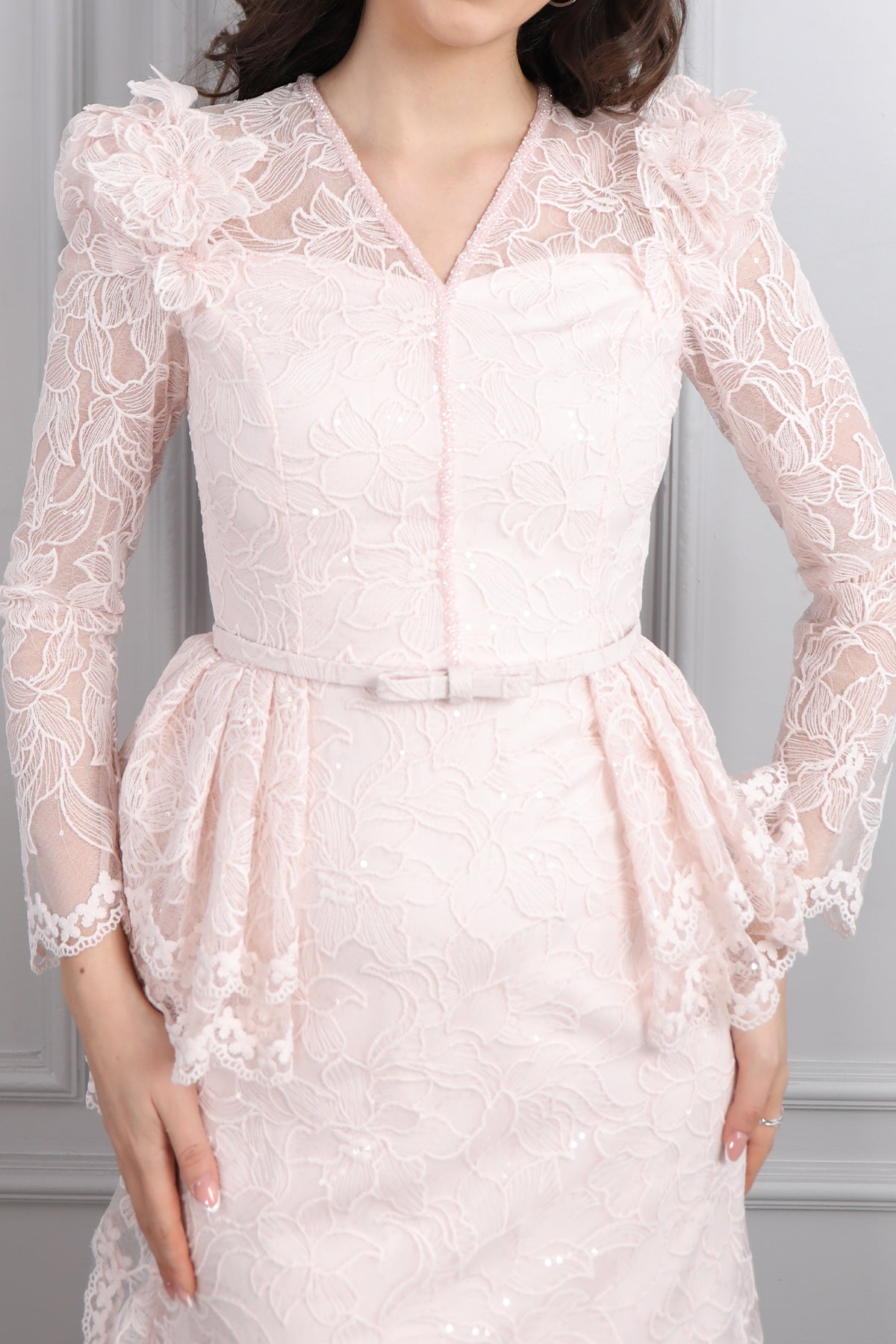 V Yaka Beli Kemerli Omuzu Çiçek Detaylı Dantelli Elbise Pudra