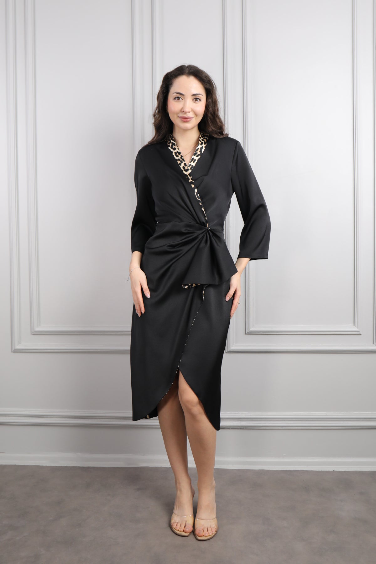 V Yaka Drapeli Büyük Beden Midi Boy Saten Elbise Siyah Özellikleri