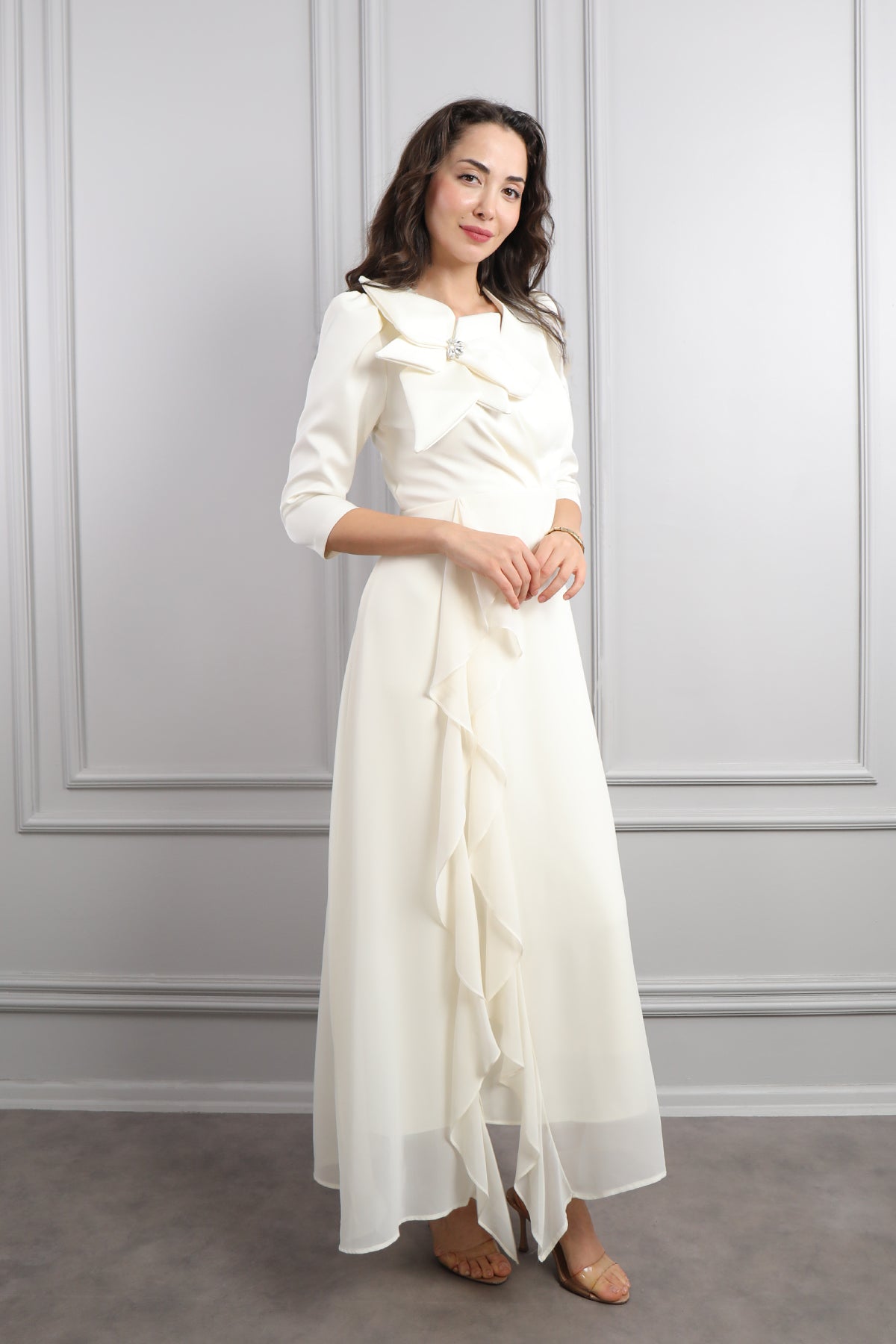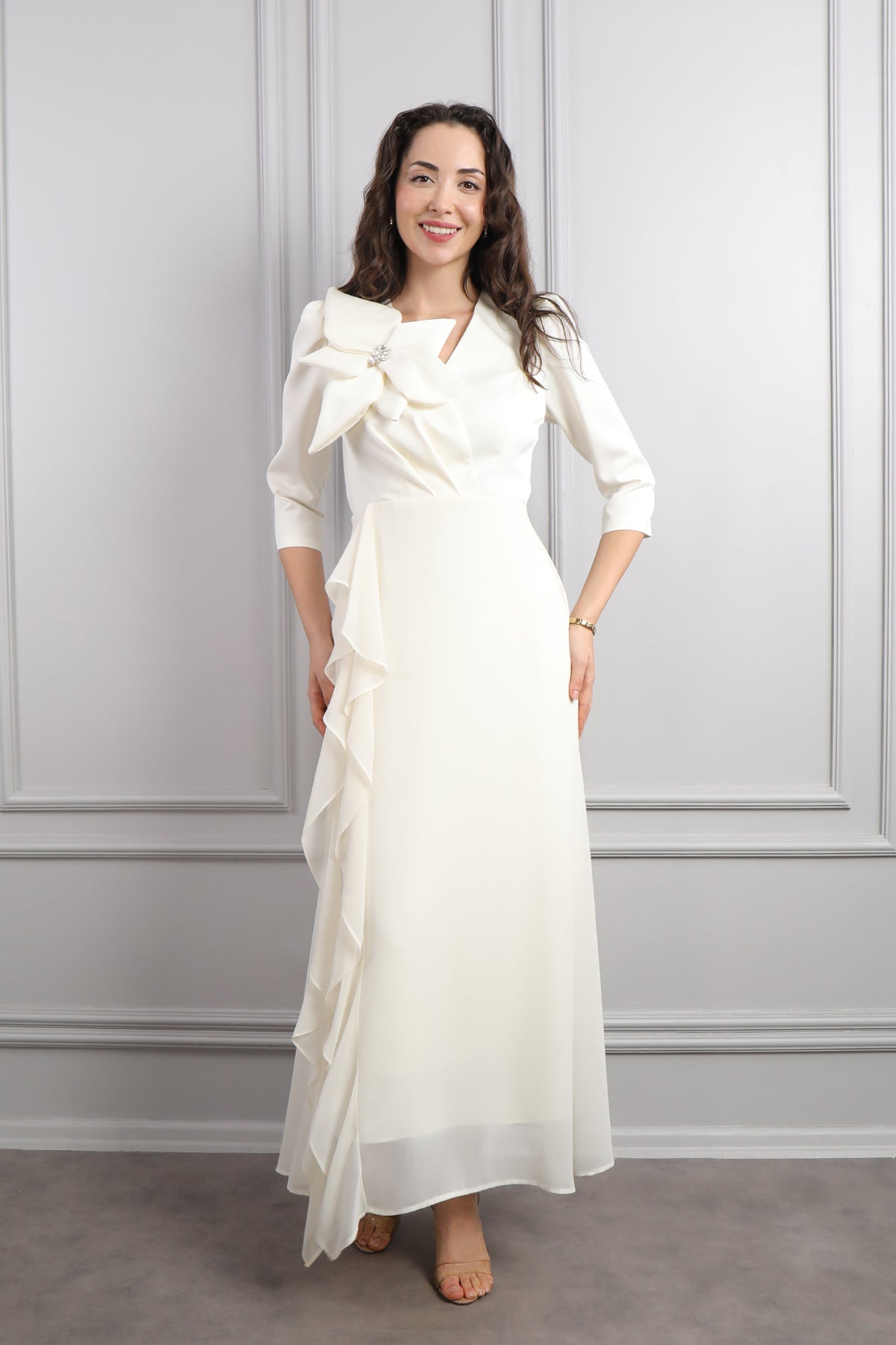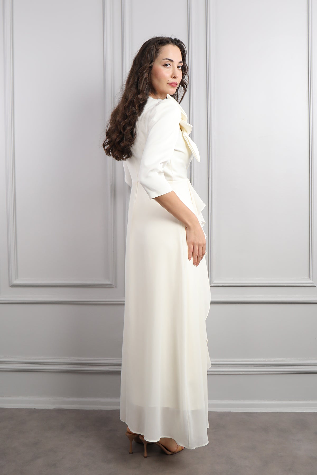 V Yaka Omuzu Çiçek Detaylı Eteği Fırfırlı Elbise Ekru Özellikleri