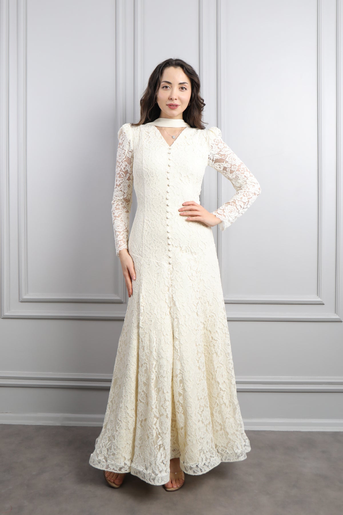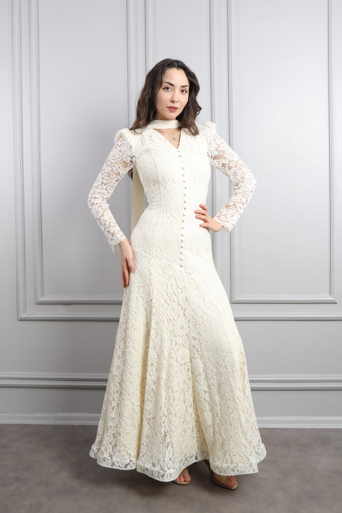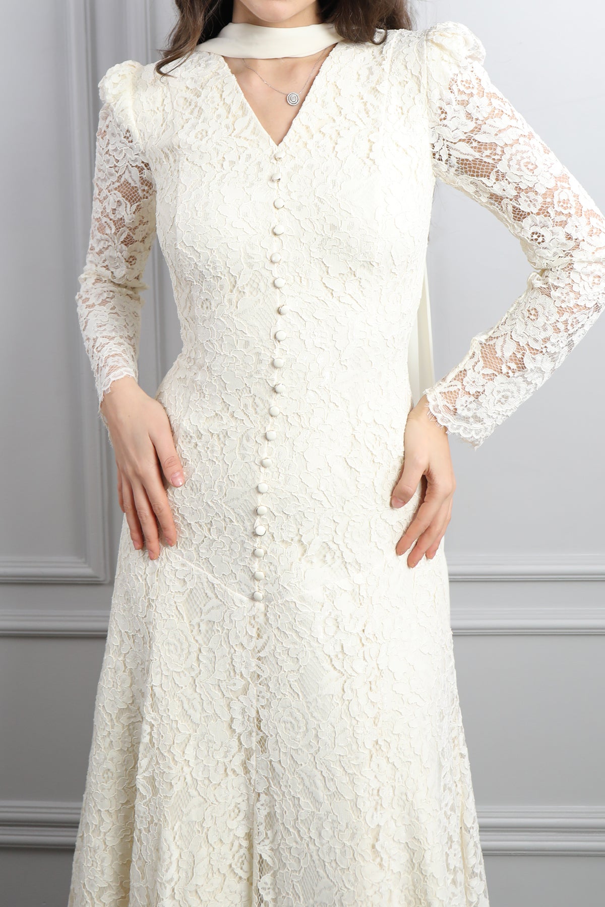 V Yaka Önü Düğmeli Fular Detaylı Dantelli Elbise Ekru