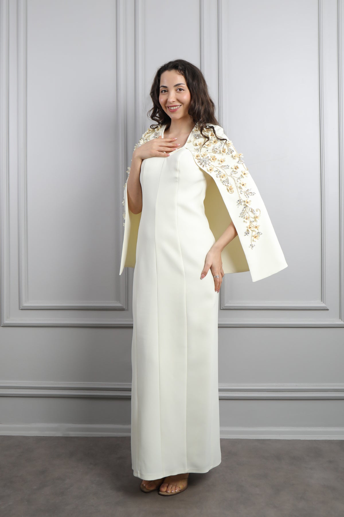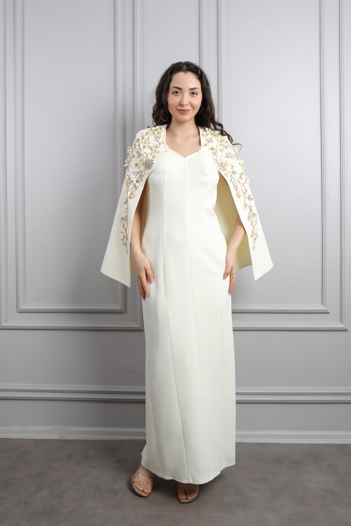 V Yaka Pelerini Taş Ve Çiçek Detaylı Büyük Beden Abiye Kemik