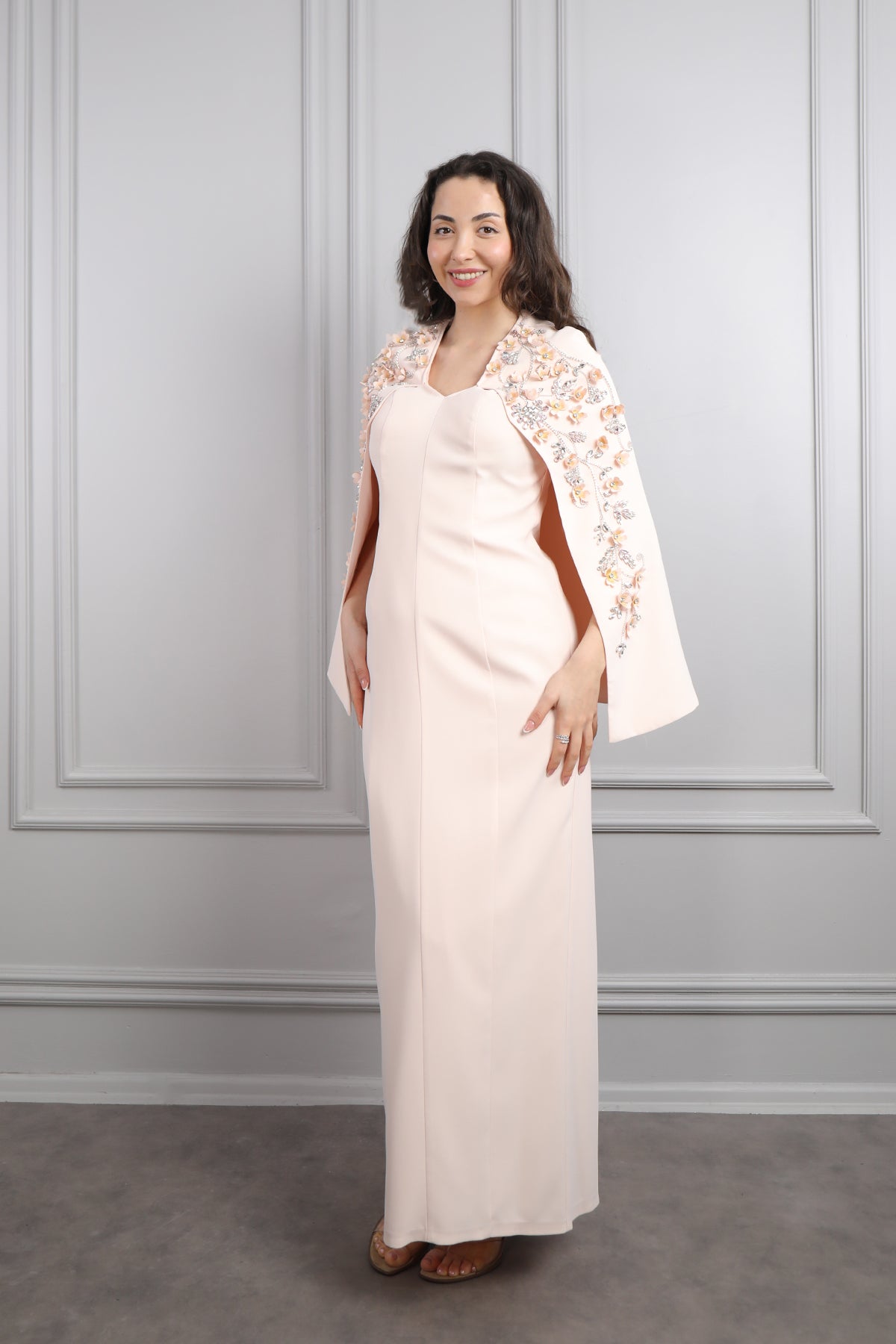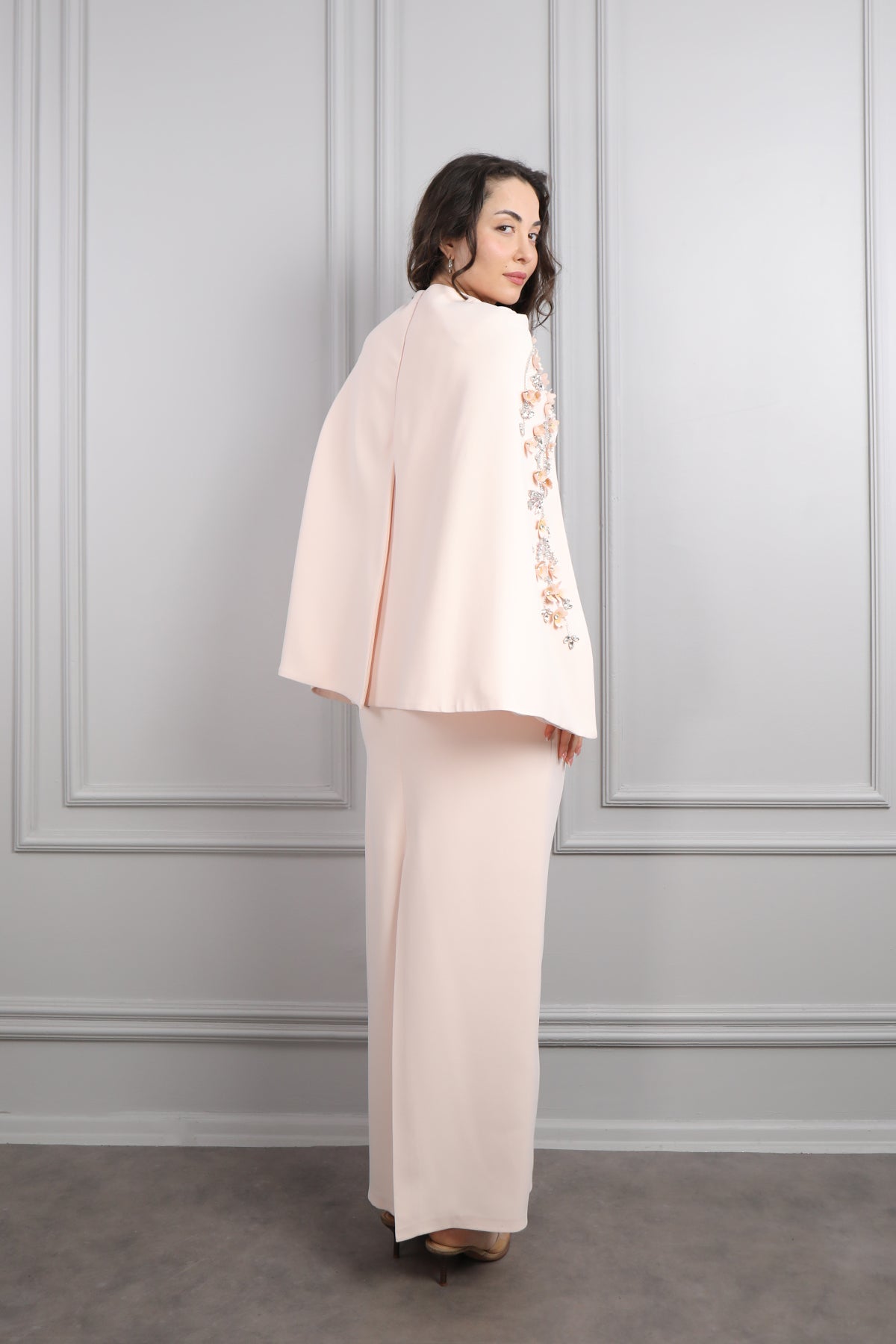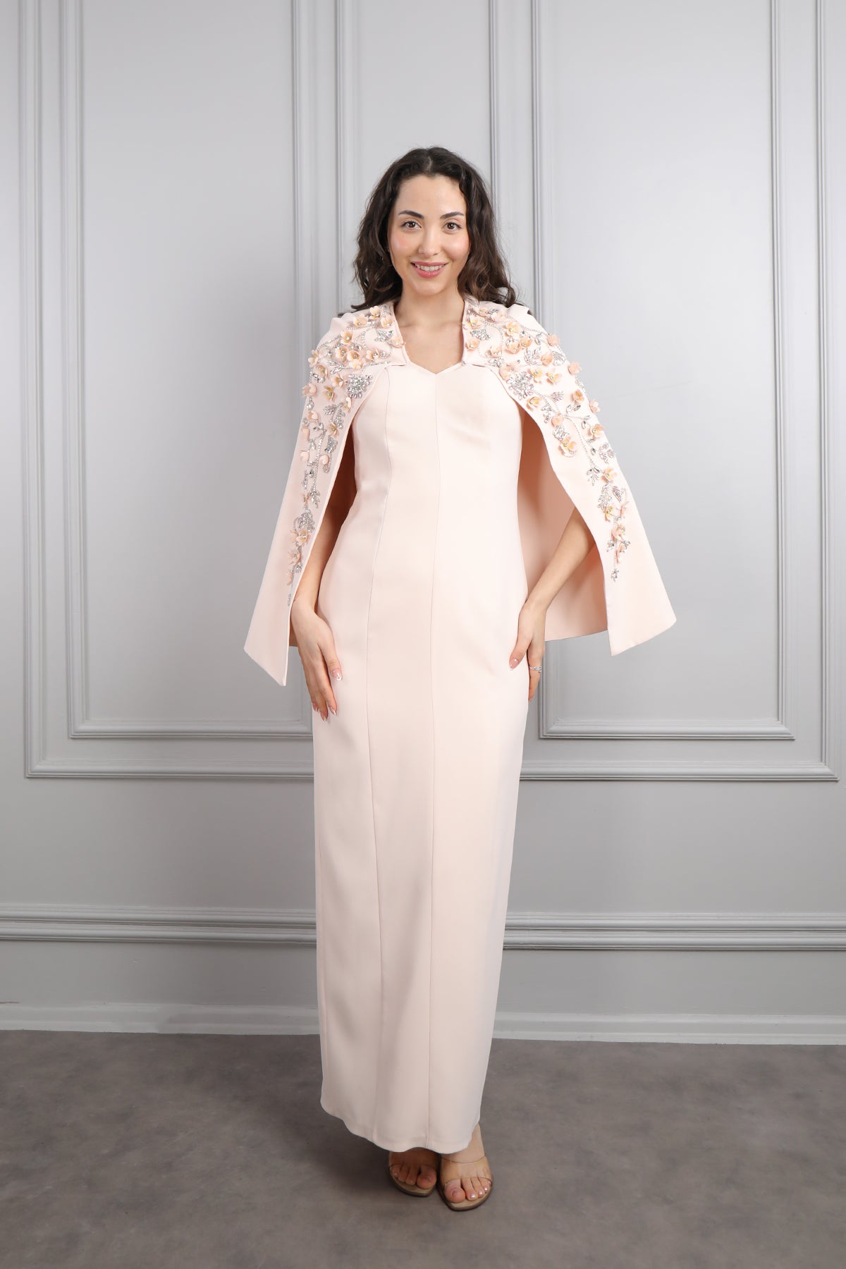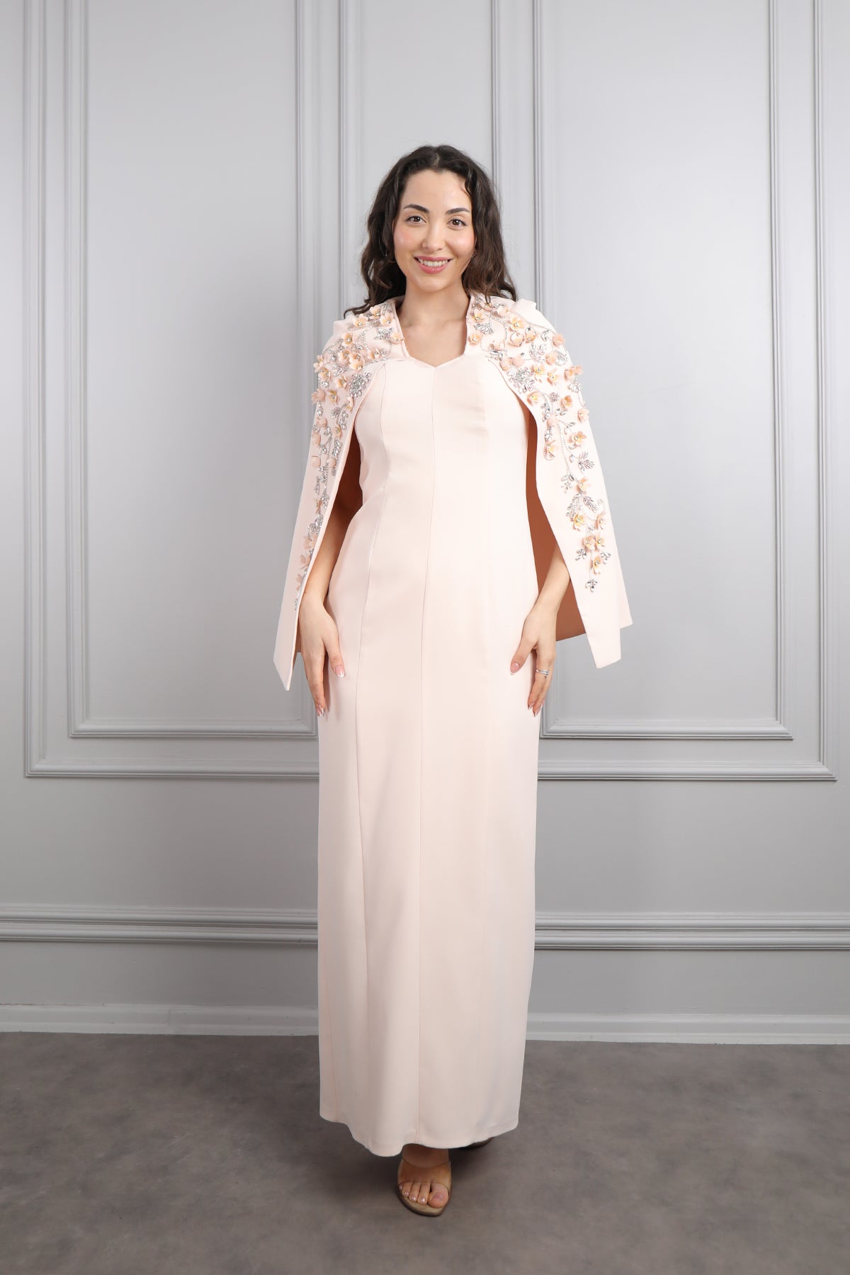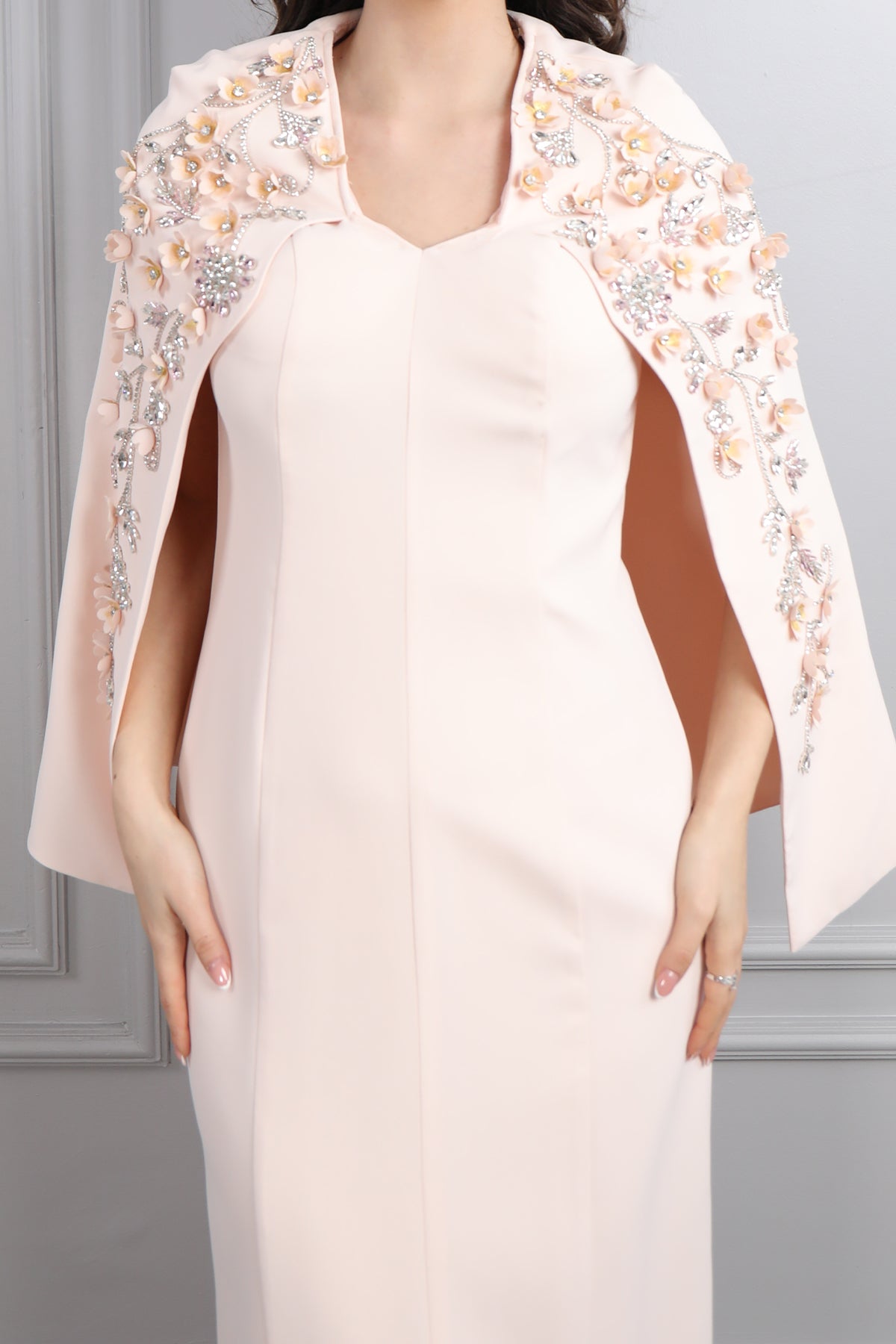 V Yaka Pelerini Taş Ve Çiçek Detaylı Büyük Beden Abiye Pembe Özellikleri