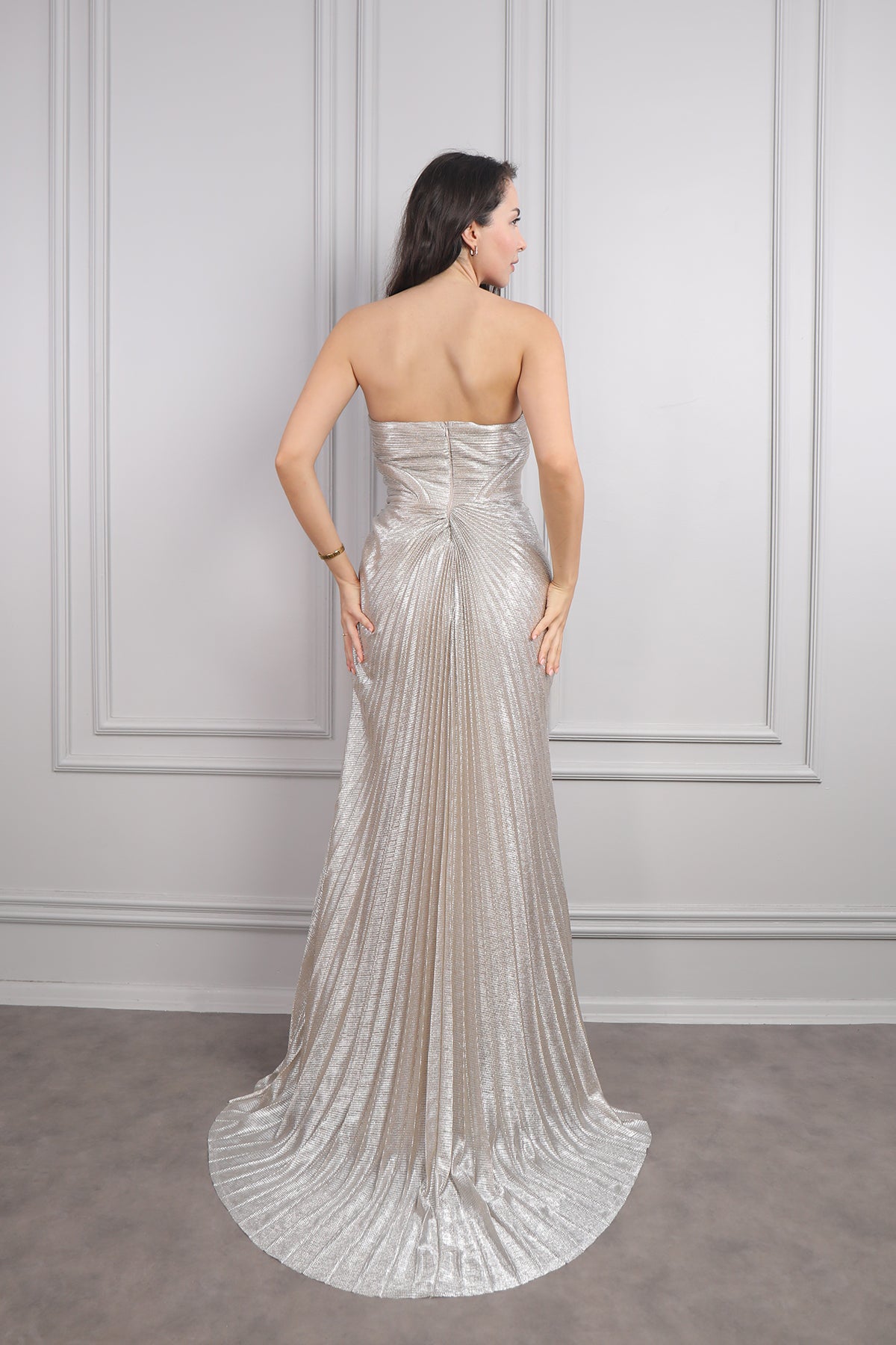 Straplez Derin Dekolteli Pileli Parlak Kumaş Abiye Vizon
