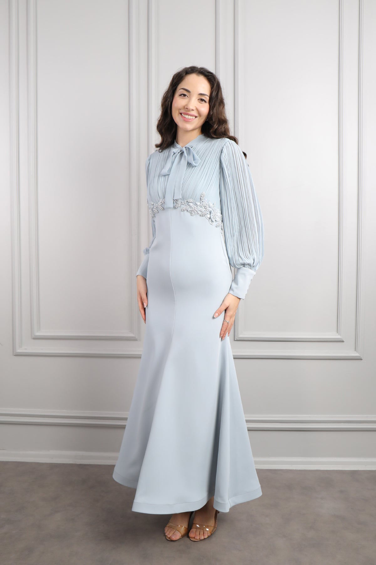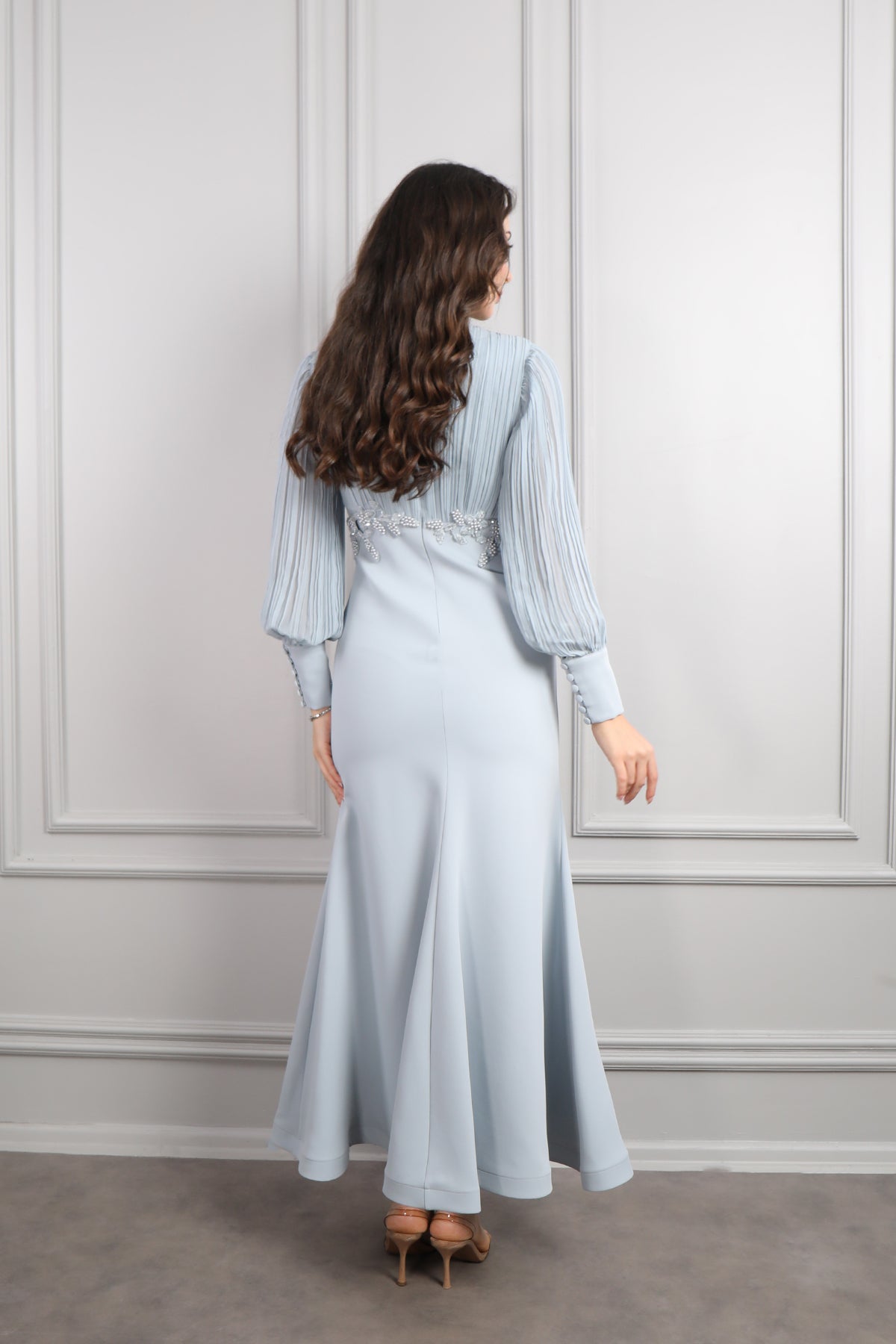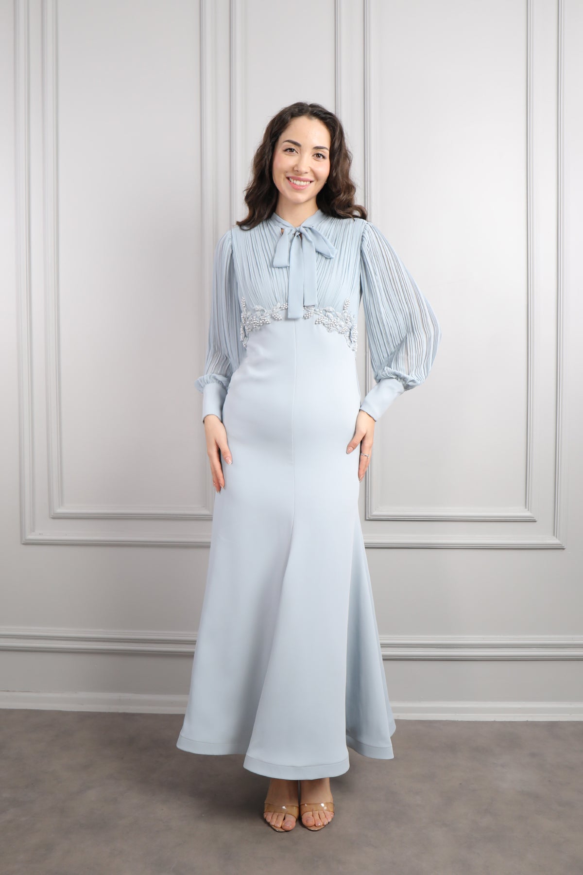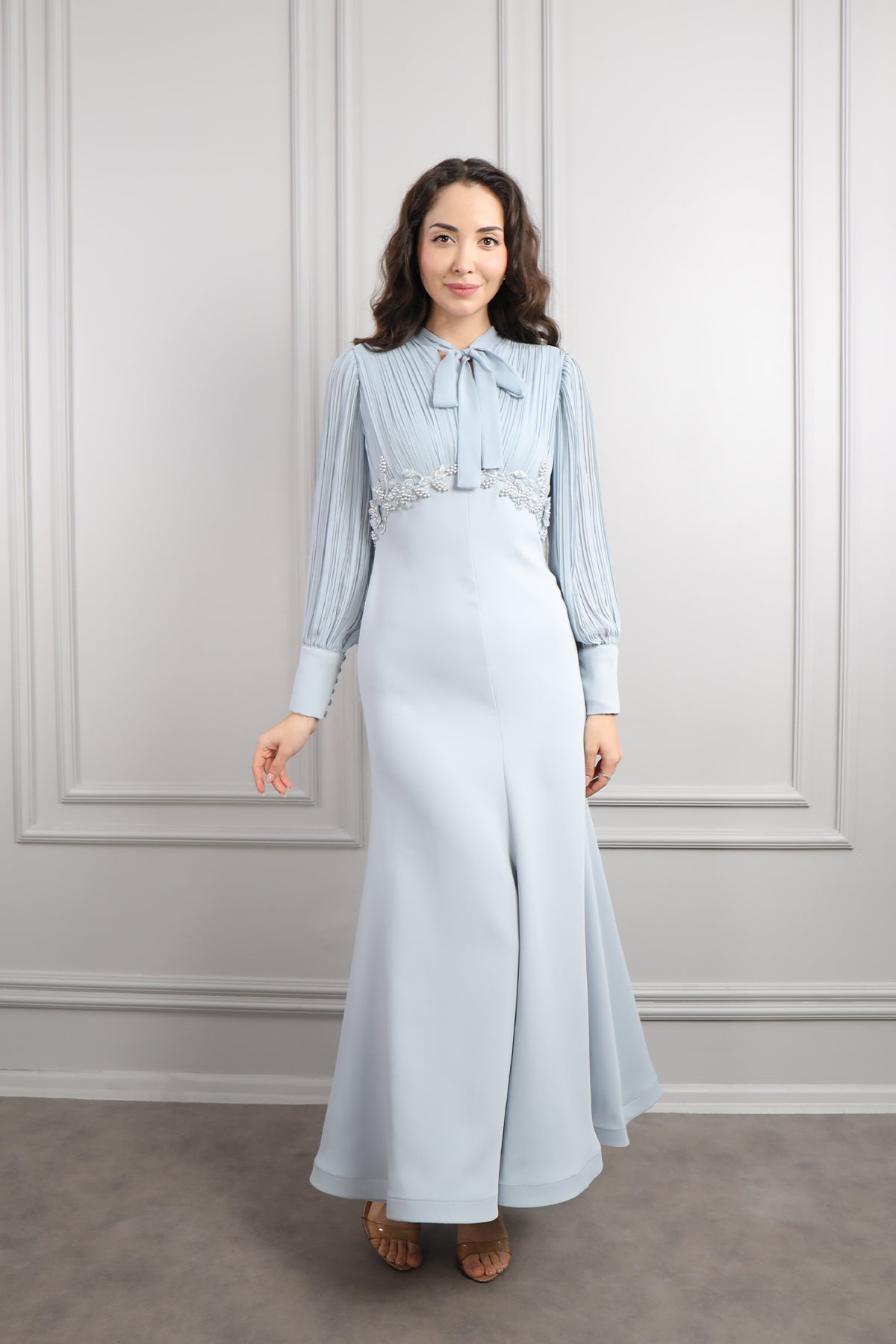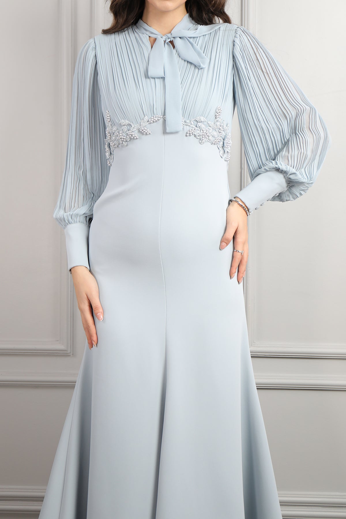 Yakası Bağlamalı Beli Boncuk İşlemeli Elbise Mavi Özellikleri