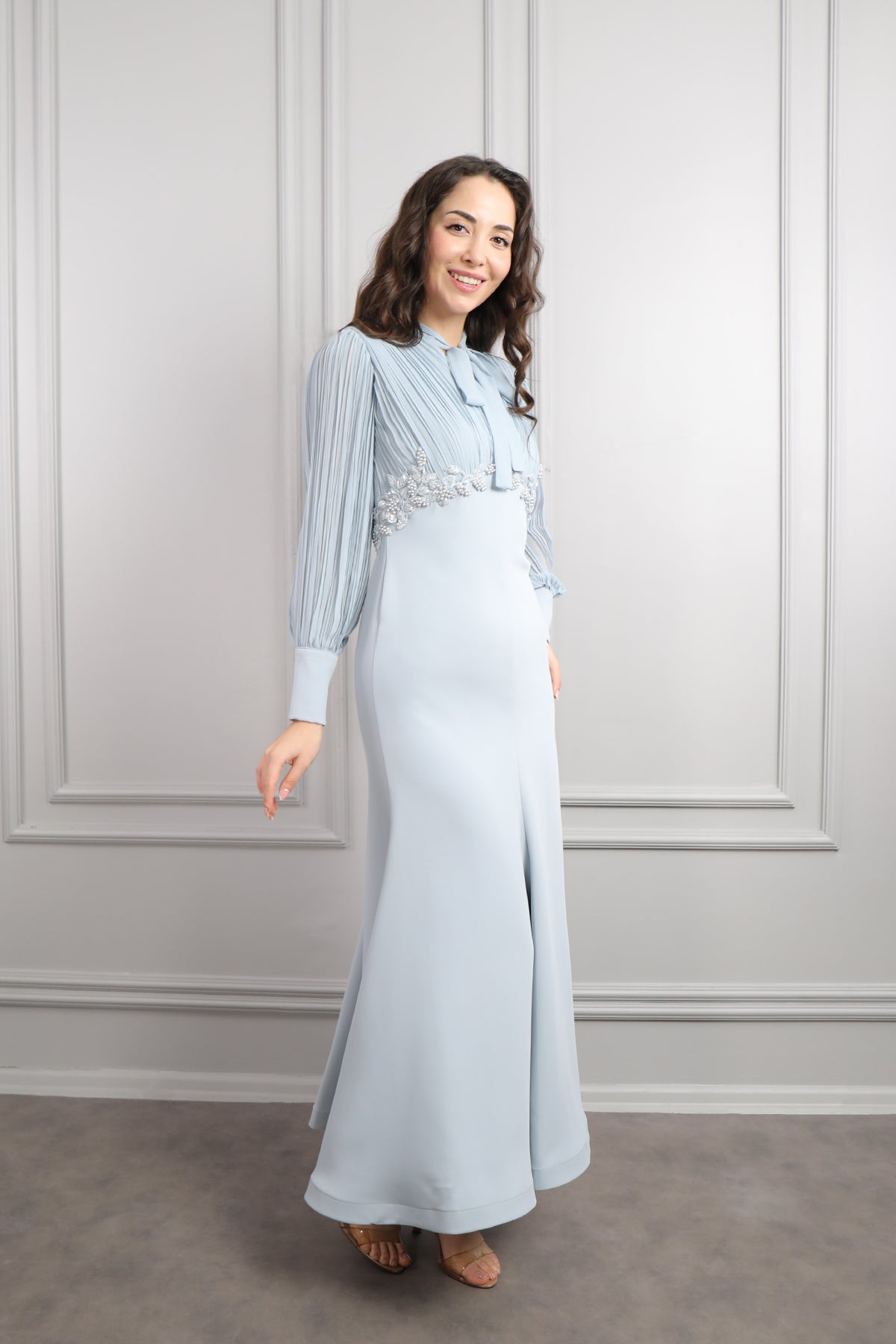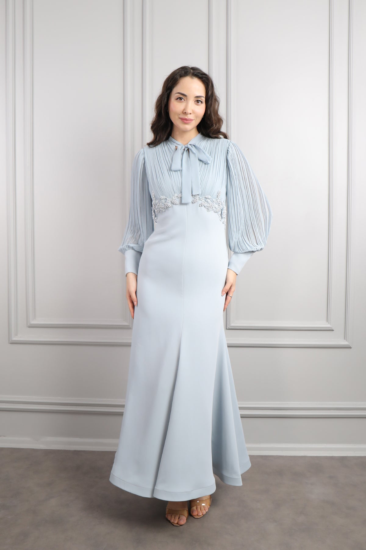 Yakası Bağlamalı Beli Boncuk İşlemeli Elbise Mavi