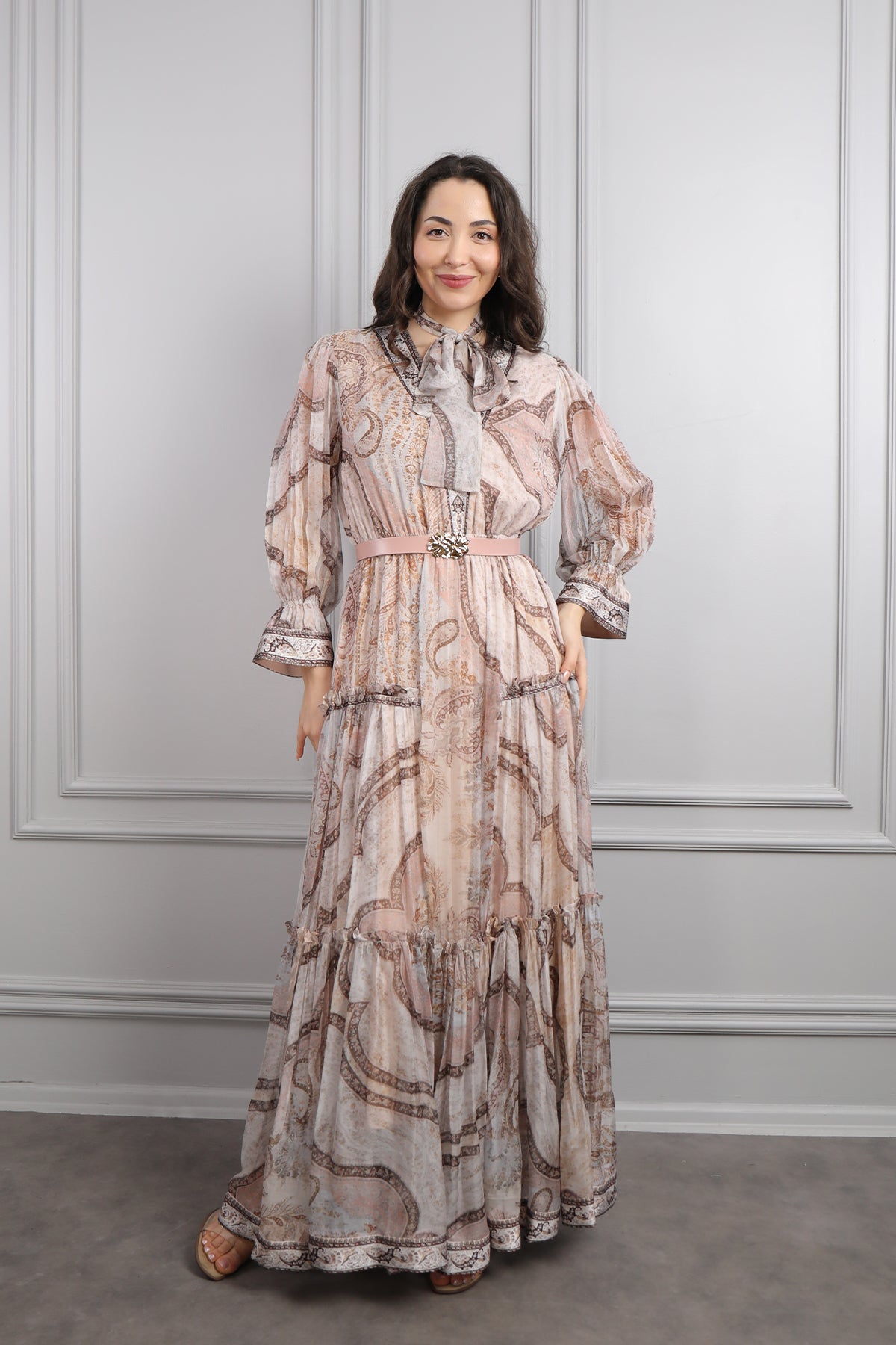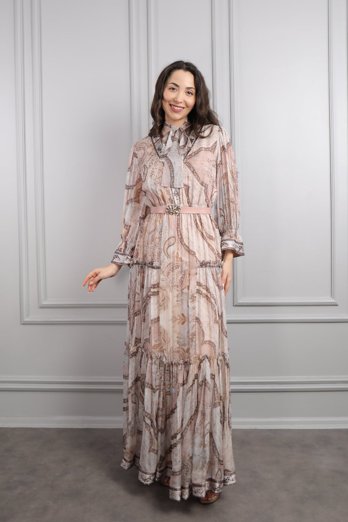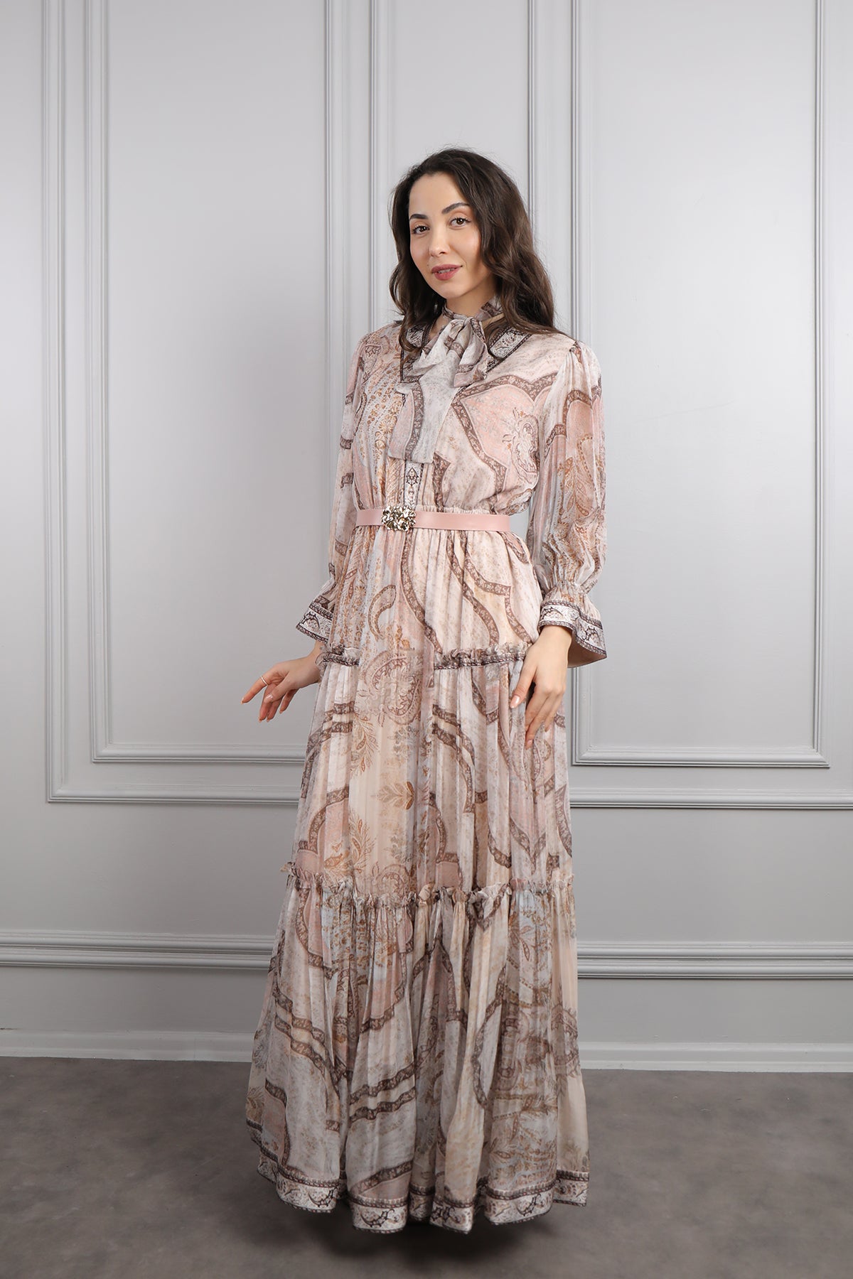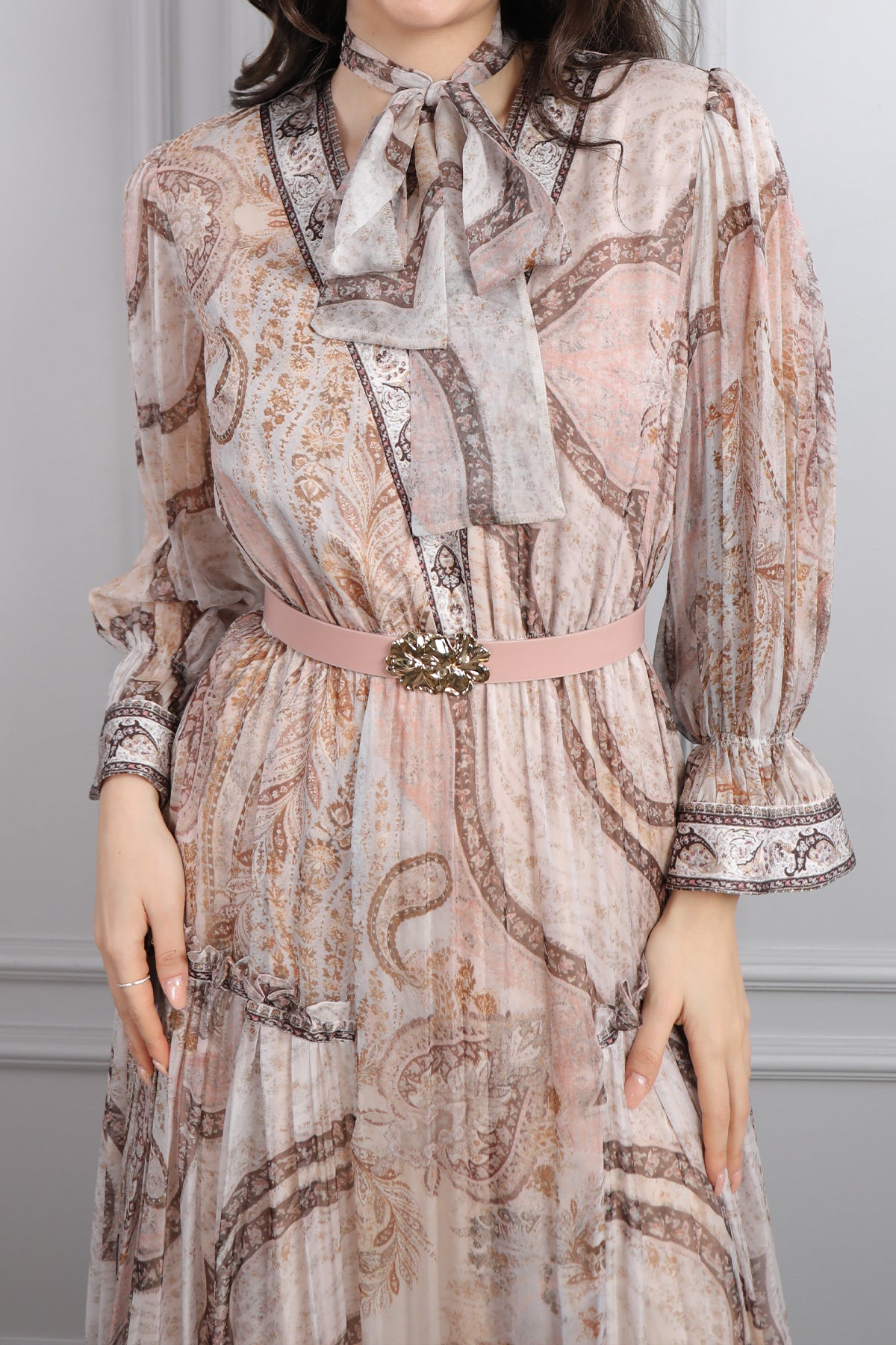 Yakası Bağlamalı Beli Kemerli Desenli Büyük Beden Şifon Elbise Pudra