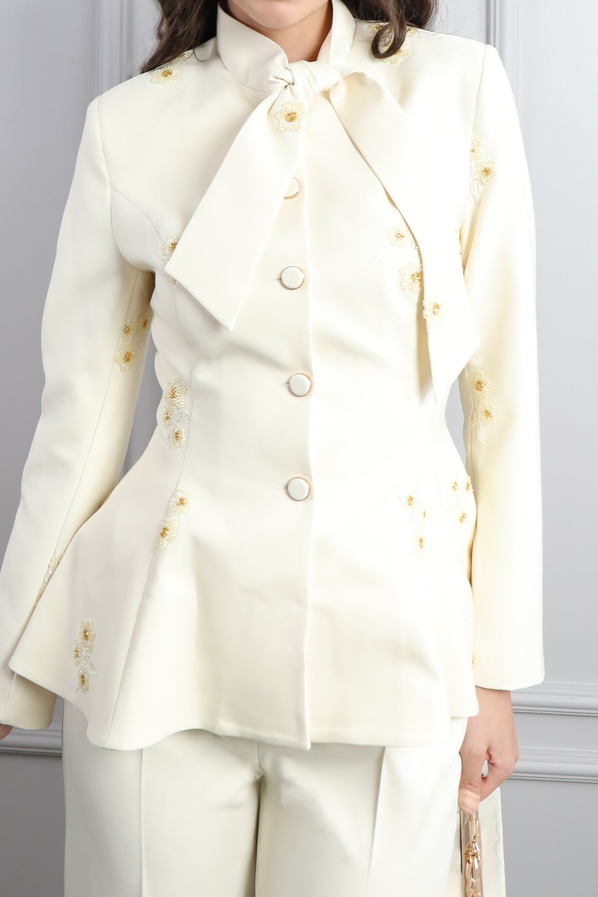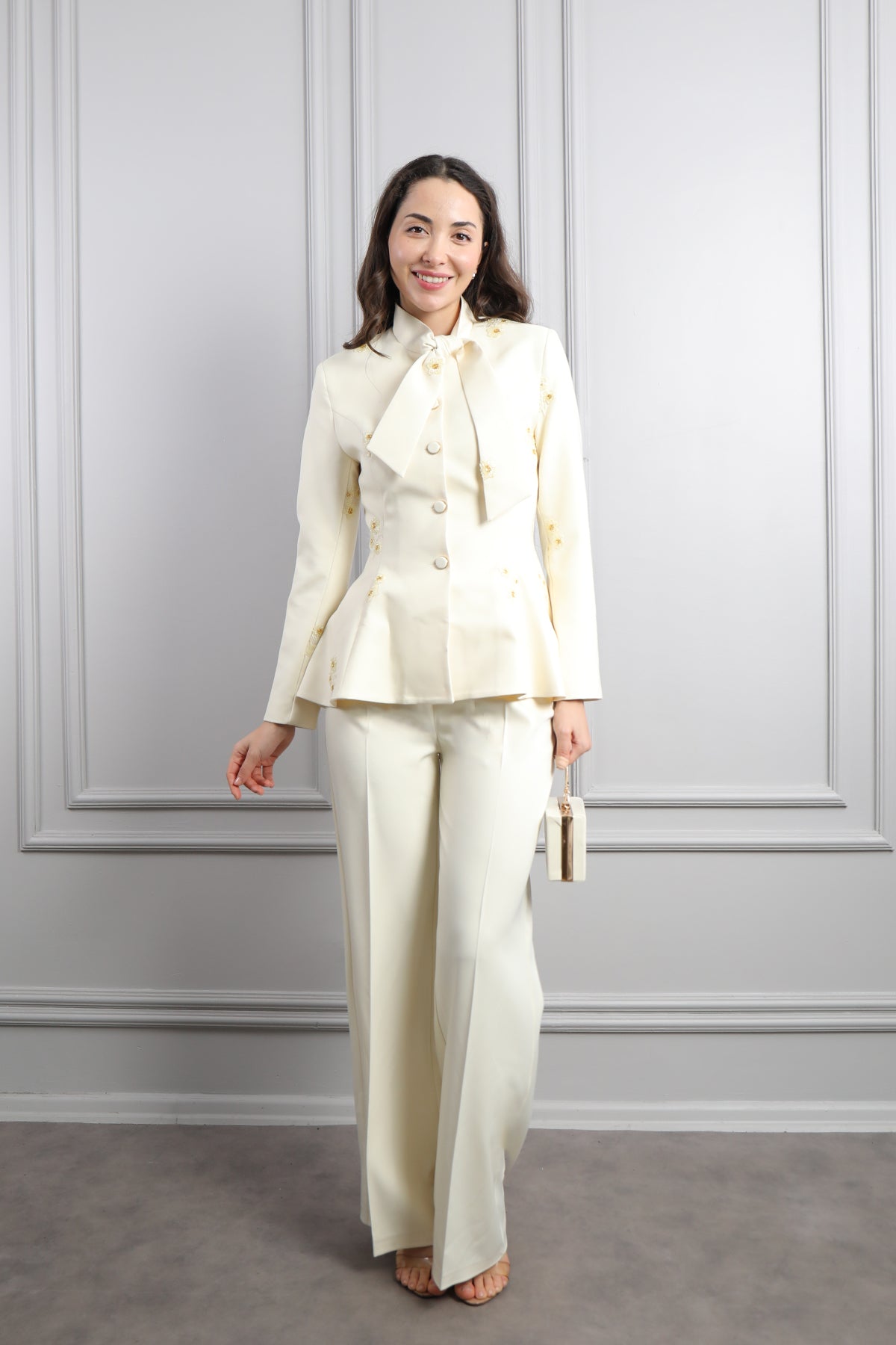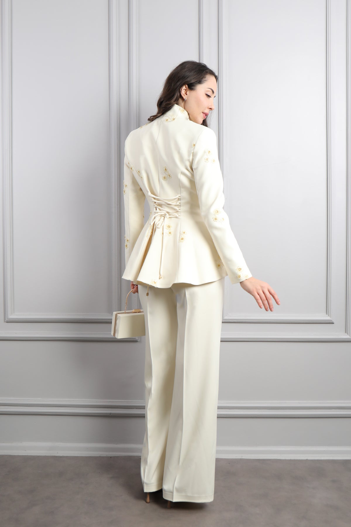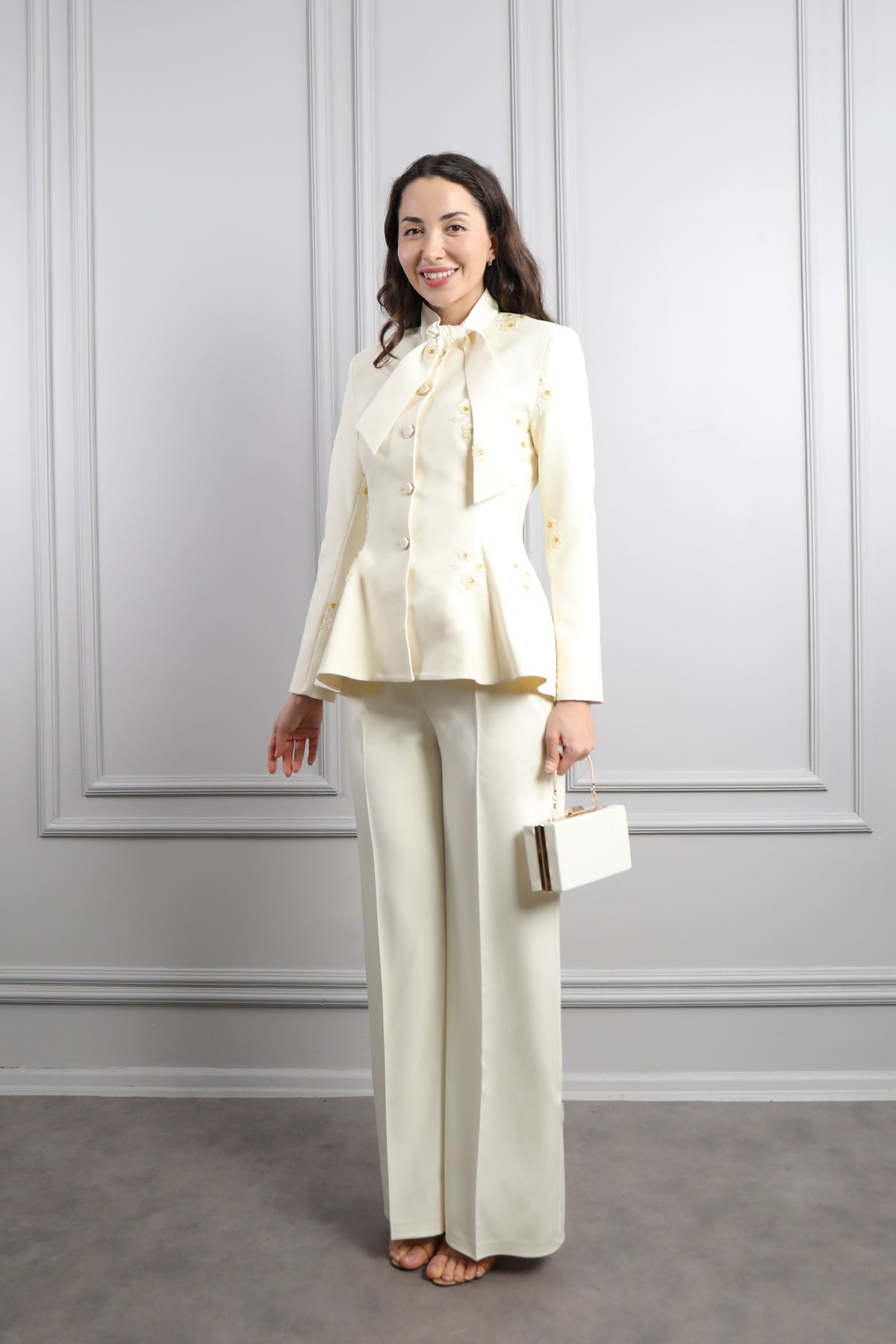 Yakası Bağlamalı Boncuk İşlemeli Çanta Aksesuar Detaylı Pantolon Takım Ekru Özellikleri