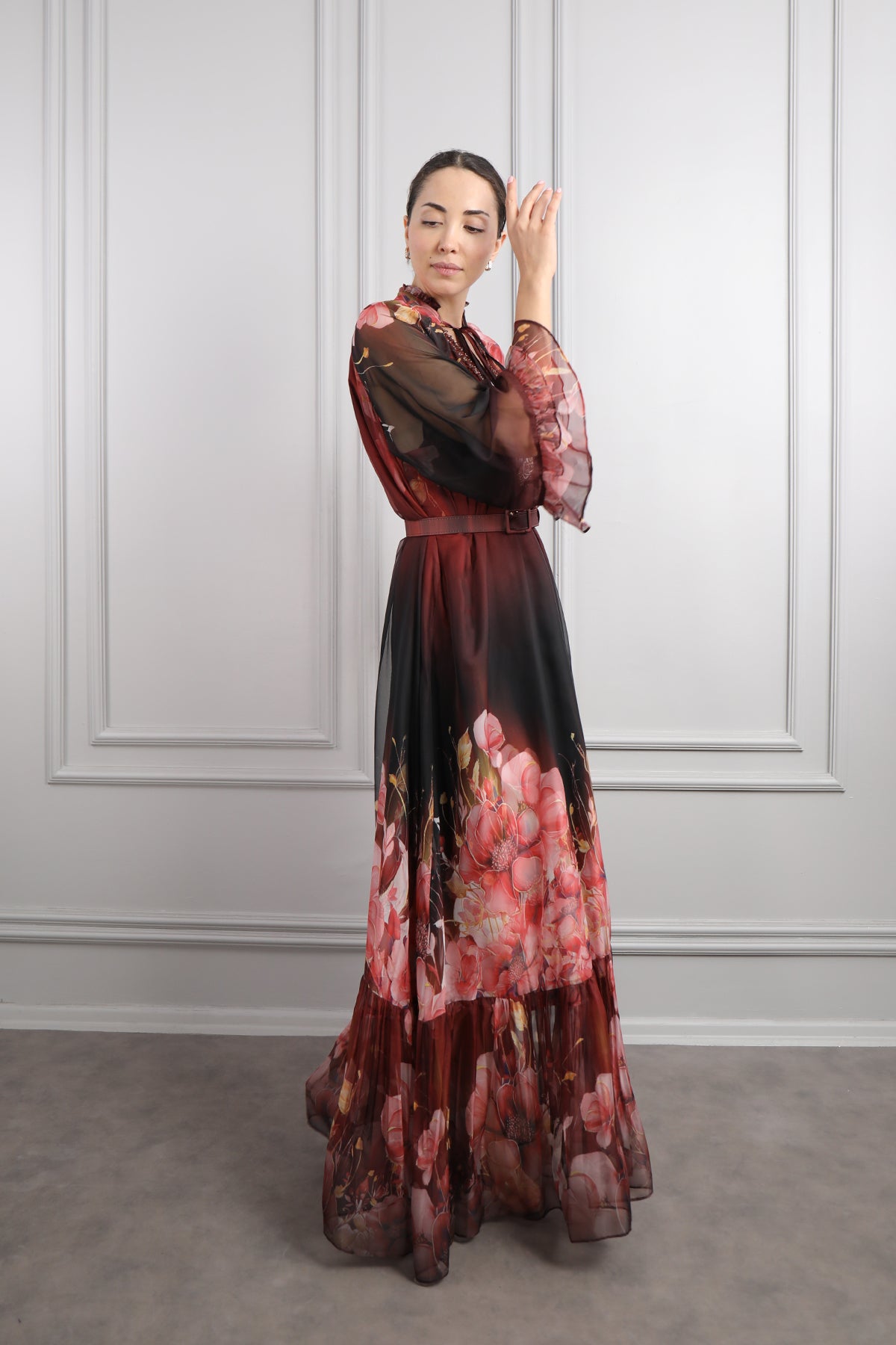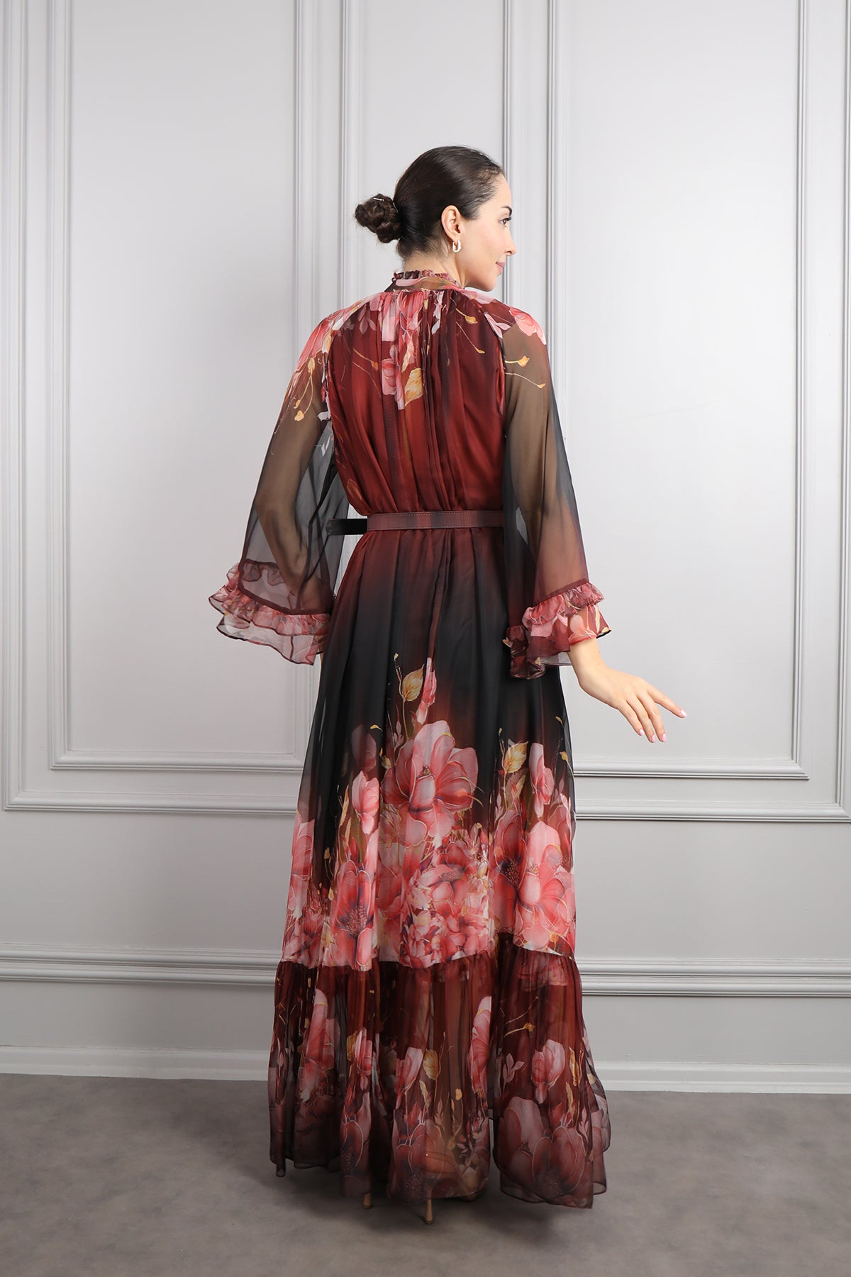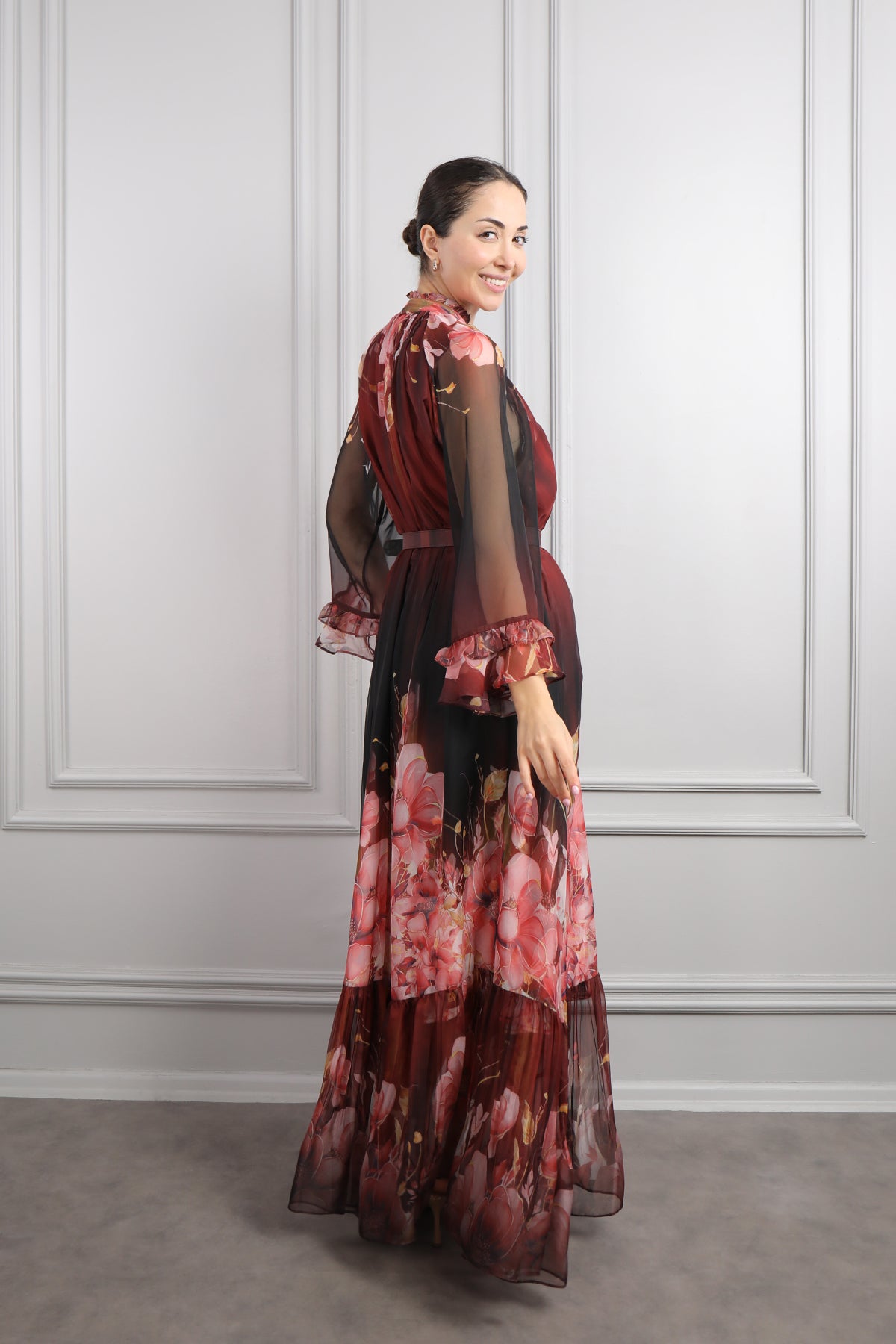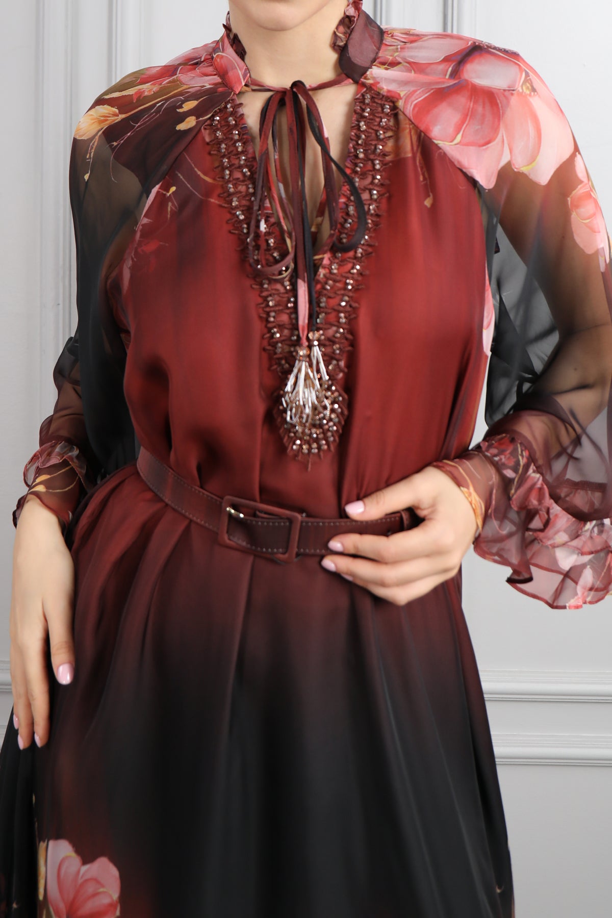 Yakası Bağlamalı Boncuk İşlemeli Desenli Büyük Beden Şifon Elbise Bordo