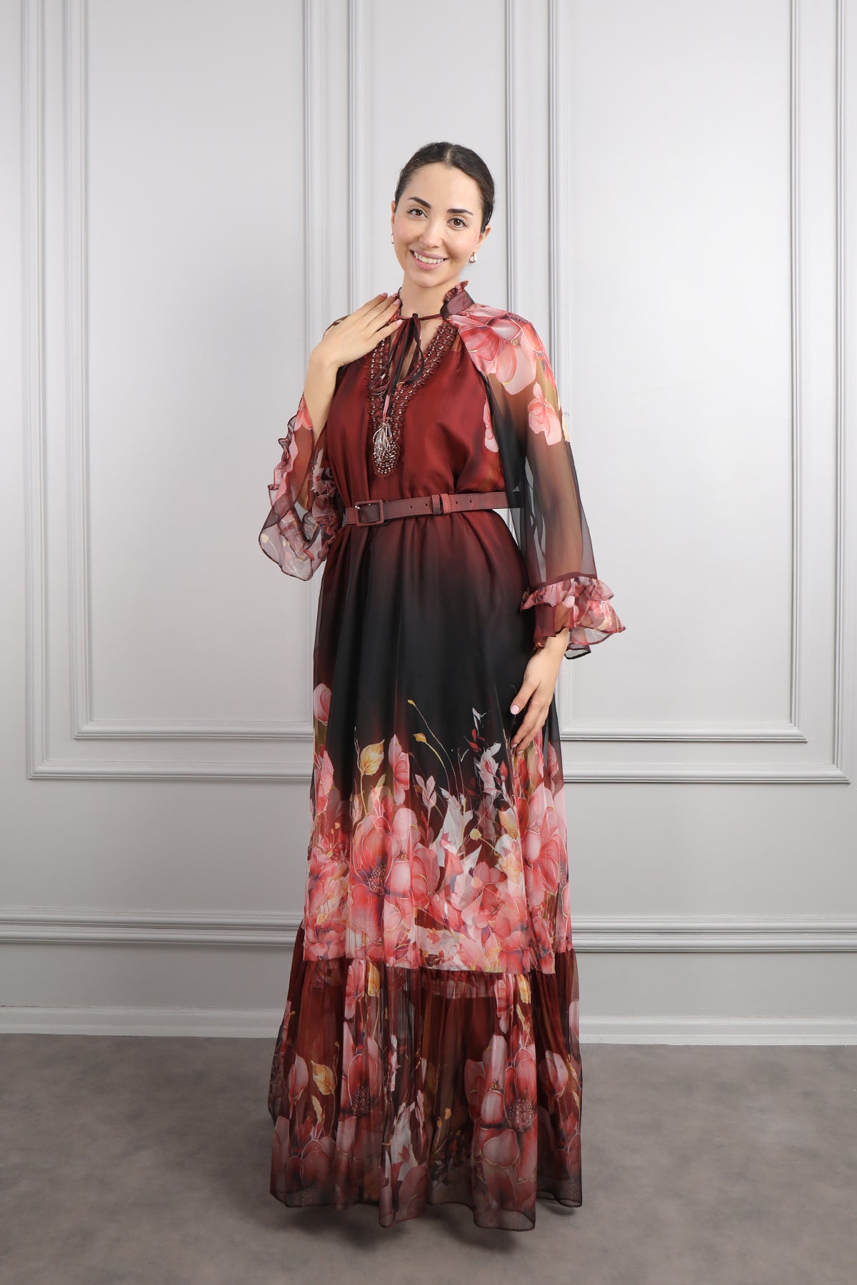 Yakası Bağlamalı Boncuk İşlemeli Desenli Büyük Beden Şifon Elbise Bordo Özellikleri