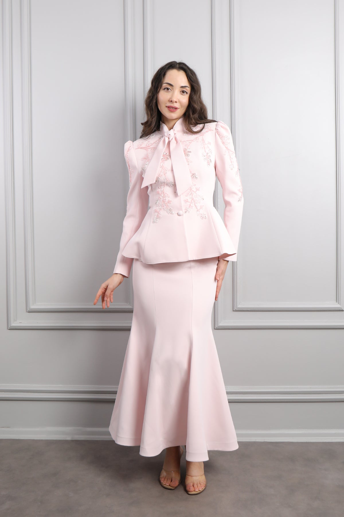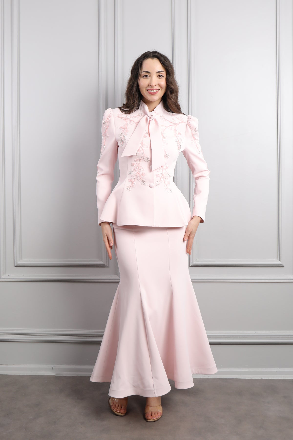 Yakası Bağlamalı Boncuk İşlemeli Etek Takım Pudra
