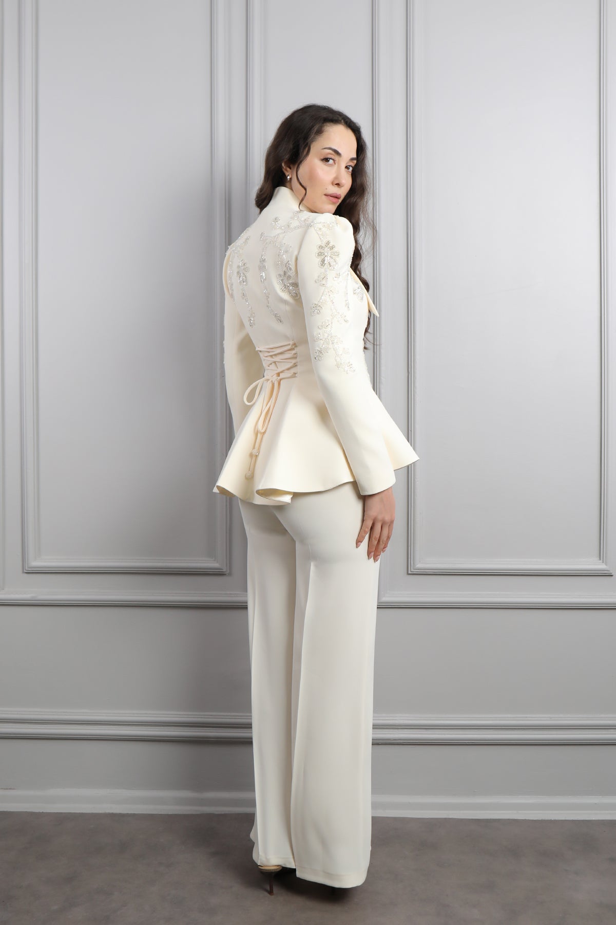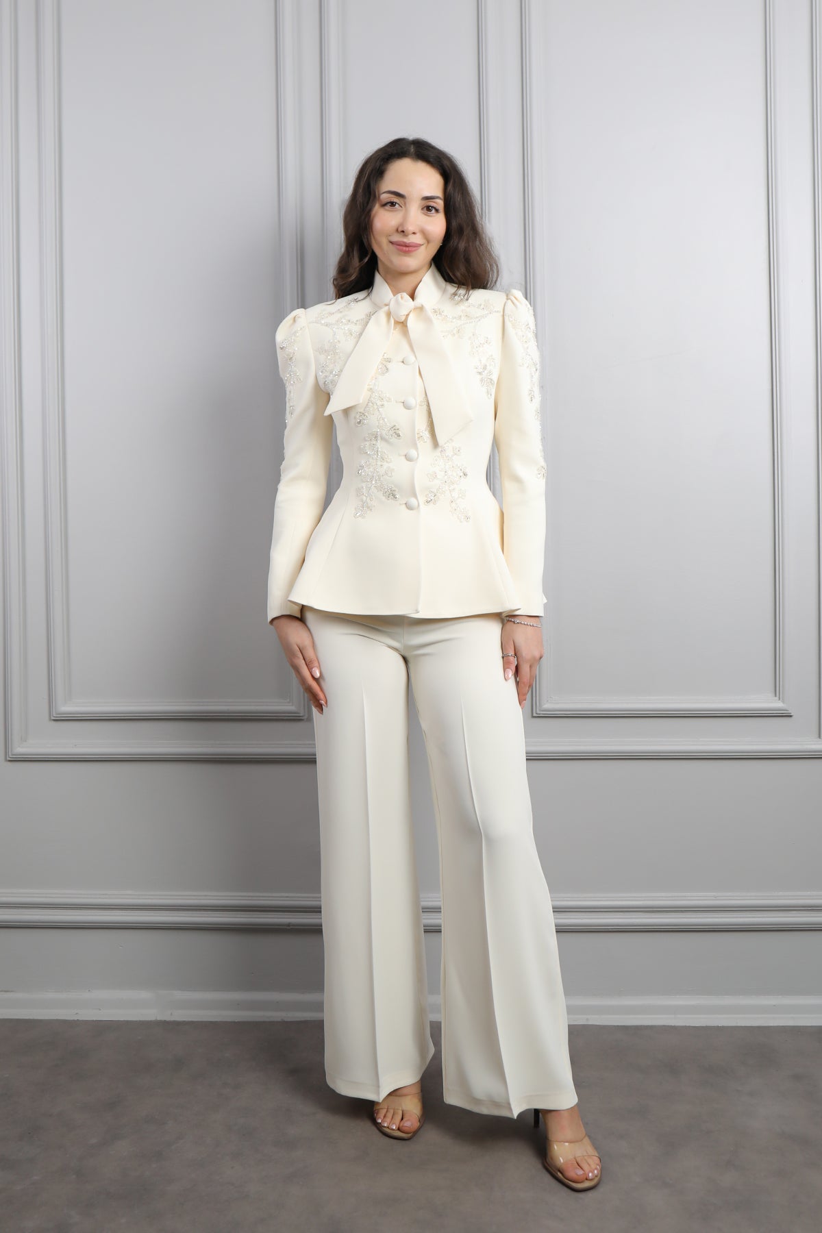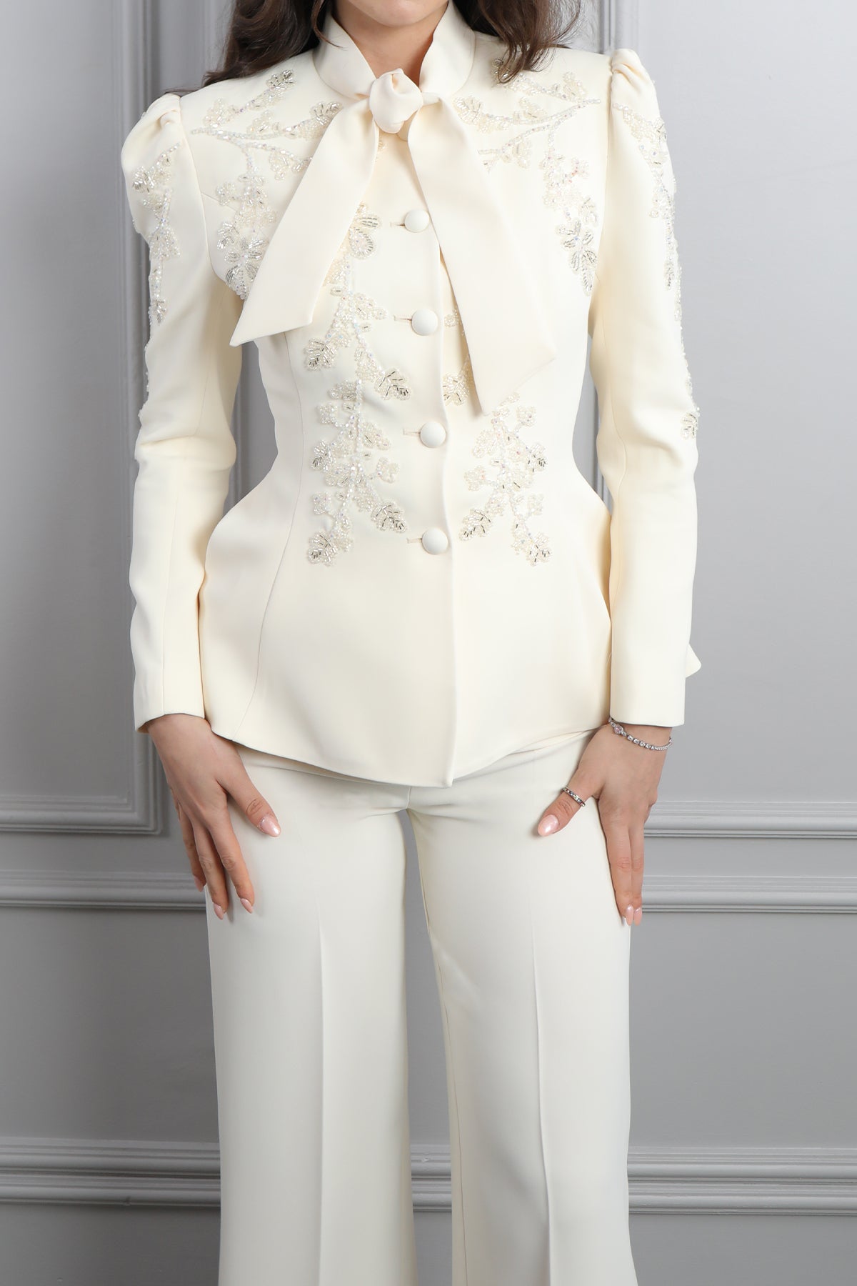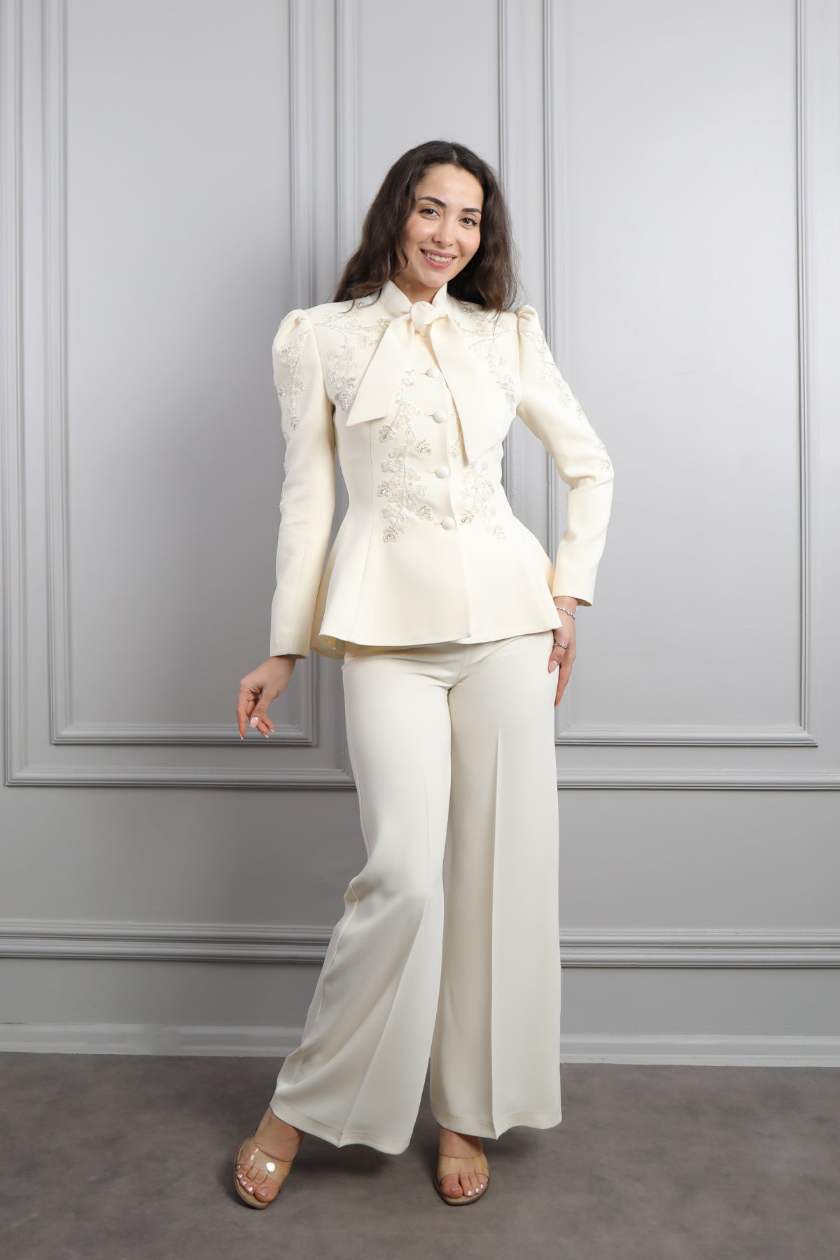 Yakası Bağlamalı Boncuk İşlemeli Pantolon Takım Ekru
