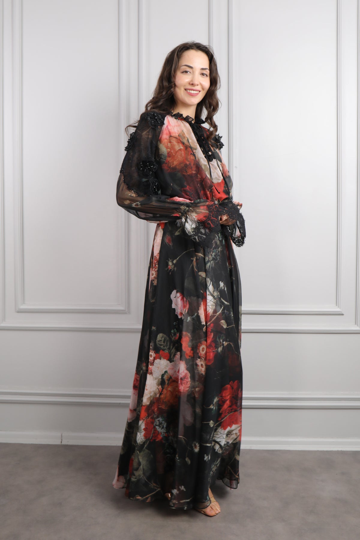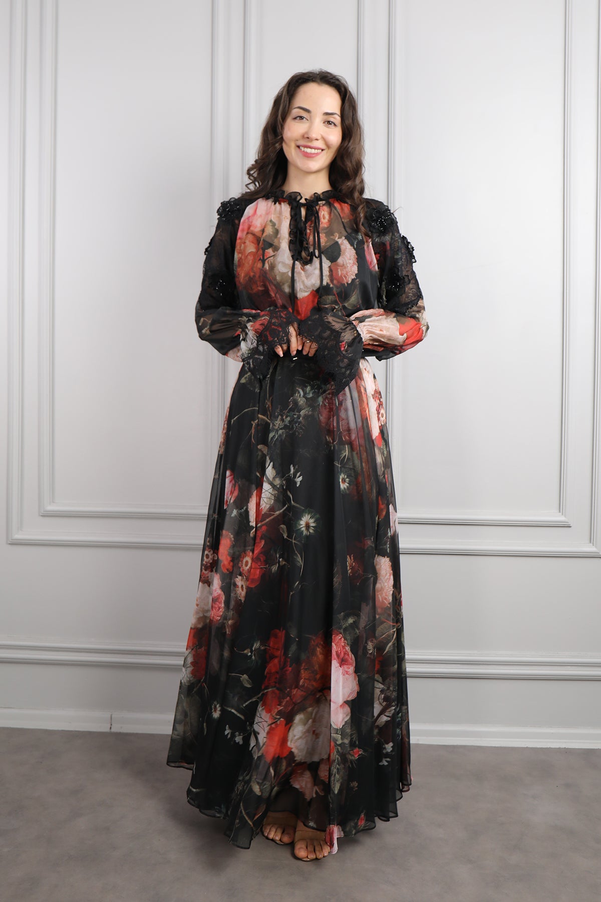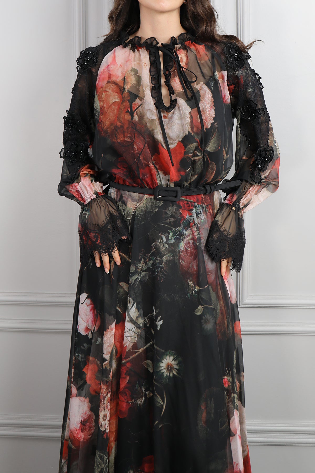 Yakası Bağlamalı Dantel Detaylı Desenli Büyük Beden Şifon Elbise