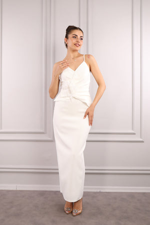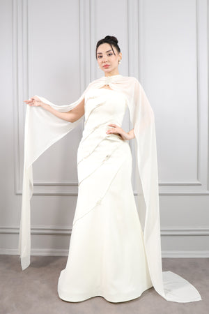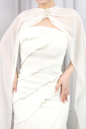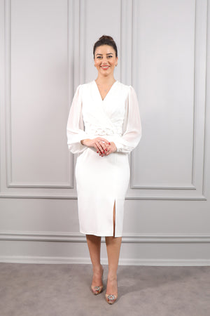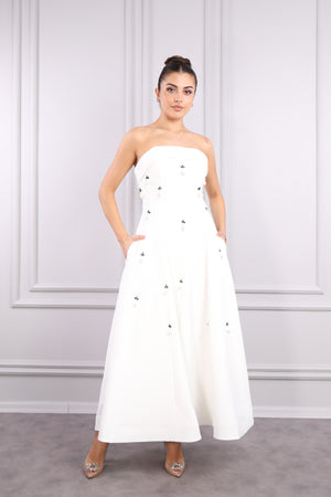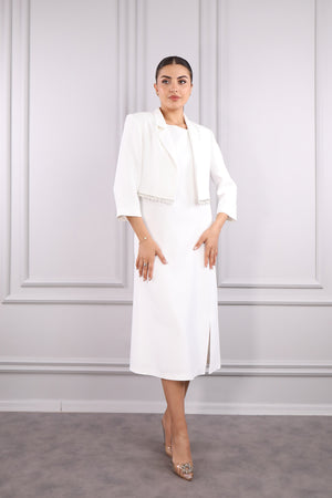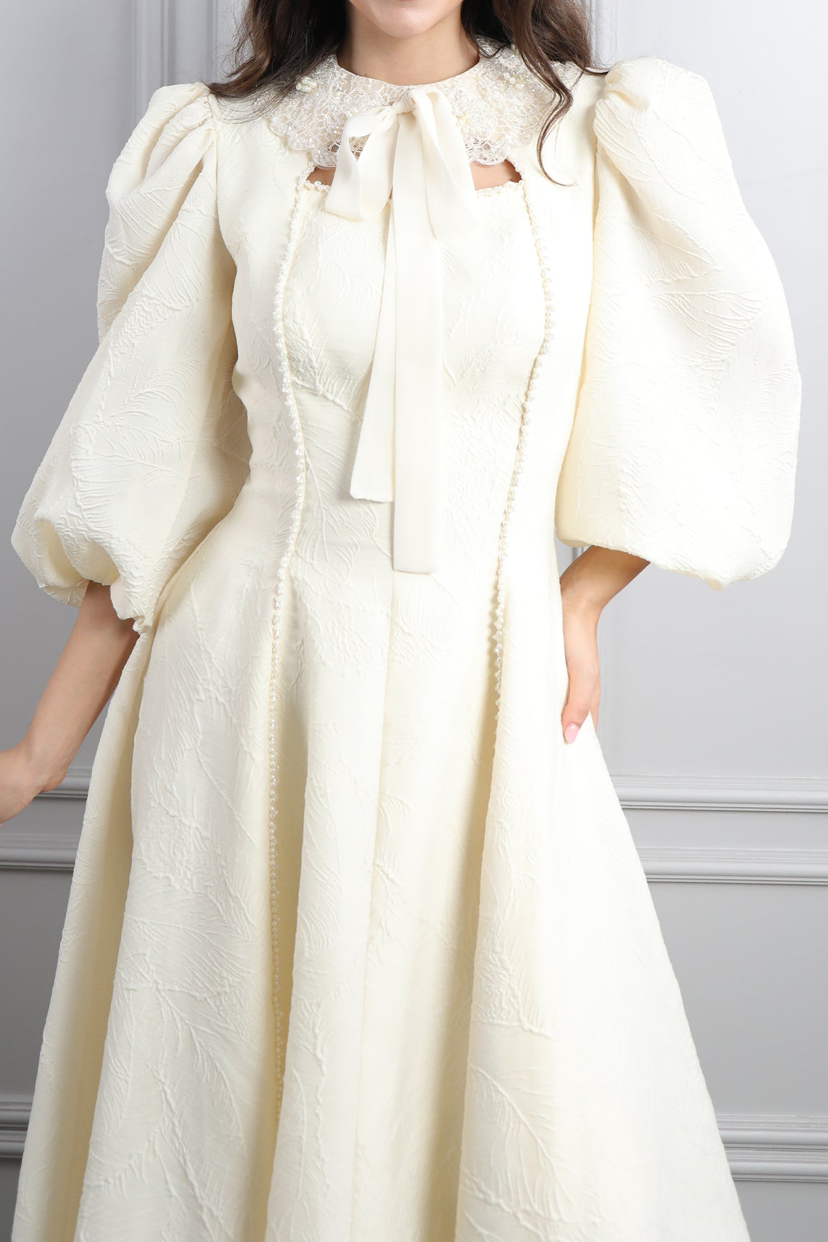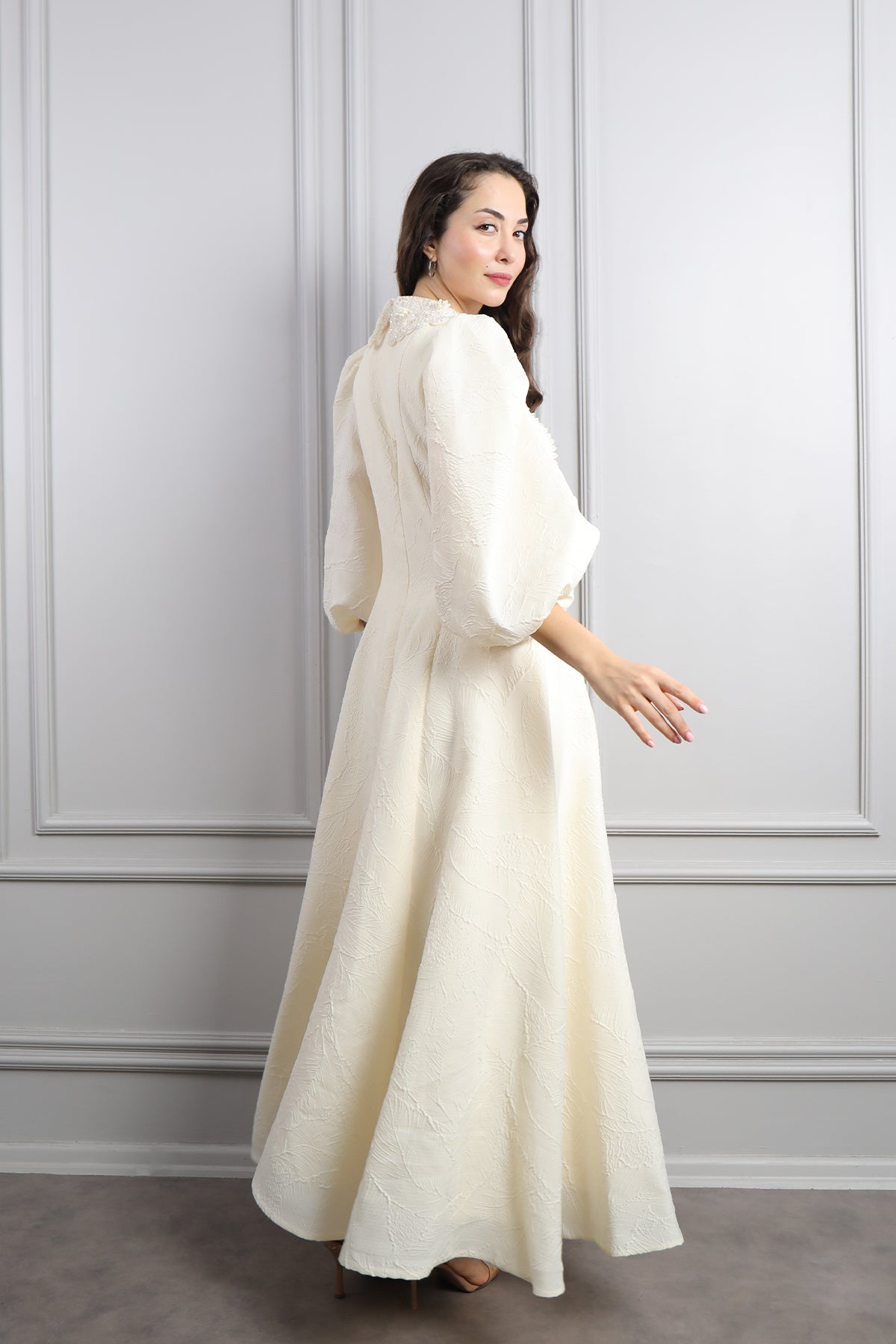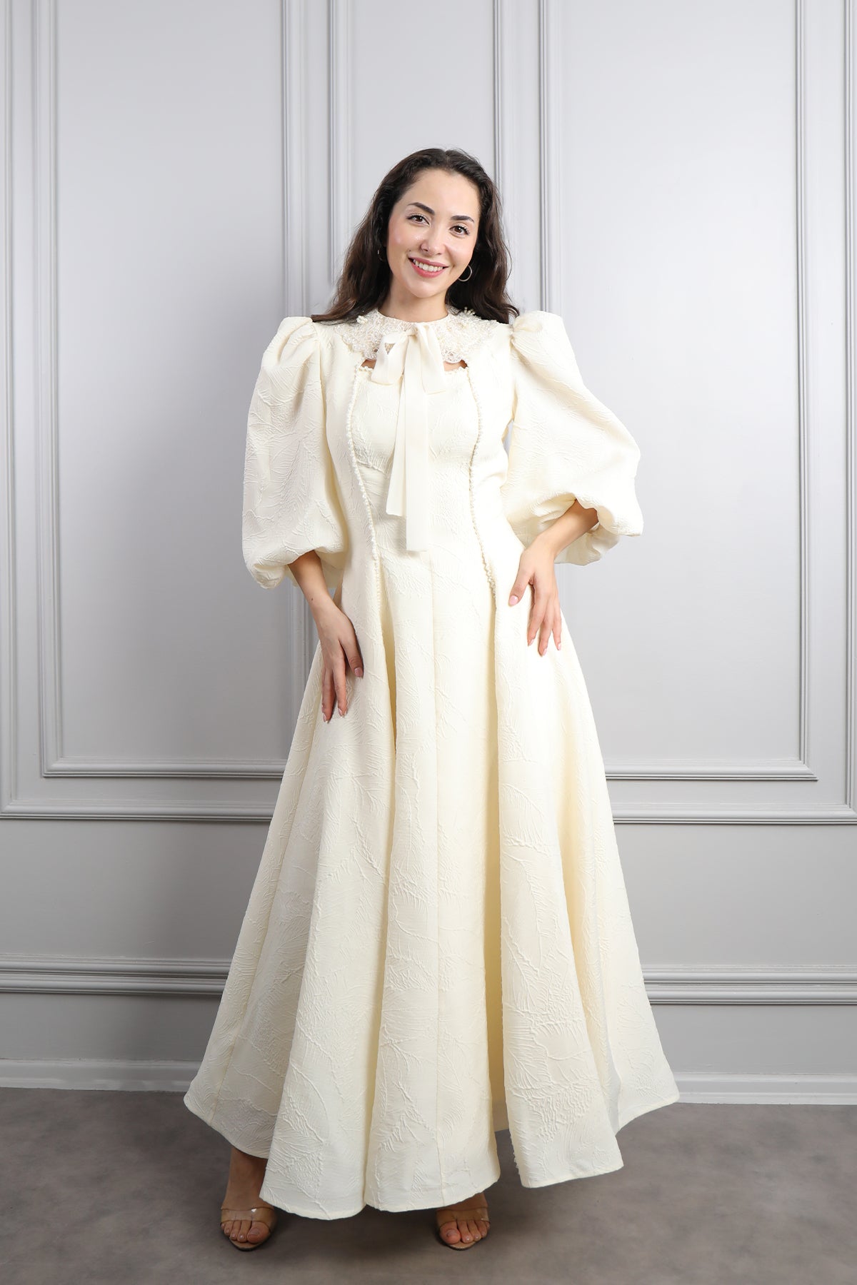 Yakası Boncuk İşlemeli Balon Kol Elbise Ekru