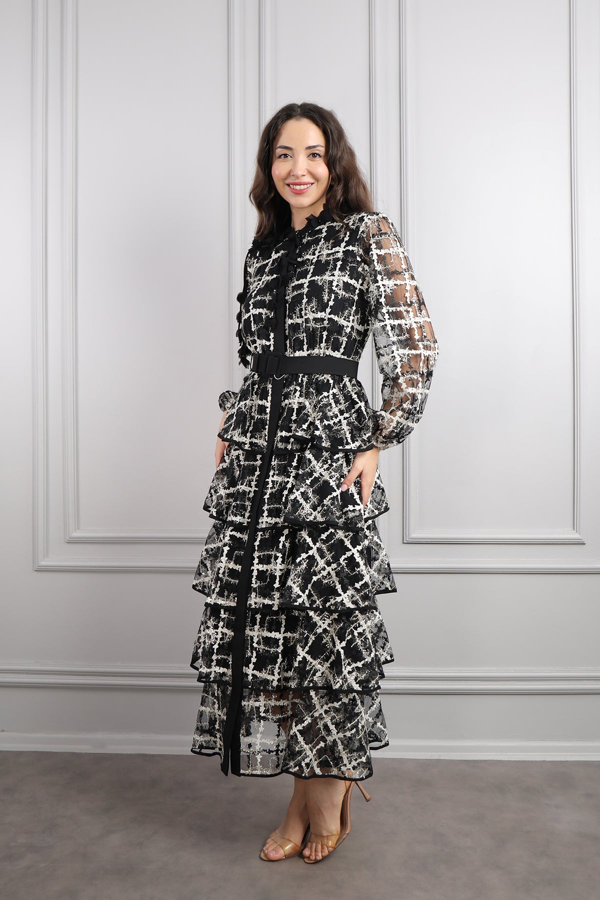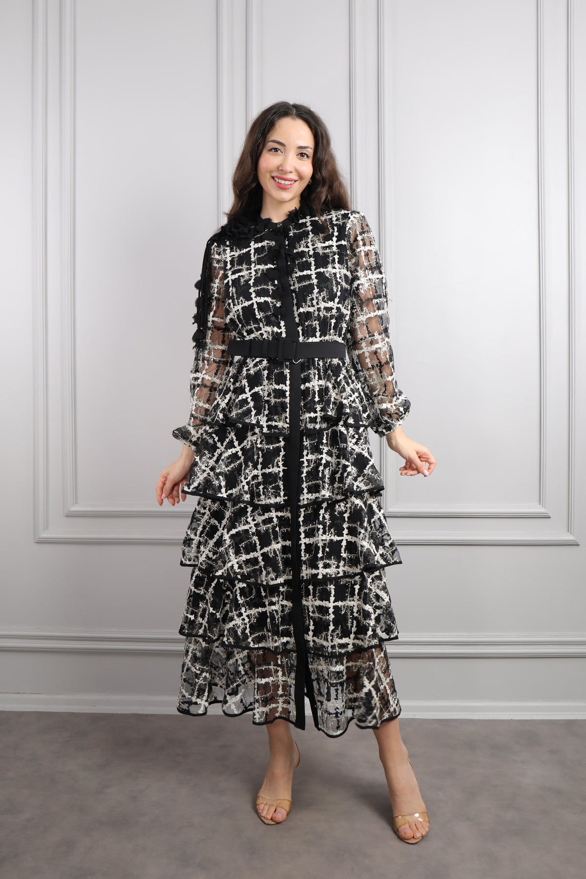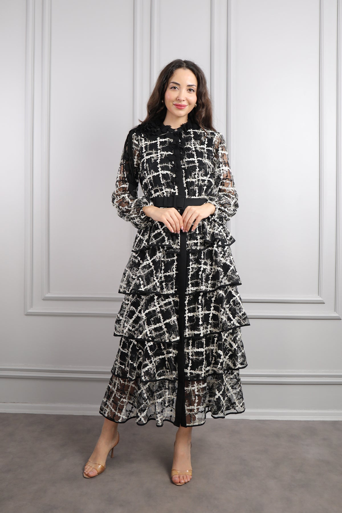 Zarafeti ve konforu bir arada sunan yakası çiçek detaylı, beli kemerli, eteği katlı büyük beden elbise, siyah-gri tonlarının asil uyumu, her mevsim kullanılabilir bir şıklık yaratırken, çiçek detaylı yaka tasarımı elbiseye romantik bir dokunuş katıyor. Kat kat tasarlanan etek bölümü, hareketli ve akıcı bir görünüm sunarak hem rahatlığı hem de feminen tarzı bir araya getirir. Hafif dökümlü kumaşı sayesinde gün boyu konforlu bir kullanım sağlar. Özel davetlerde, mezuniyetlerde veya akşam yemeklerinde rahatlıkla tercih edilebilecek bu model, büyük beden şıklığını modern çizgilerle buluşturuyor.