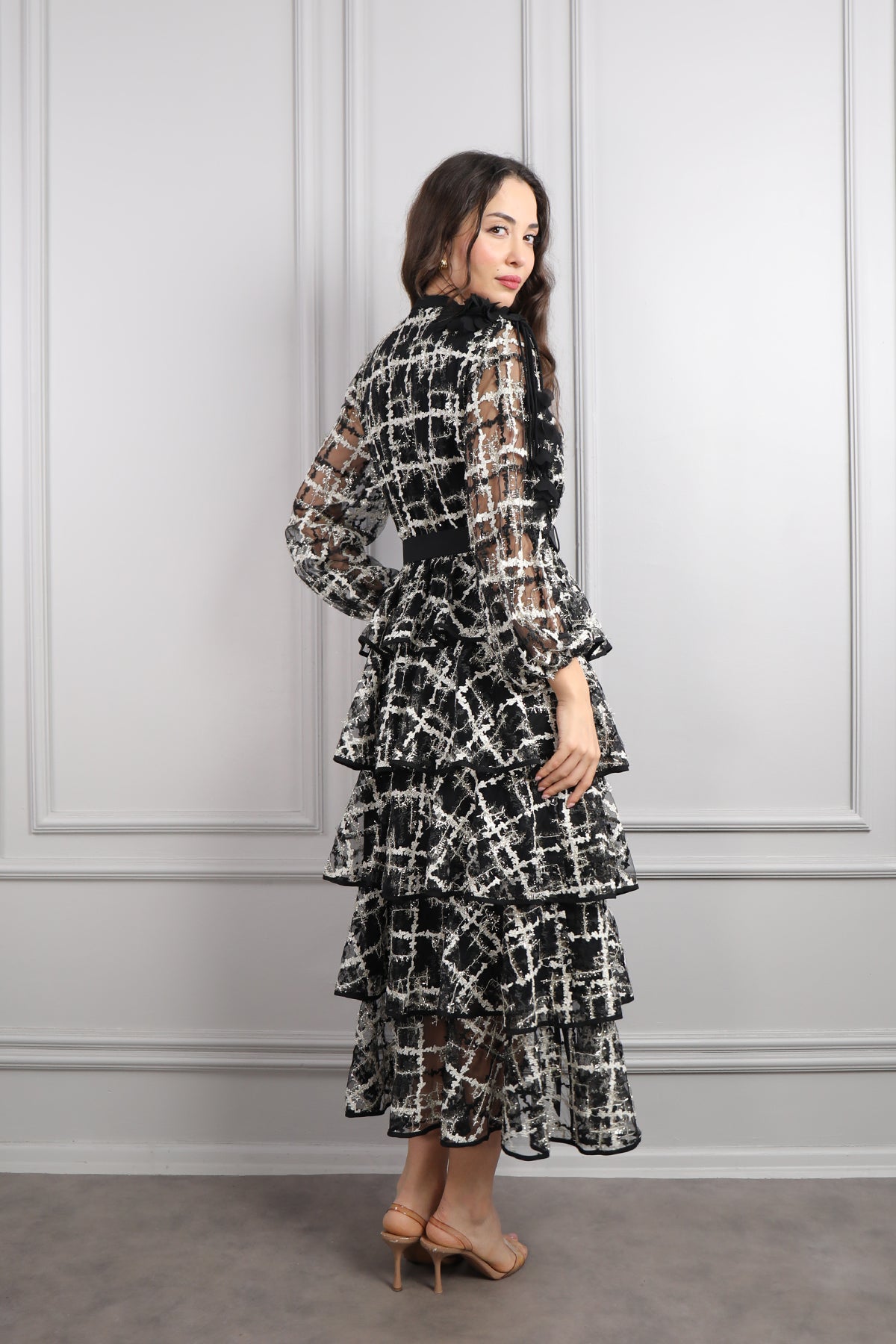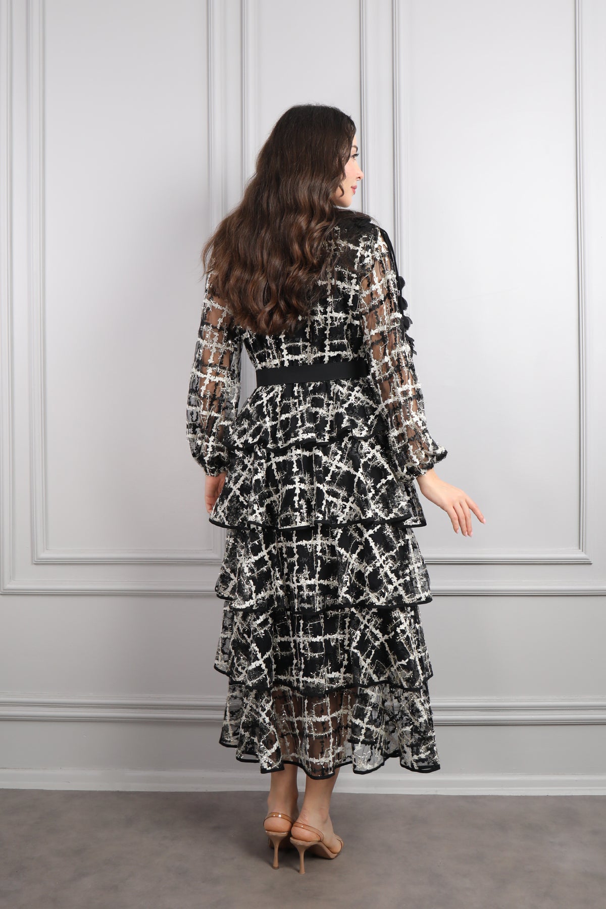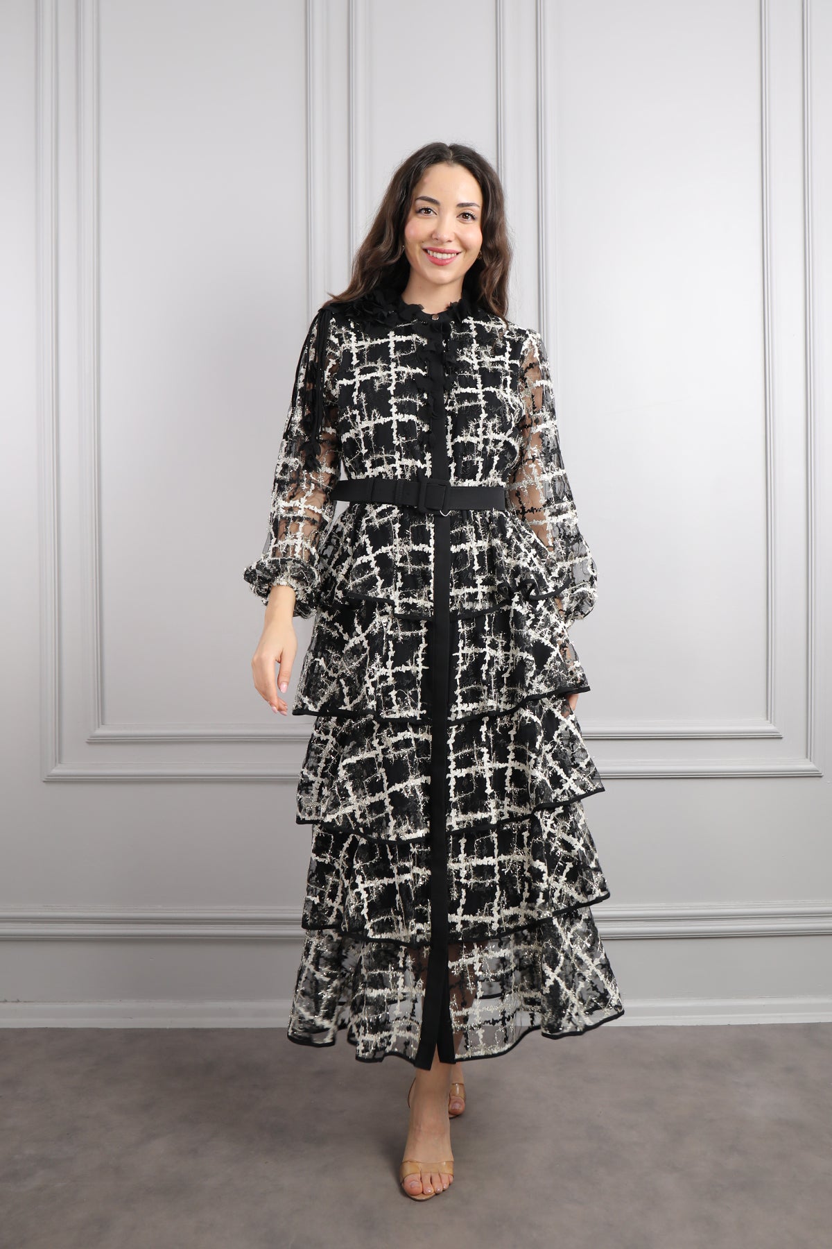 Zarafeti ve konforu bir arada sunan yakası çiçek detaylı, beli kemerli, eteği katlı büyük beden elbise, siyah-gri tonlarının asil uyumu, her mevsim kullanılabilir bir şıklık yaratırken, çiçek detaylı yaka tasarımı elbiseye romantik bir dokunuş katıyor. Kat kat tasarlanan etek bölümü, hareketli ve akıcı bir görünüm sunarak hem rahatlığı hem de feminen tarzı bir araya getirir. Hafif dökümlü kumaşı sayesinde gün boyu konforlu bir kullanım sağlar. Özel davetlerde, mezuniyetlerde veya akşam yemeklerinde rahatlıkla tercih edilebilecek bu model, büyük beden şıklığını modern çizgilerle buluşturuyor.