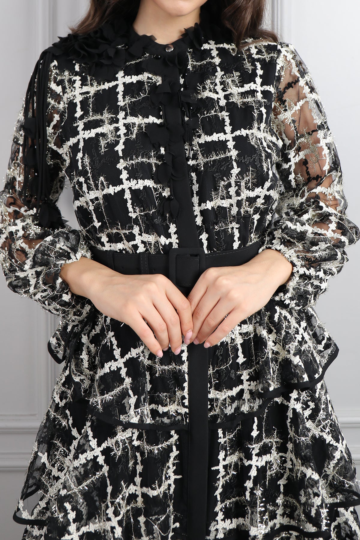 Yakası Çiçek Detaylı Beli Kemerli Eteği Katlı Büyük Beden Elbise Siyah-Gri Özellikleri